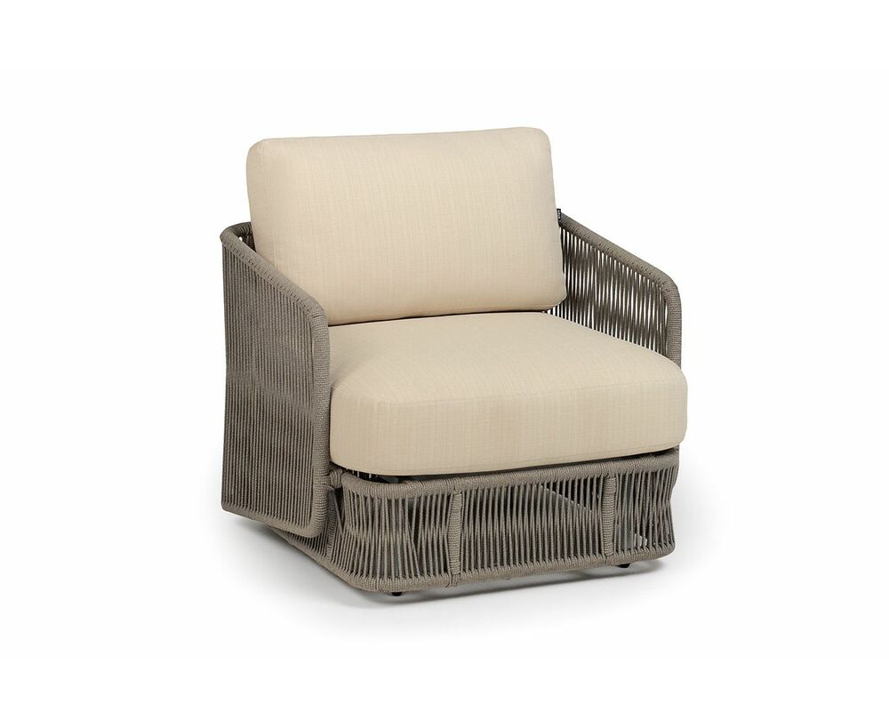 Каркас кресла изготовлен из прочного алюминиевого сплава и окрашен в светло-серый (RAL7035) цвет, который предотвращает возникновение коррозии и обеспечивает долгий срок службы. На боковинах кресла выполнена оплетка из роупа цвета серый меланж. Такое плетение обладает высокой стойкостью к износу и долговечностью, сохраняя свои свойства даже при активном использовании.