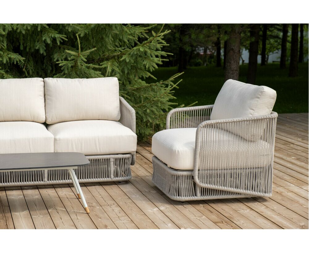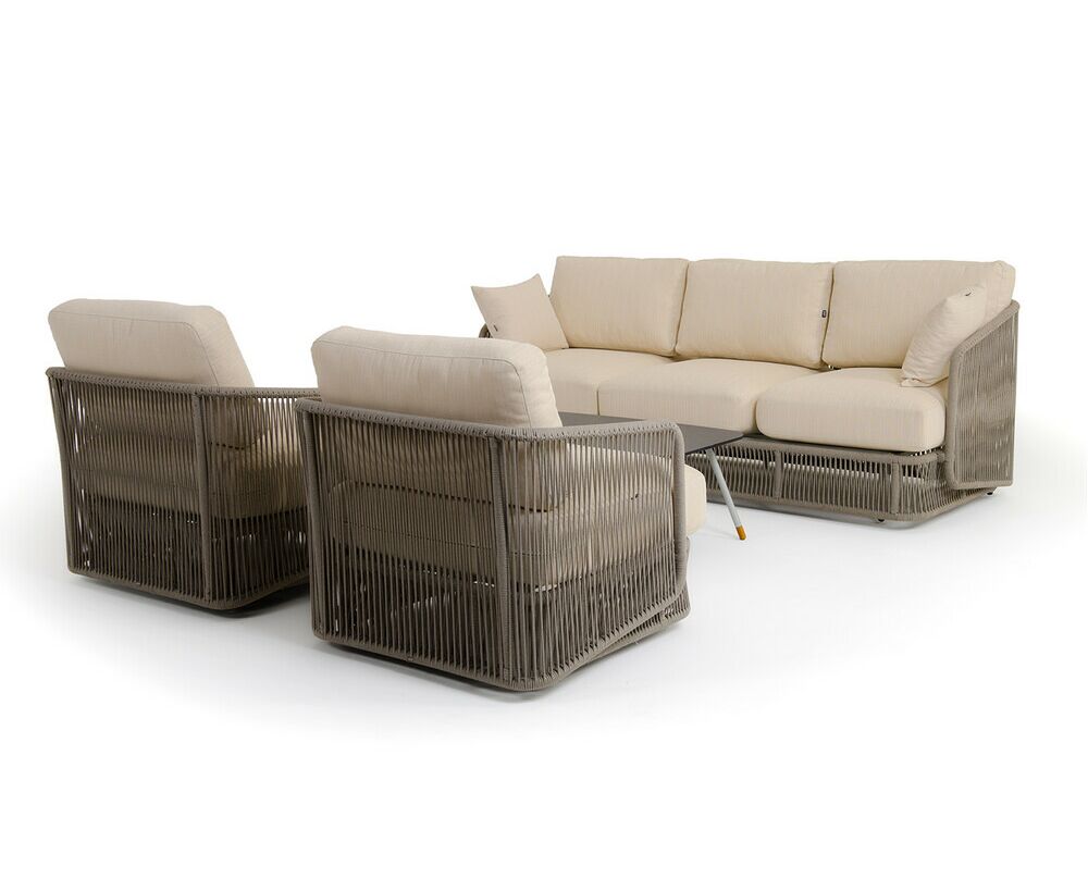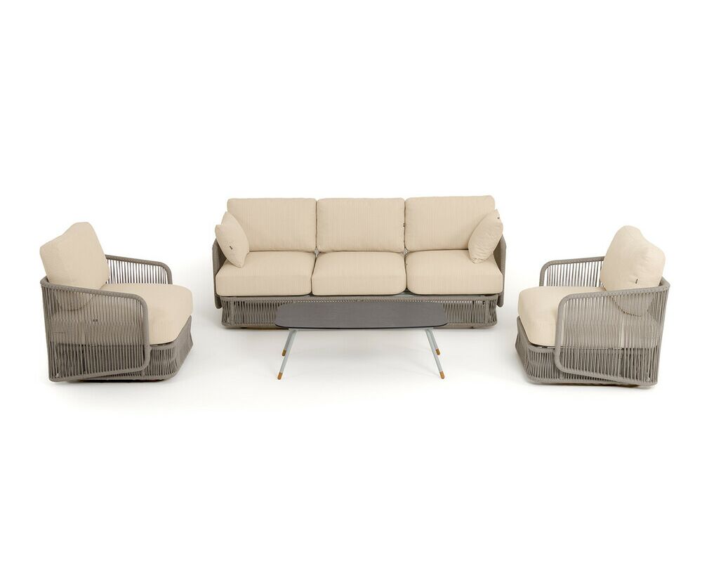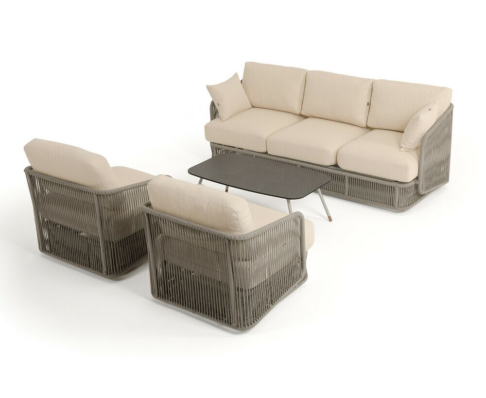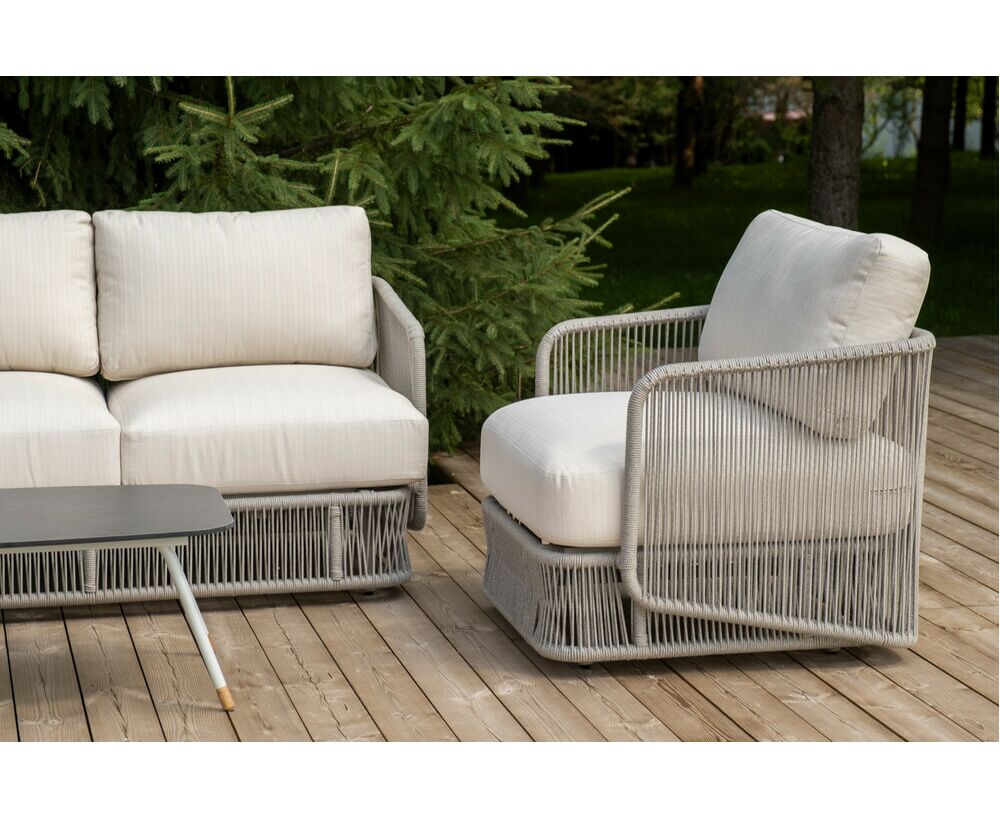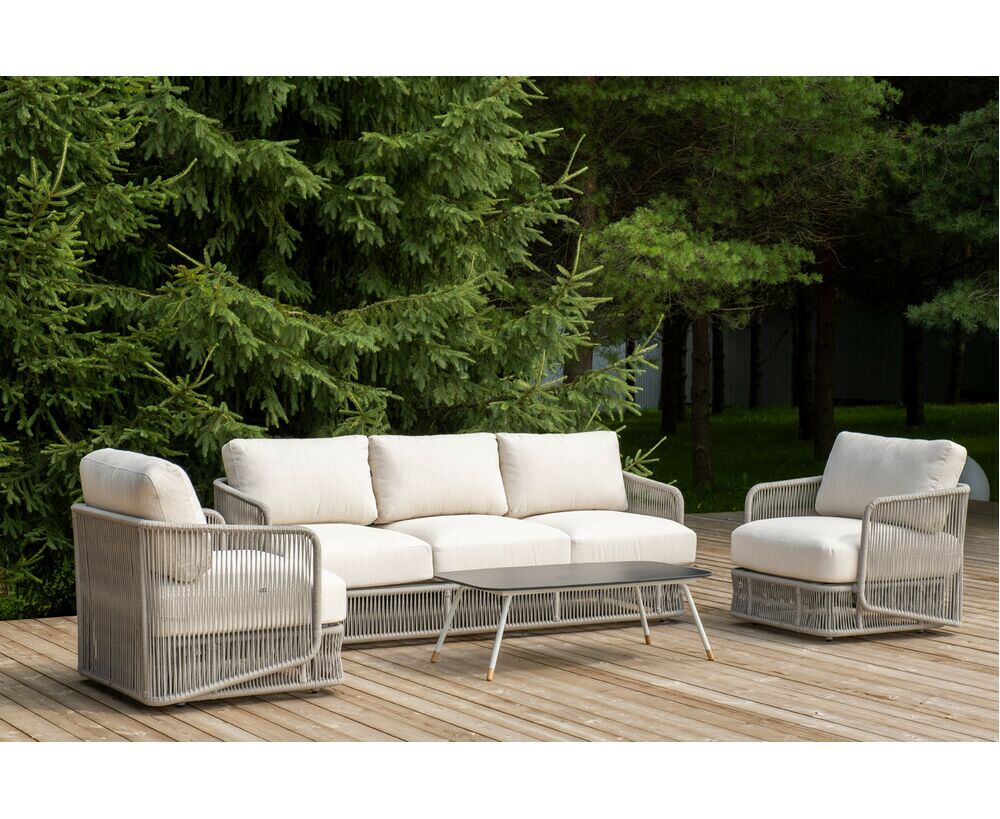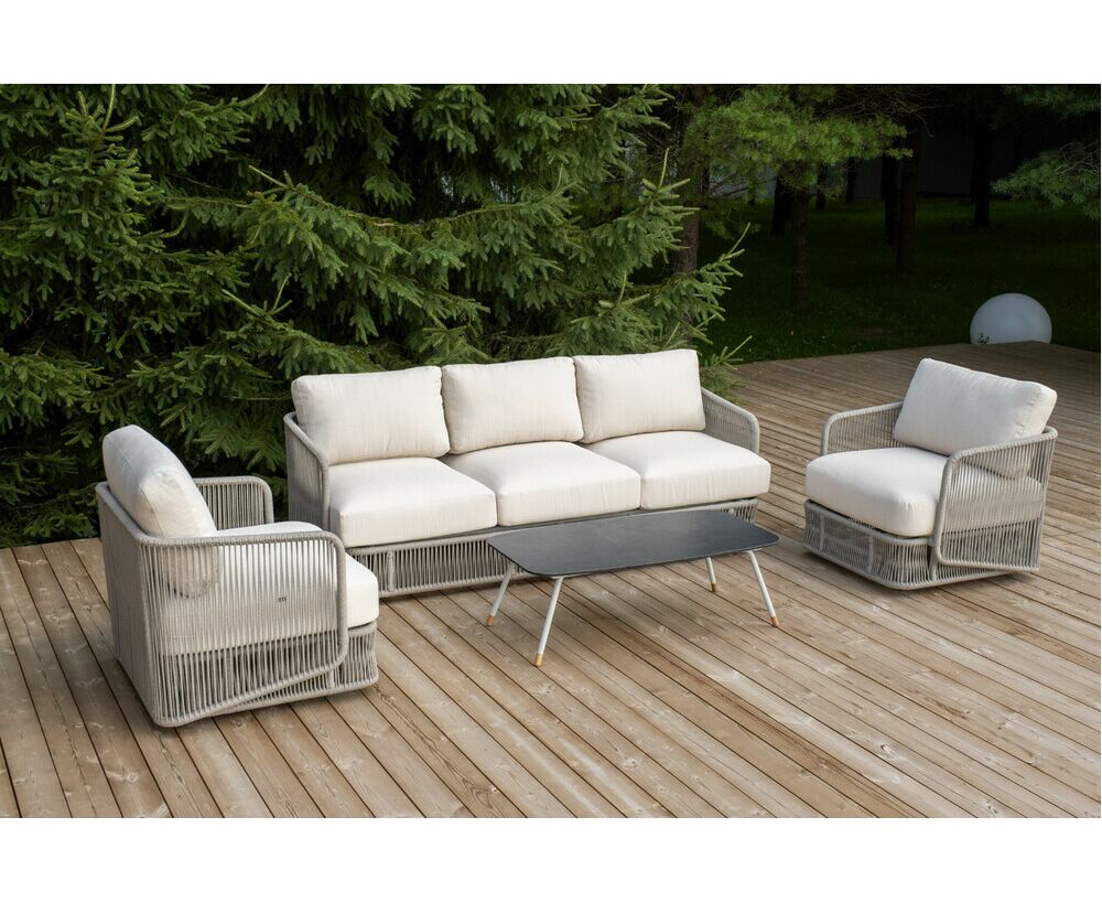 "Альбано" диван 3-местный плетеный из роупа, каркас алюминий светло-серый (RAL7035) муар, роуп серый меланж круглый, ткань Mossle светло-бежевая 1шт. 2 320Х865Х780, "Альбано" кресло плетеное из роупа, каркас алюминий светло-серый (RAL7035) муар, роуп серый меланж круглый, ткань Mossle светло-бежевая 2шт. 920Х865Х750, "Верона" журнальный стол из HPL 120х65, H40, каркас светло-серый (RA L7035) муар, цвет столешницы "серый гранит" 1шт. 1 200Х650Х400,