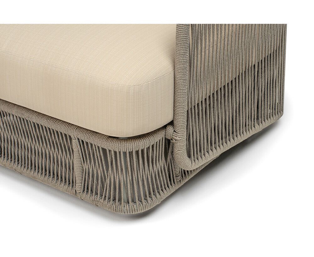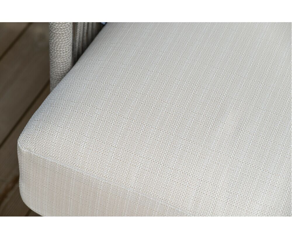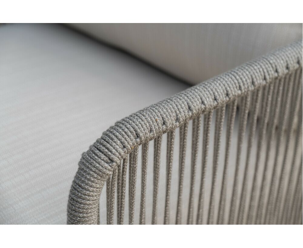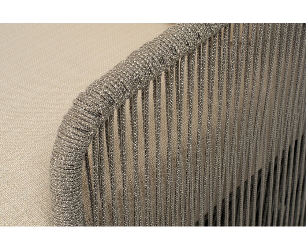 Каркас уличной мебели выполнен из износостойкого алюминия. Его дополняет бежевая ручная оплетка, изготовленная на основе эластичных синтетических лент из полиэфирных волокон высокой прочности (роупа).