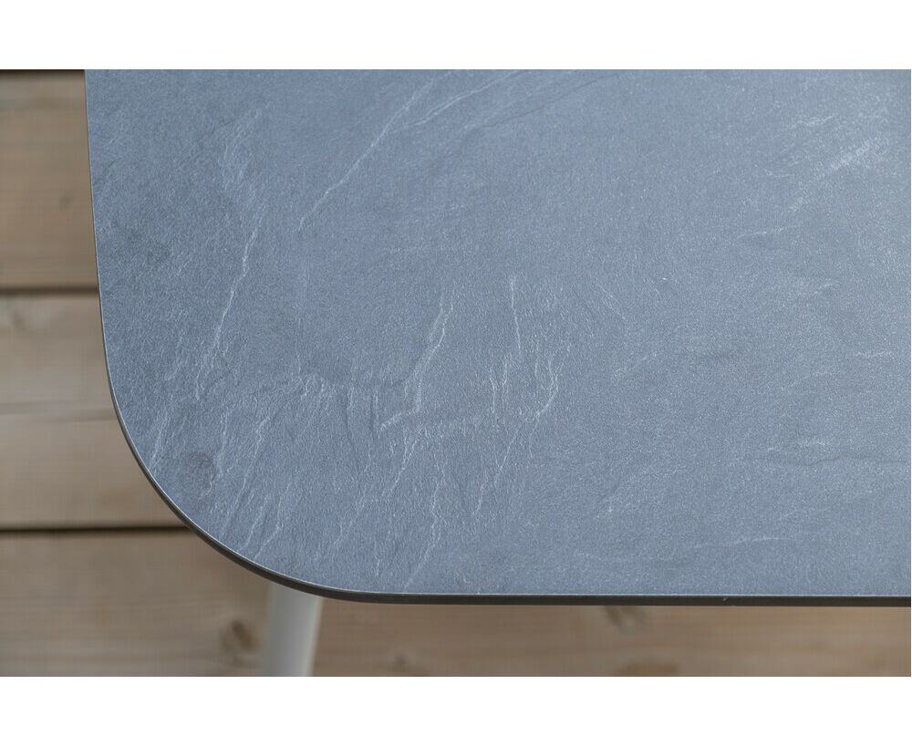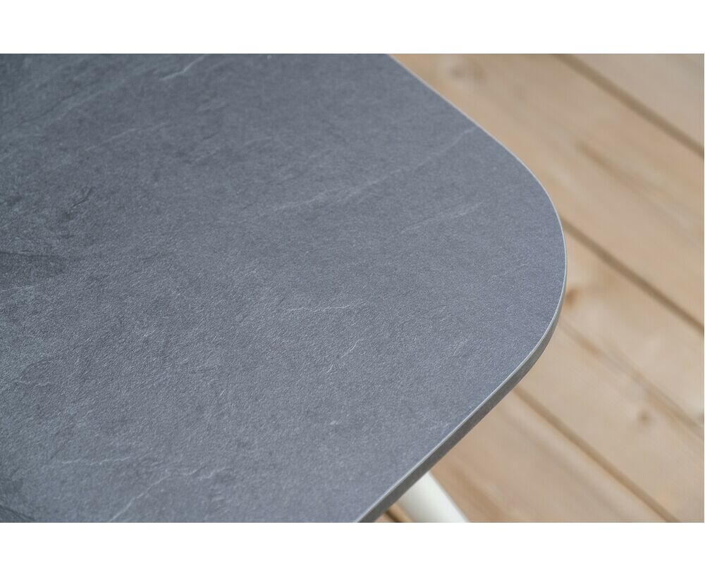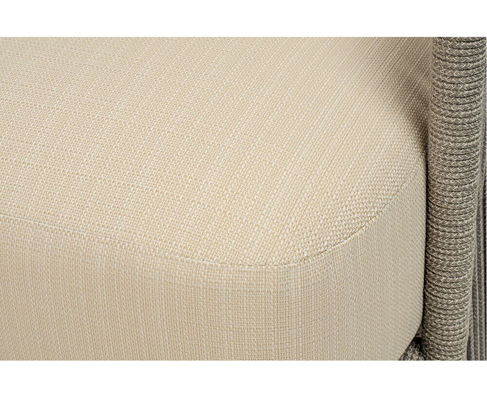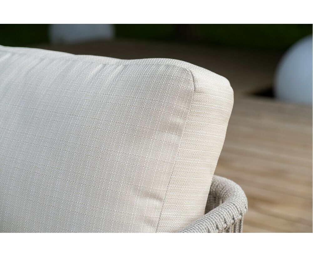 Каркас уличной мебели выполнен из износостойкого алюминия. Его дополняет бежевая ручная оплетка, изготовленная на основе эластичных синтетических лент из полиэфирных волокон высокой прочности (роупа).