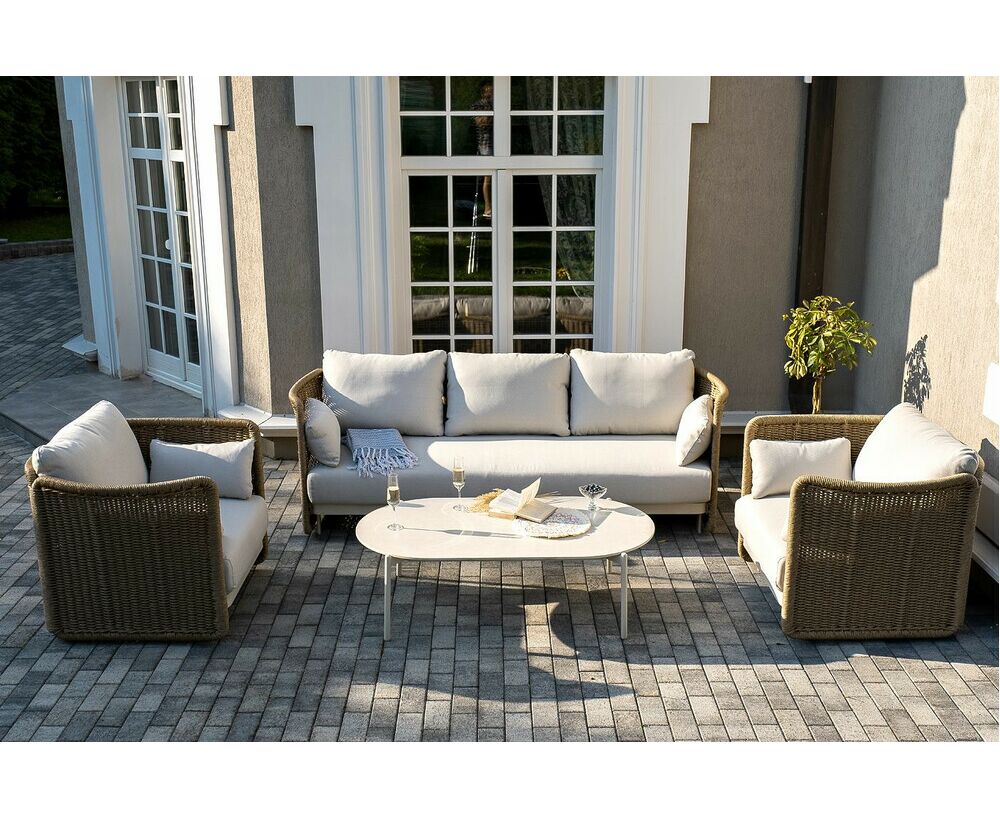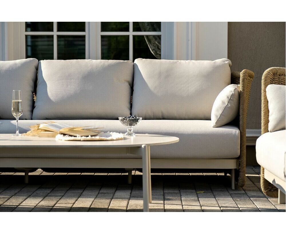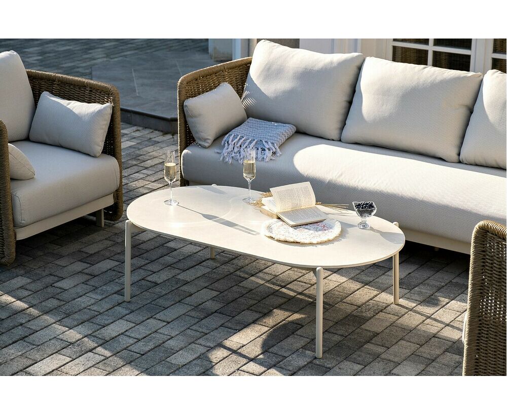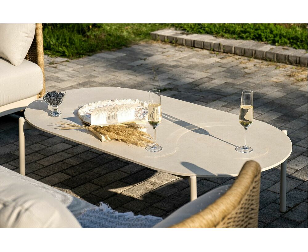 Журнальный столик выполнен из алюминия, окрашенного износостойкой краской, а его оплетка выполнена из круглого искусственного ротанга ручного плетения - 7 мм соломенного цвета. Столешница - овальная, выполнена из искусственного камня белового цвета.