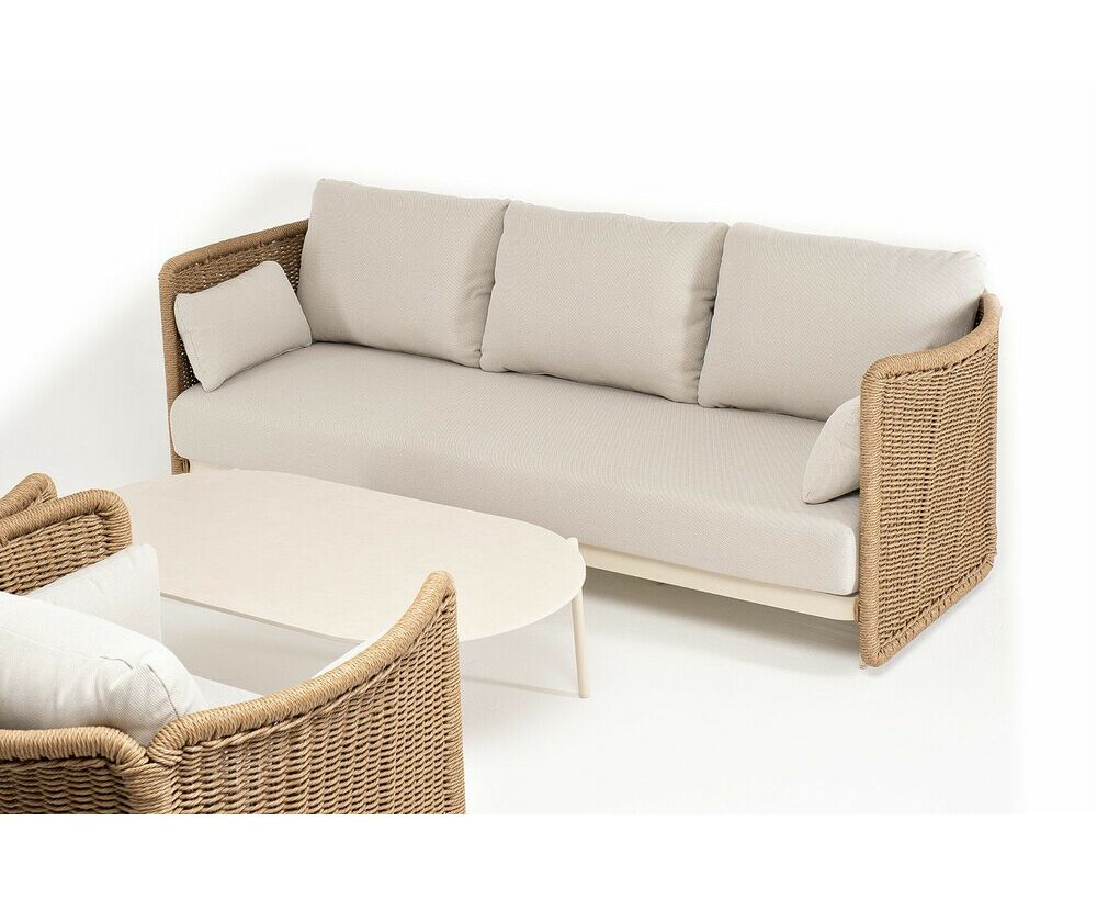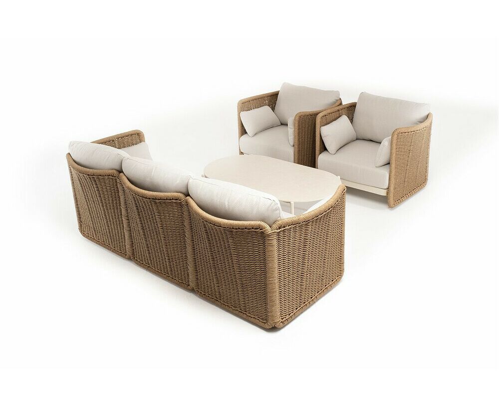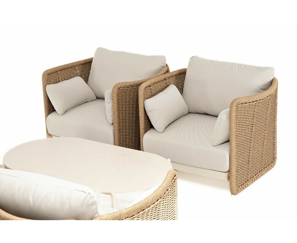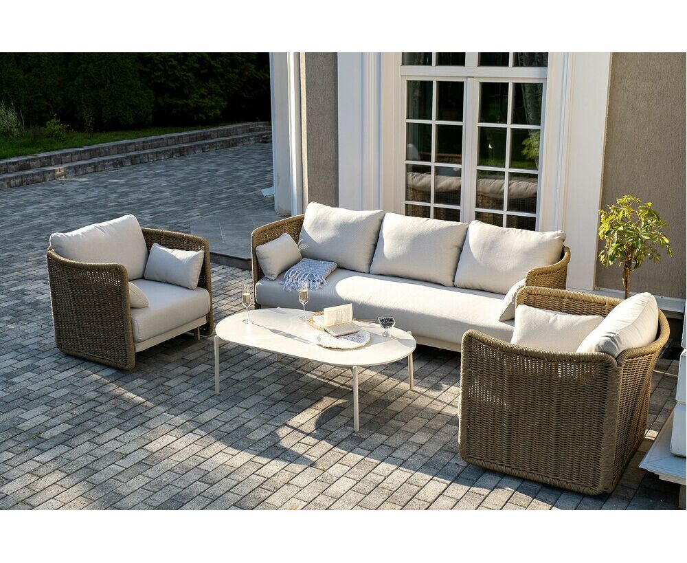Журнальный столик выполнен из алюминия, окрашенного износостойкой краской, а его оплетка выполнена из круглого искусственного ротанга ручного плетения - 7 мм соломенного цвета. Столешница - овальная, выполнена из искусственного камня белового цвета.