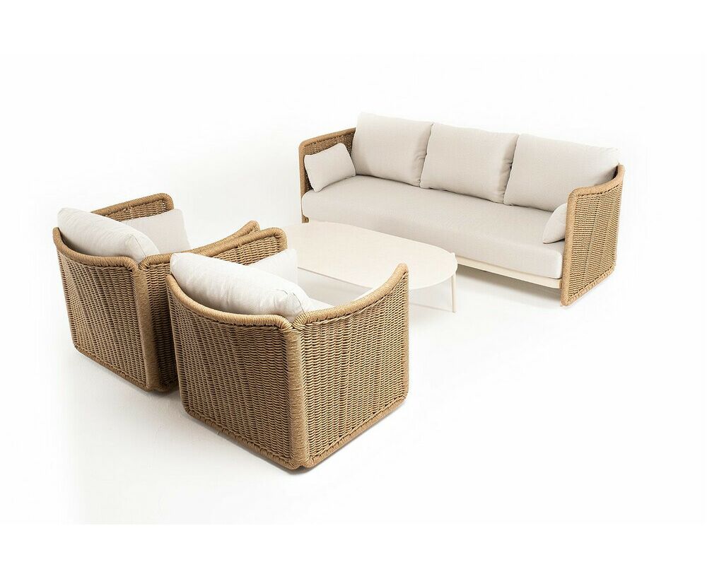 Плетеная мебель дополнена удобными подушками в бежевых чехлах. При их изготовлении используют полиэстер, плотность – 300гр/м2. Он обрабатывается влагоотталкивающей пропиткой для повышения защитных свойств материала. "Аликанте" диван из искусственного ротанга трехместный, цвет соломенный 1шт. 2 300Х865Х730, "Аликанте" кресло из искусственного ротанга, цвет соломенный 2шт. 960Х865Х730, "Аликанте" журнальный столик из искусственного ротанга, цвет соломенный 1шт. 1 300Х700Х380,