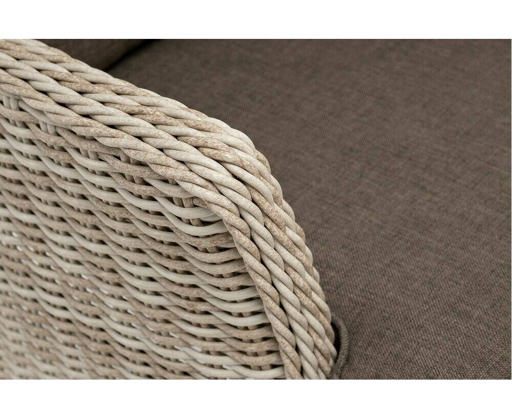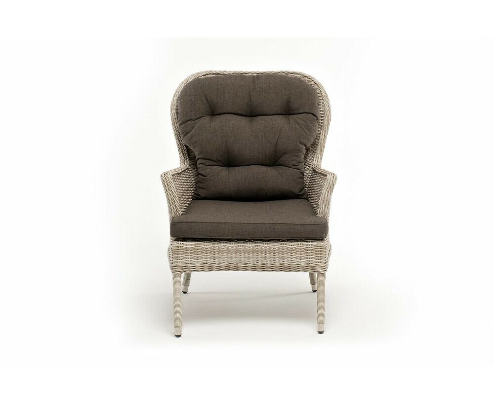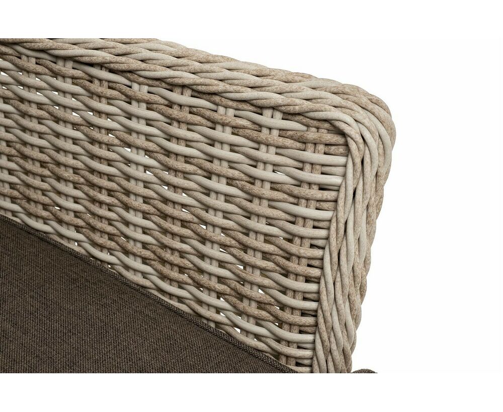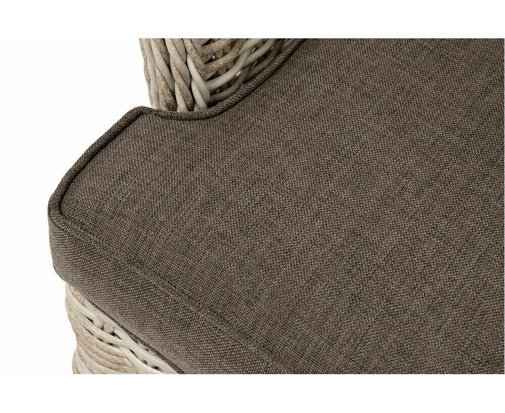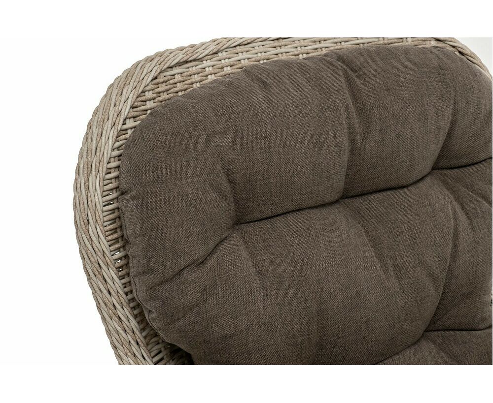 В садовое кресло укомплектовывается мягкими подушками. Они пошиты из износостойкого полиэстера серо-коричневого оттенка с плотностью 230гр/м2. Защитные свойства синтетического материала усиливаются благодаря влагоотталкивающей пропитке.