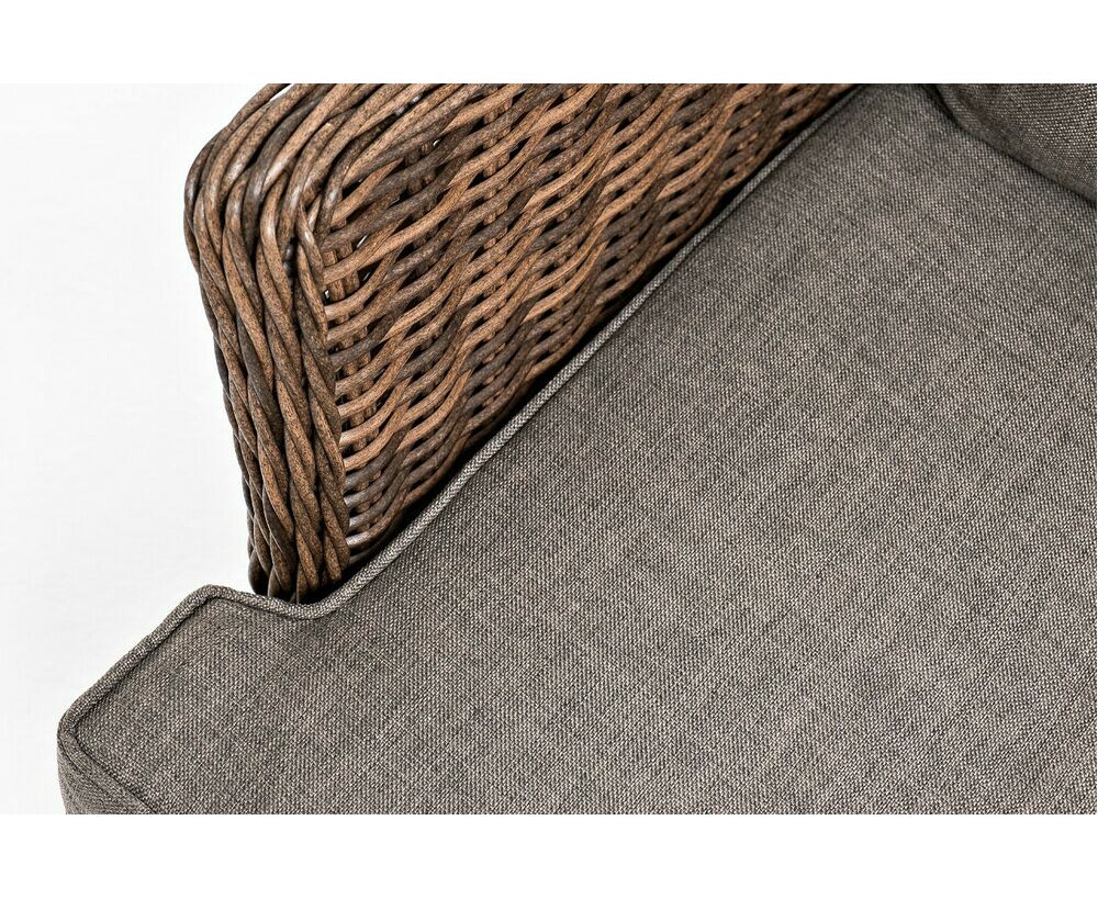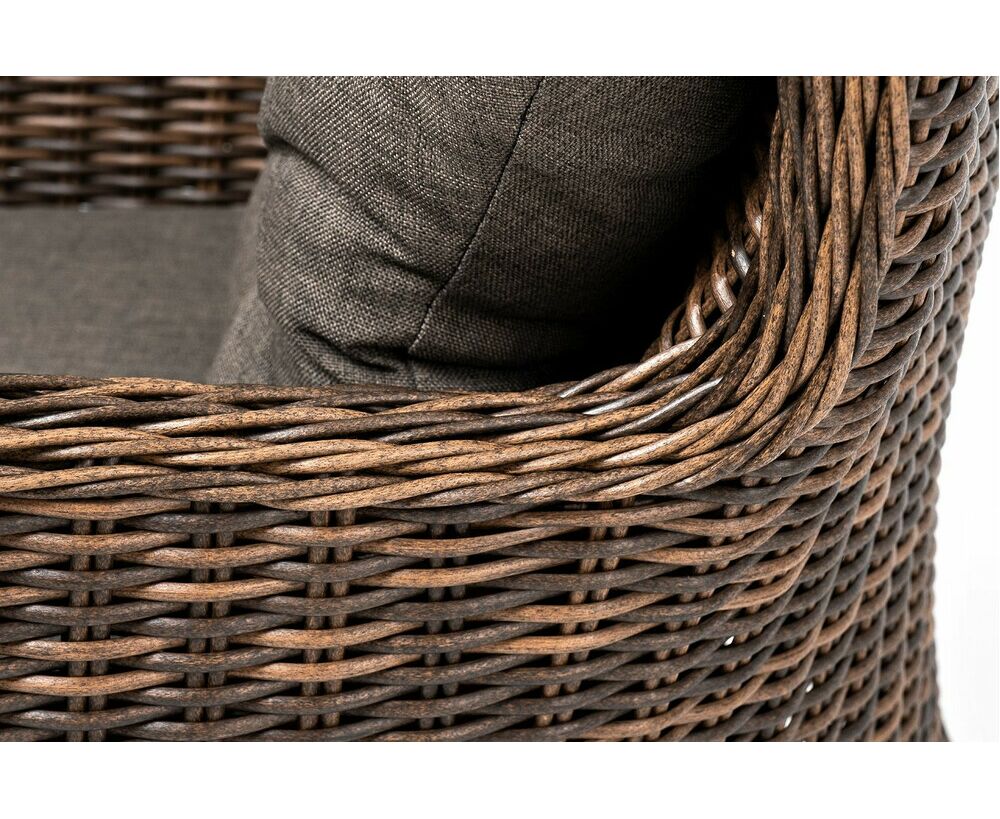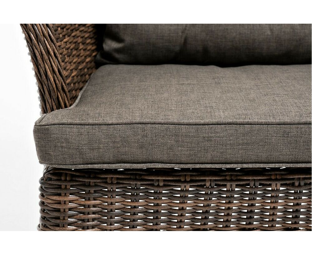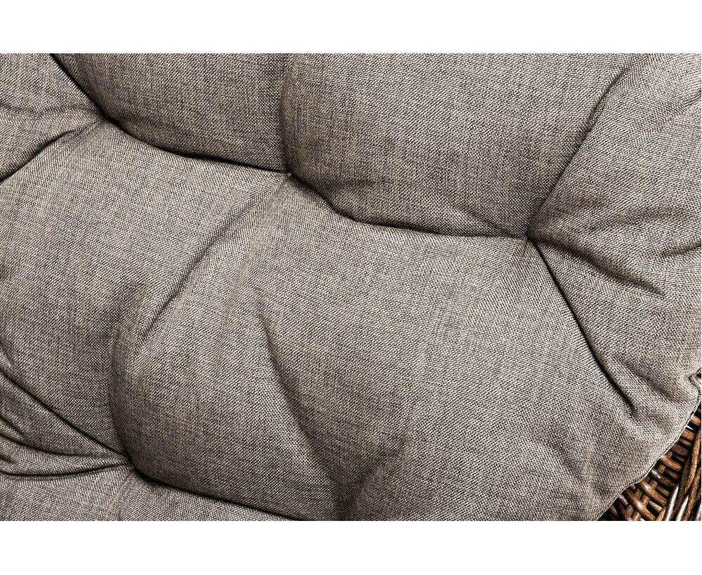 В садовое кресло укомплектовывается мягкими подушками. Они пошиты из износостойкого полиэстера серо-коричневого оттенка с плотностью 230гр/м2. Защитные свойства синтетического материала усиливаются благодаря влагоотталкивающей пропитке.