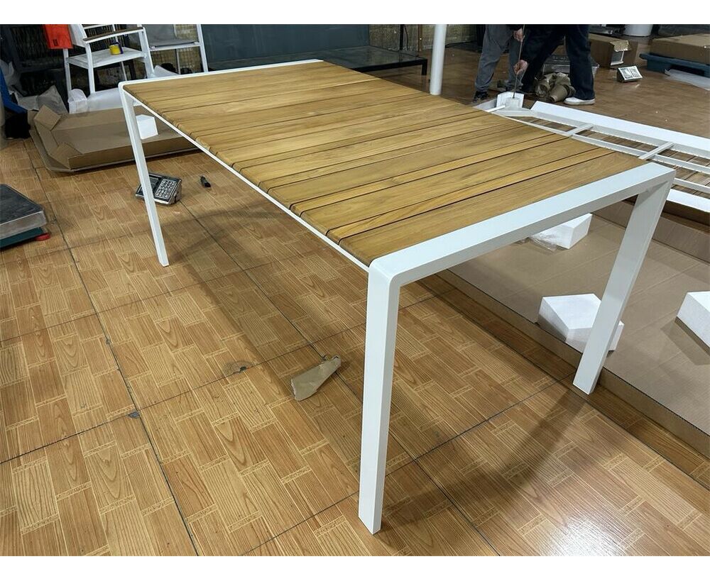 Обеденный стол «Альпы» с тиковой столешницей и алюминиевым каркасом — сочетание природной эстетики и современных инженерных решений.