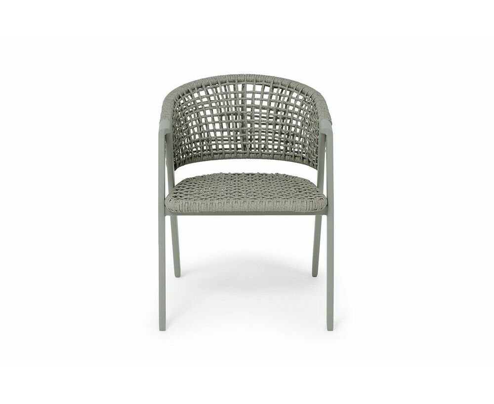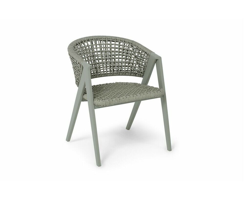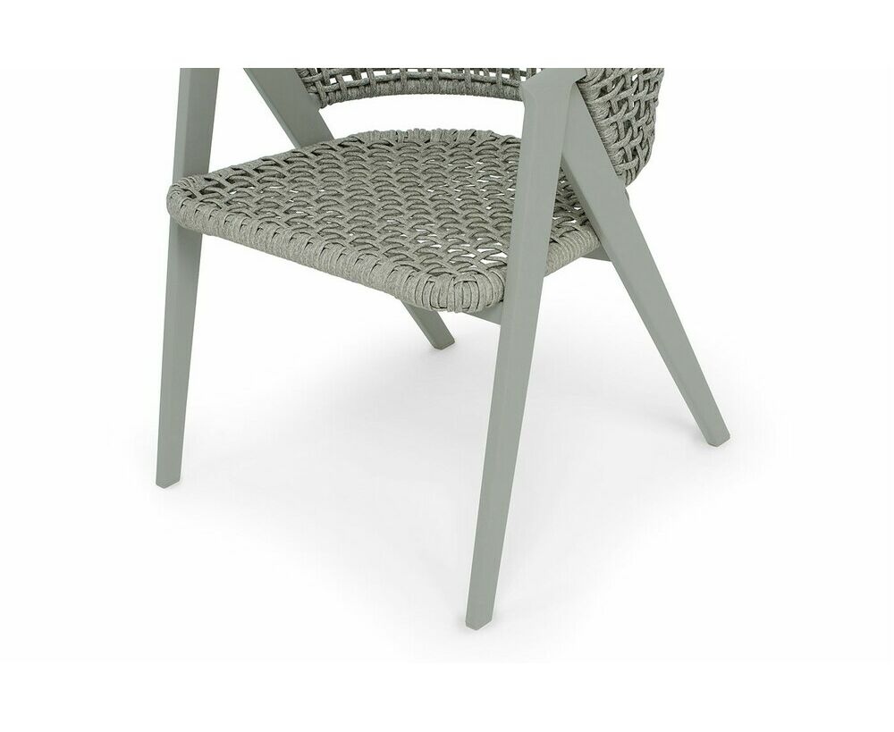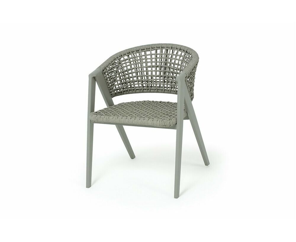 Изготовлен из алюминиевого каркаса, оплетенного вручную эластичными синтетическими лентами из высокопрочных полиэфирных волокон. Роуп является гипоаллергенным, прочным, износостойким и устойчивым к ультрафиолету. Приятный на ощупь и напоминает шерстяное плетение. Цвет каркаса и оплетки – серый. На ножках стула идут серые пластиковые наконечники (заглушки).