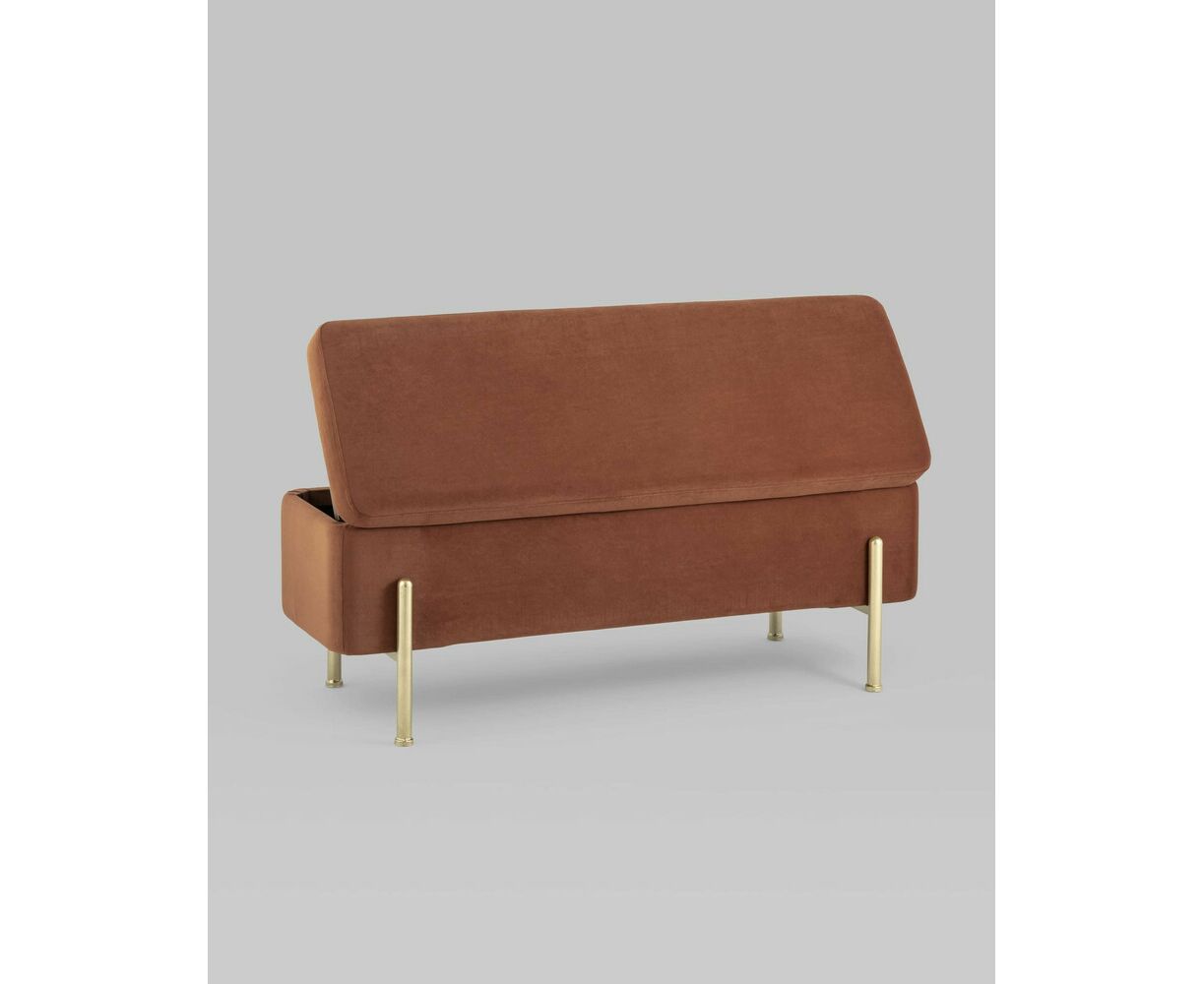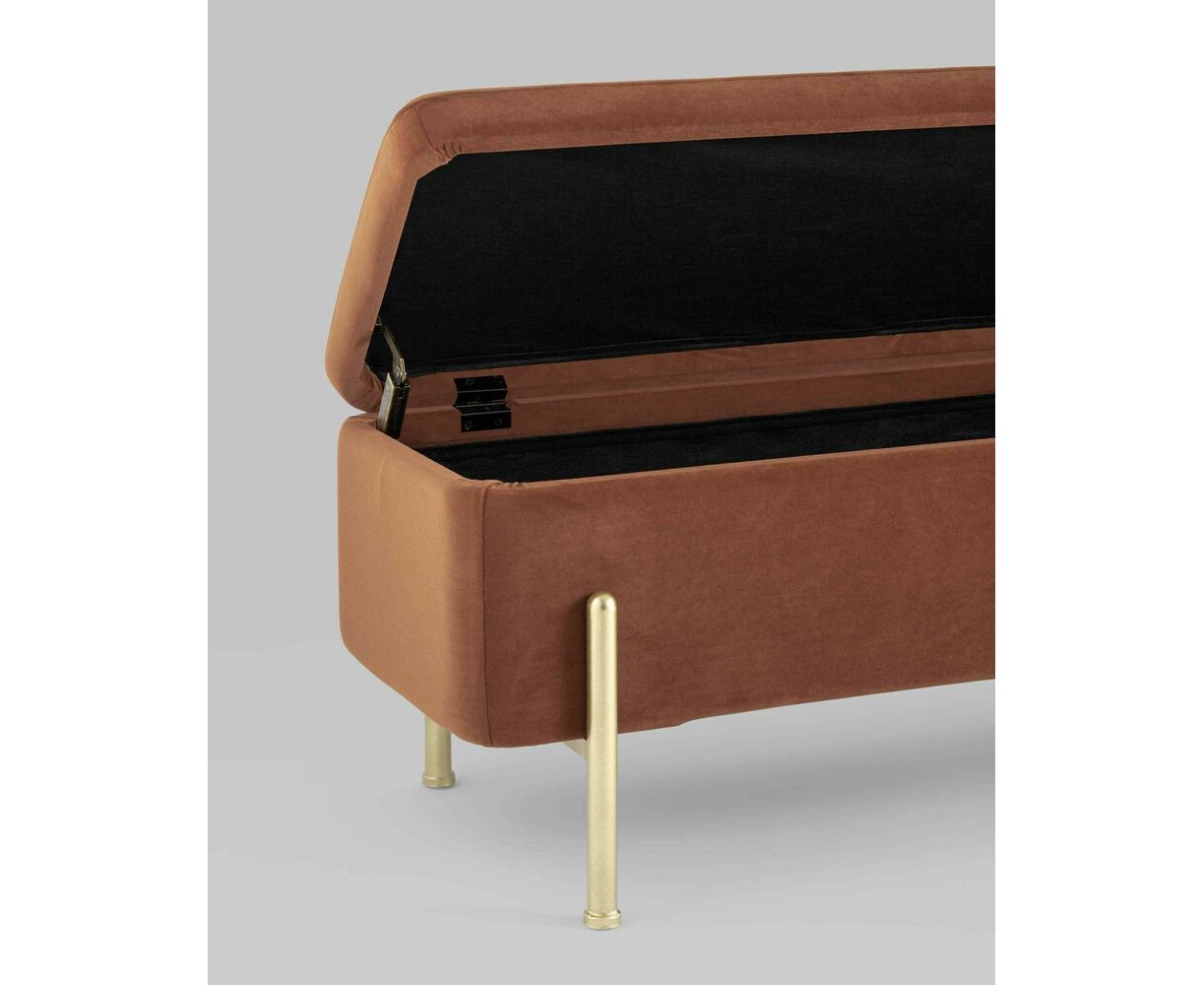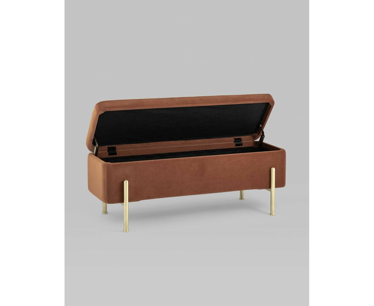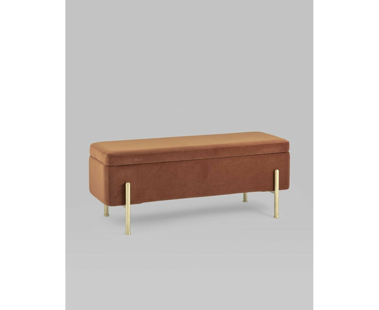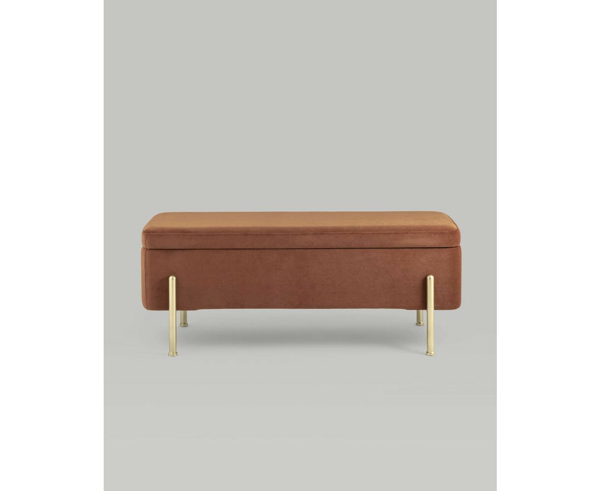 Стильная модель банкетки в обивке из мягкого велюра, прекрасно дополнит интерьер спальни или прихожей. Изящные ножки выполнены из металла в золотом цвете. Под сидением имеется ящик для хранения необходимых вещей. На ножках предусмотрены мягкие накладки, которые предотвращают повреждения напольного покрытия.