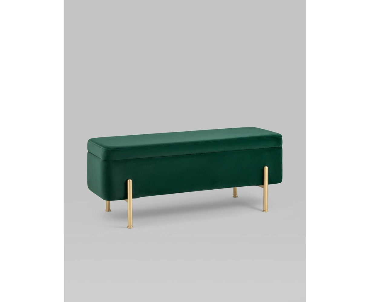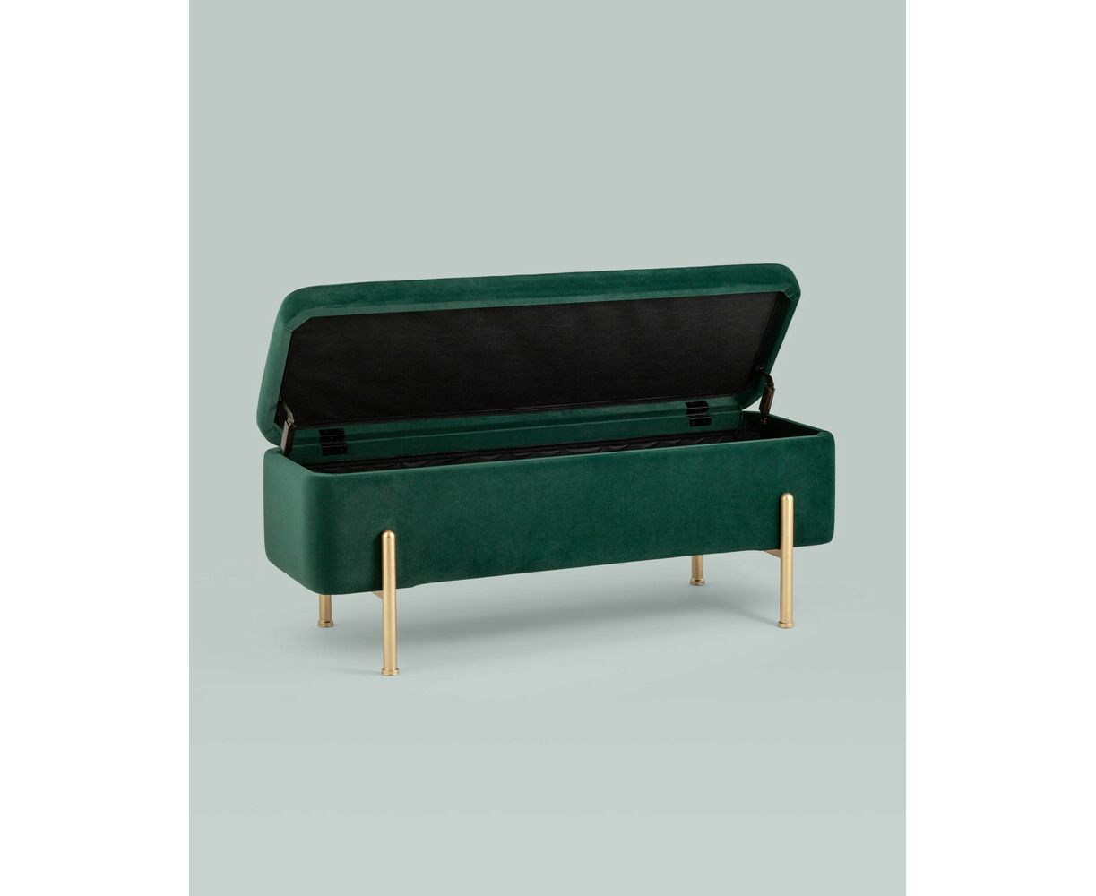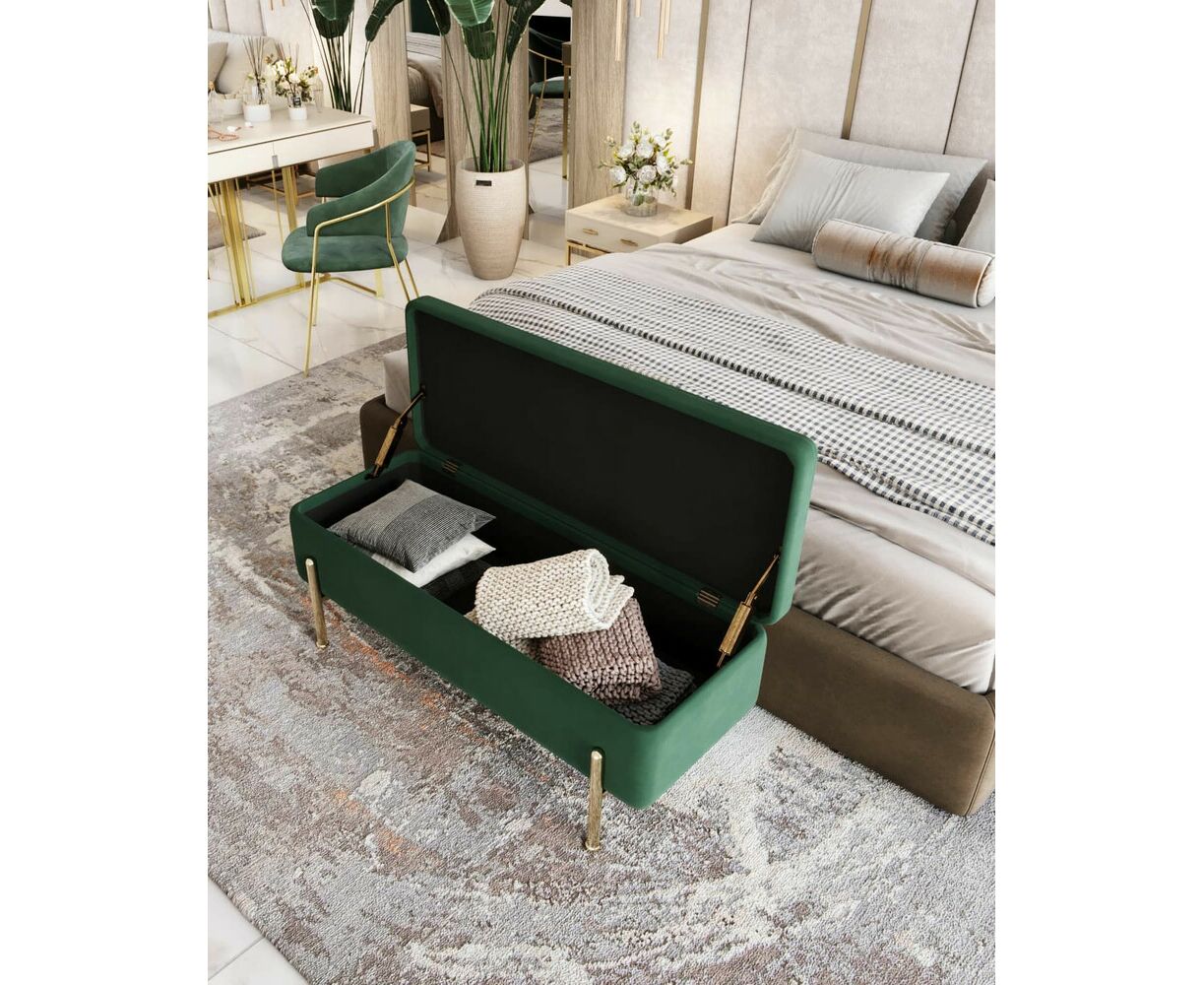 Стильная модель банкетки в обивке из мягкого велюра, прекрасно дополнит интерьер спальни или прихожей. Изящные ножки выполнены из металла в золотом цвете. Под сидением имеется ящик для хранения необходимых вещей. На ножках предусмотрены мягкие накладки, которые предотвращают повреждения напольного покрытия.
