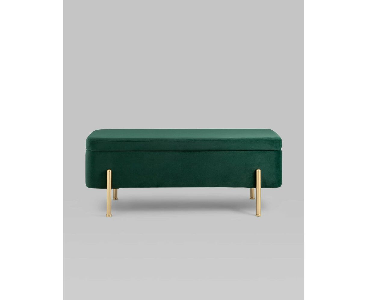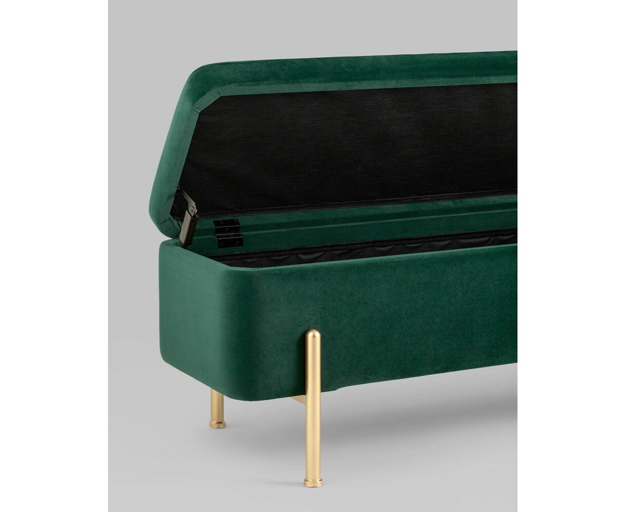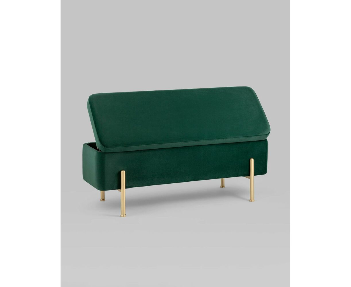 Стильная модель банкетки в обивке из мягкого велюра, прекрасно дополнит интерьер спальни или прихожей. Изящные ножки выполнены из металла в золотом цвете. Под сидением имеется ящик для хранения необходимых вещей. На ножках предусмотрены мягкие накладки, которые предотвращают повреждения напольного покрытия.
