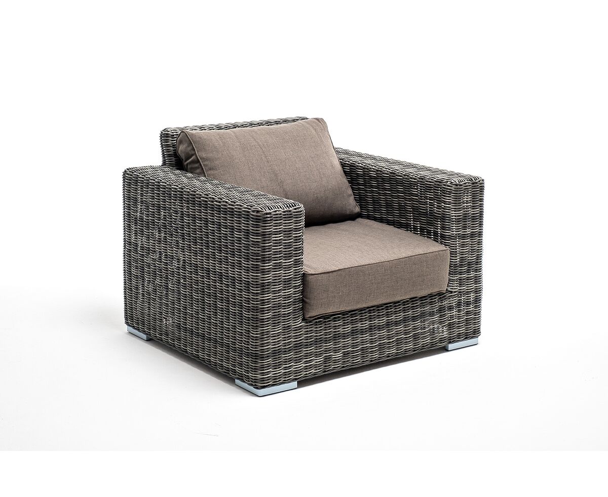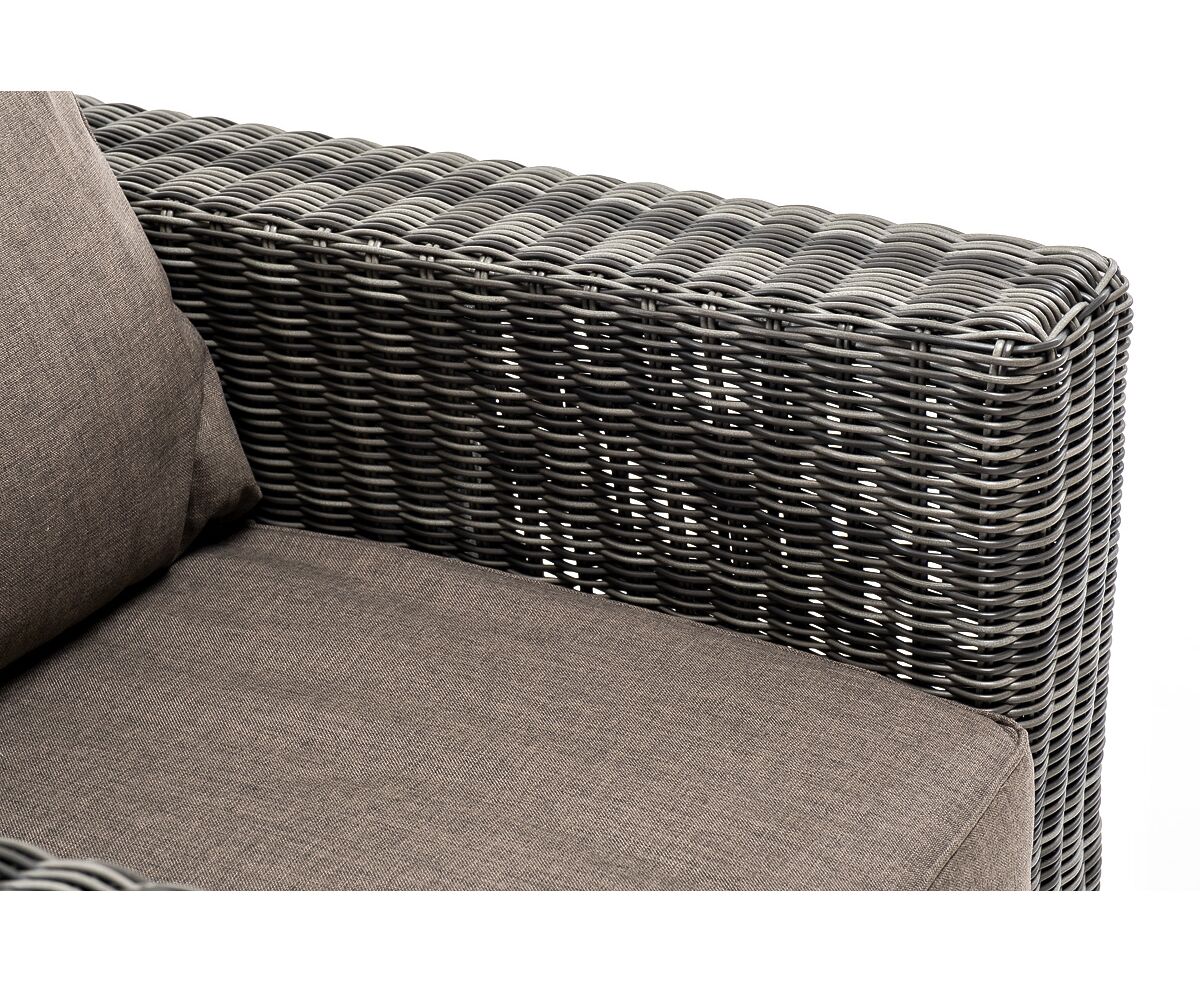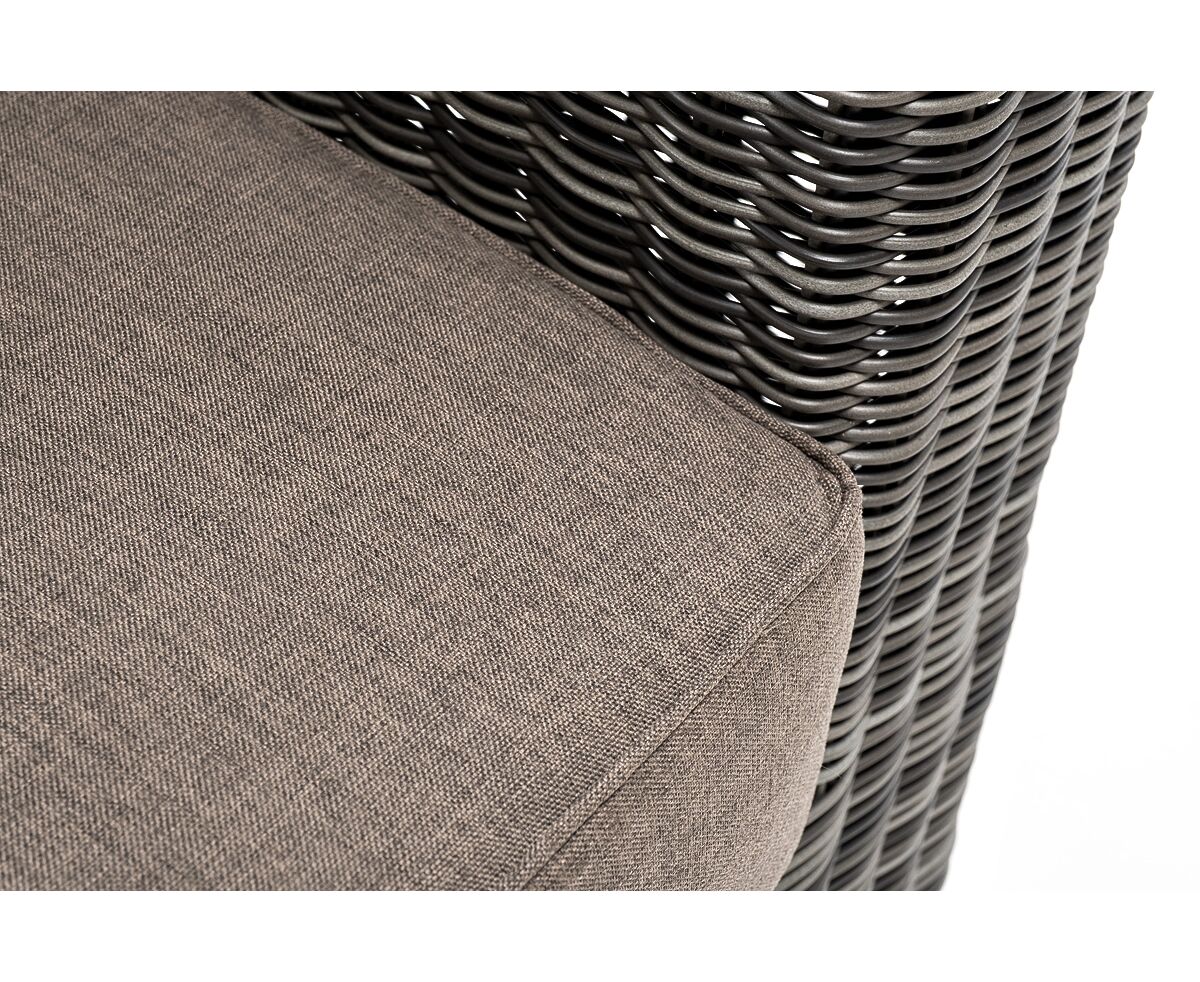 Кресло оснащено каркасом из прочного алюминия, ручное круглое плетение является основным декоративным элементом мебели. Оно выполнено из искусственного ротанга в графитовом цвете.