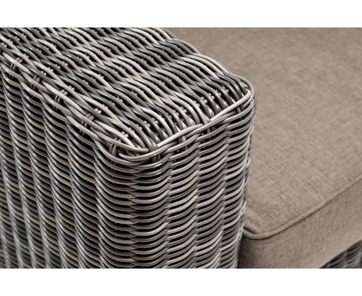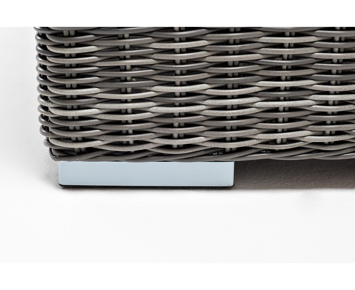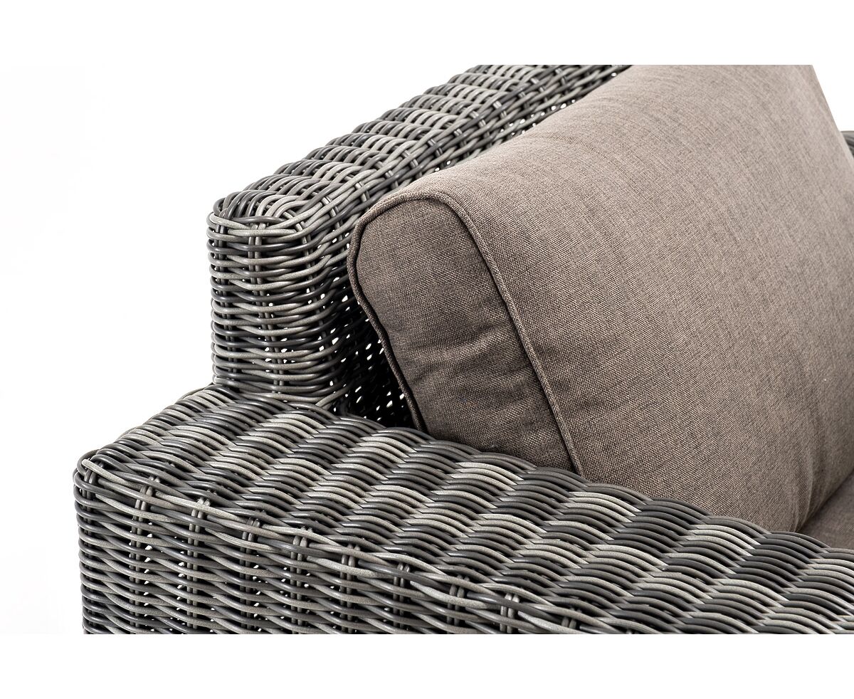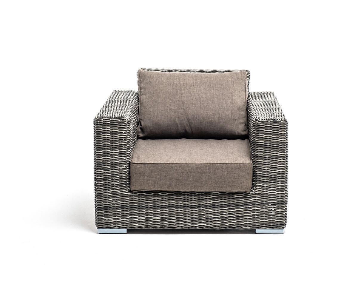 Кресло оснащено каркасом из прочного алюминия, ручное круглое плетение является основным декоративным элементом мебели. Оно выполнено из искусственного ротанга в графитовом цвете.