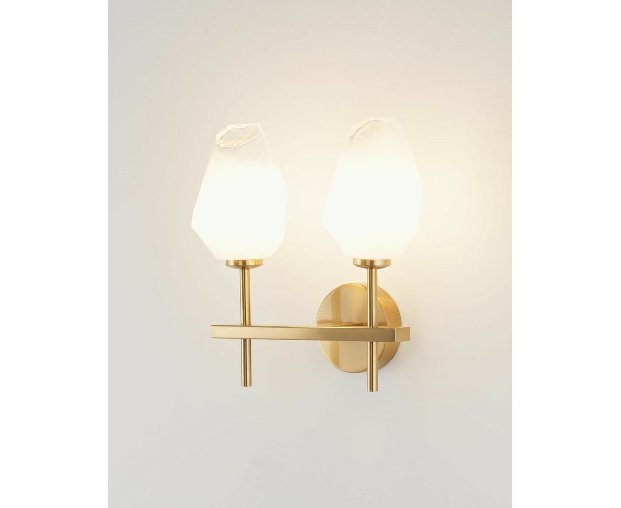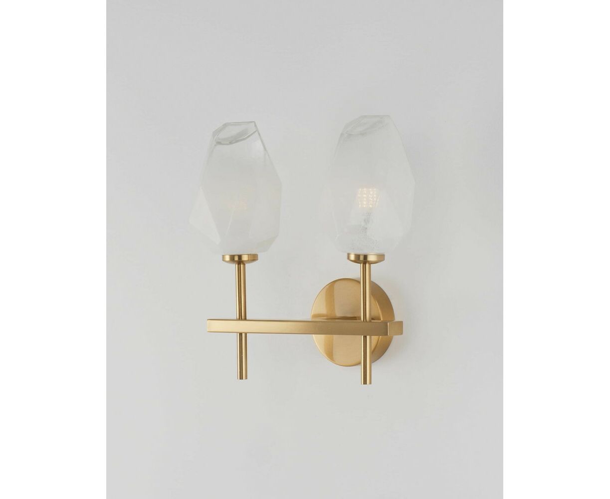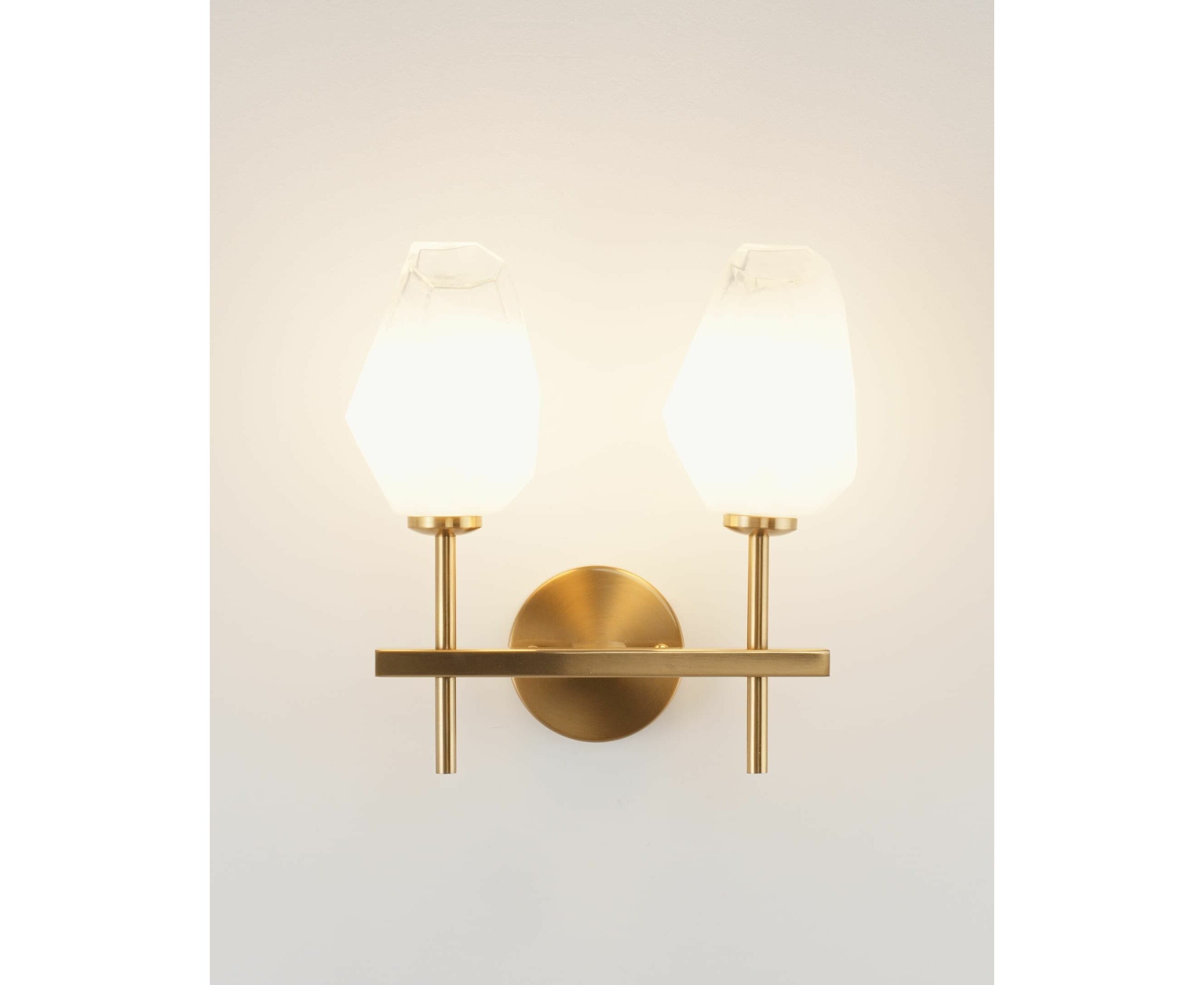 Оригинальное настенное бра из коллекции Catris. Необычные стеклянные плафоны в форме кристалла помогут создать мягкое и рассеянное освещение в комнате. В качестве источника света подойдут лампы с цоколем G9. Металлический каркас латунного цвета дополняет дизайн бра и надежно крепится к стене с помощью планки. Эффектный внешний вид светильника дополнит любой интерьер спальни, зала или гостиной.