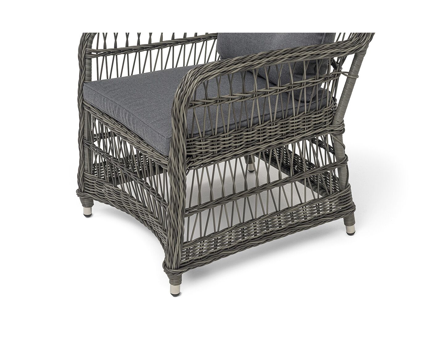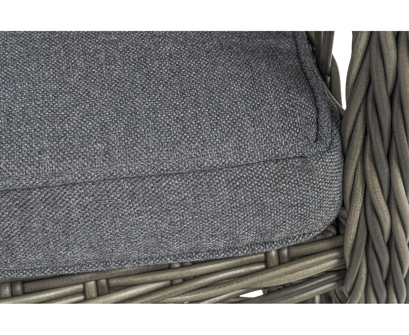Садовое кресло располагает двумя мягкими подушками, которые идут в комплекте. Они выполнены в сером цвете. Полиэстер высокого качества используется при пошиве тканевых изделий. Его плотность 300гр/м2. Ткань обрабатывается влагоотталкивающей пропиткой.