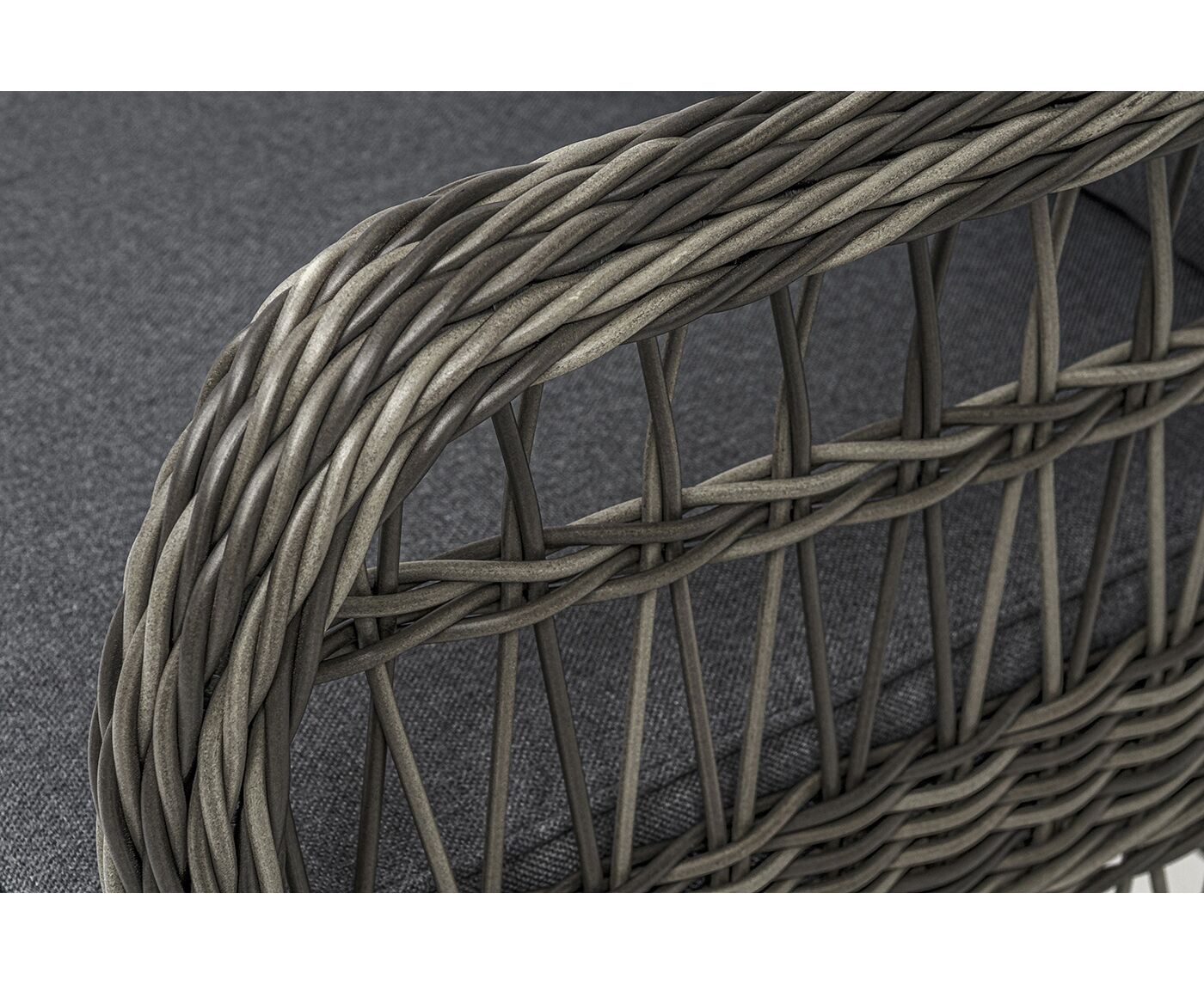 Алюминиевый каркас находится в основе мебели. Он характеризуется устойчивостью и высокой прочностью. Задекорирован ручной круглой оплеткой, которая сделана из искусственного ротанга. Представлена в графитовом оттенке.