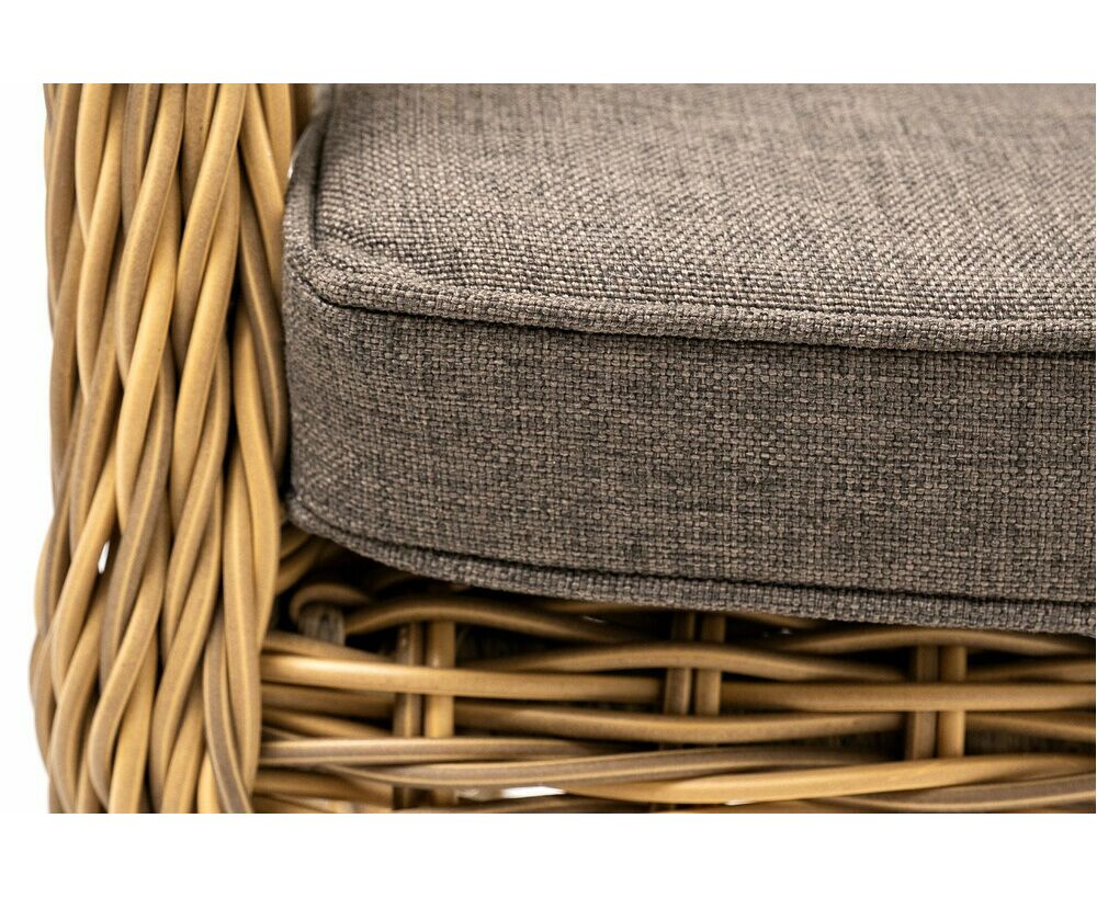 Садовое кресло располагает двумя мягкими подушками, которые идут в комплекте. Они выполнены в серо-коричневом цвете. Полиэстер высокого качества используется при пошиве тканевых изделий. Его плотность 230гр/м2. Ткань обрабатывается влагоотталкивающей пропиткой.