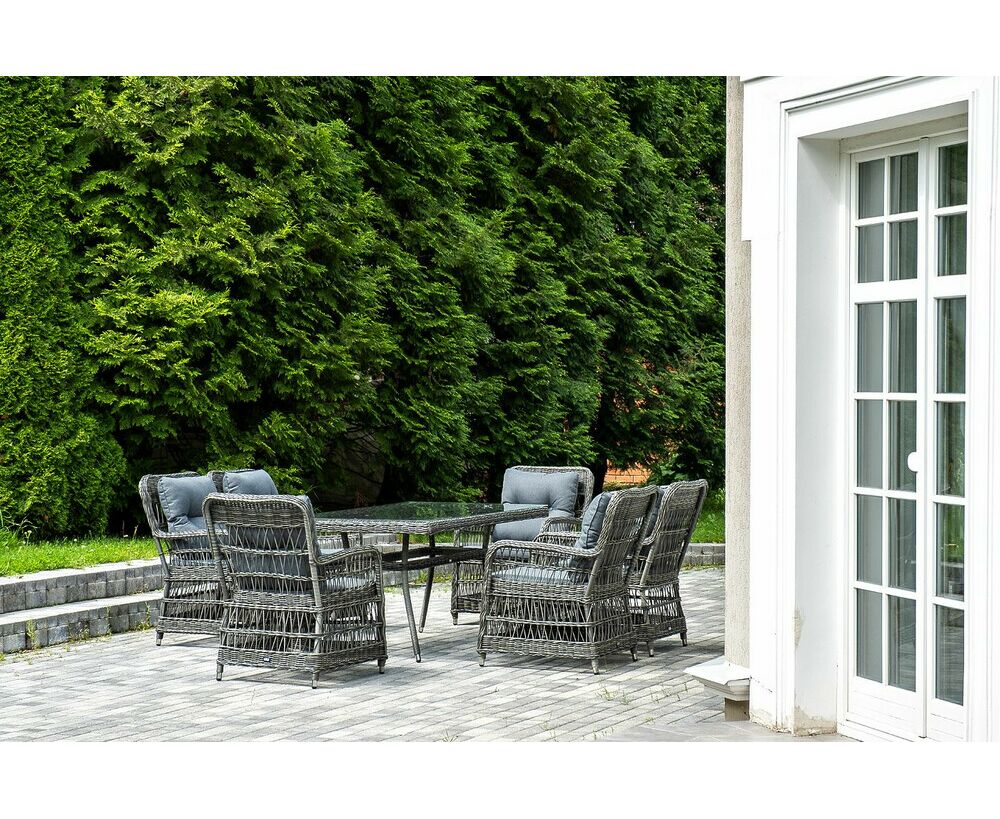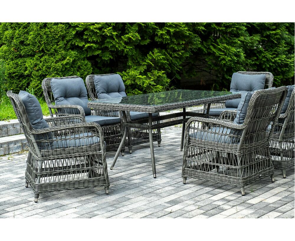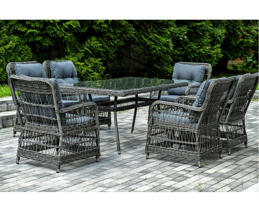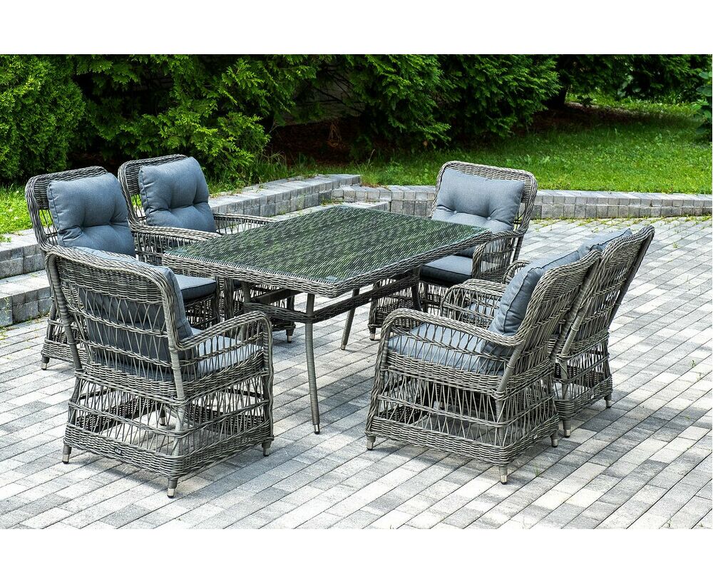 Садовая обеденная группа на 6 персон «Цесена» из ротанга. В комплекте: большой прямоугольный обеденный стол (1600×900×750 мм) и 6 кресел (600×800×910 мм).