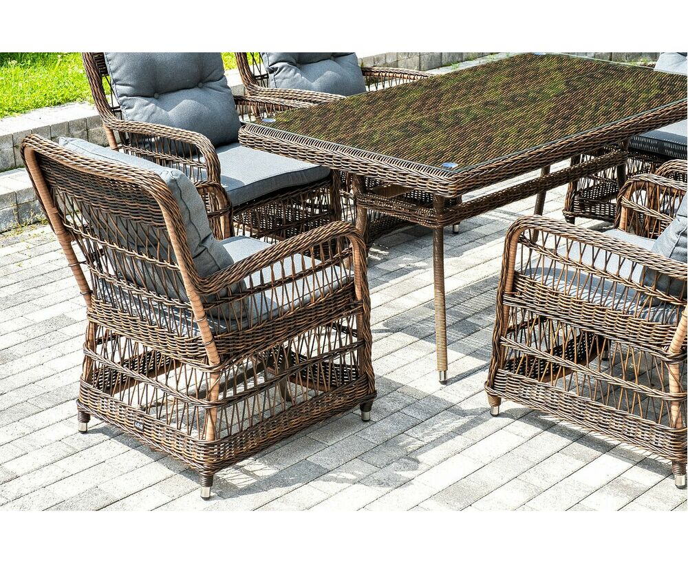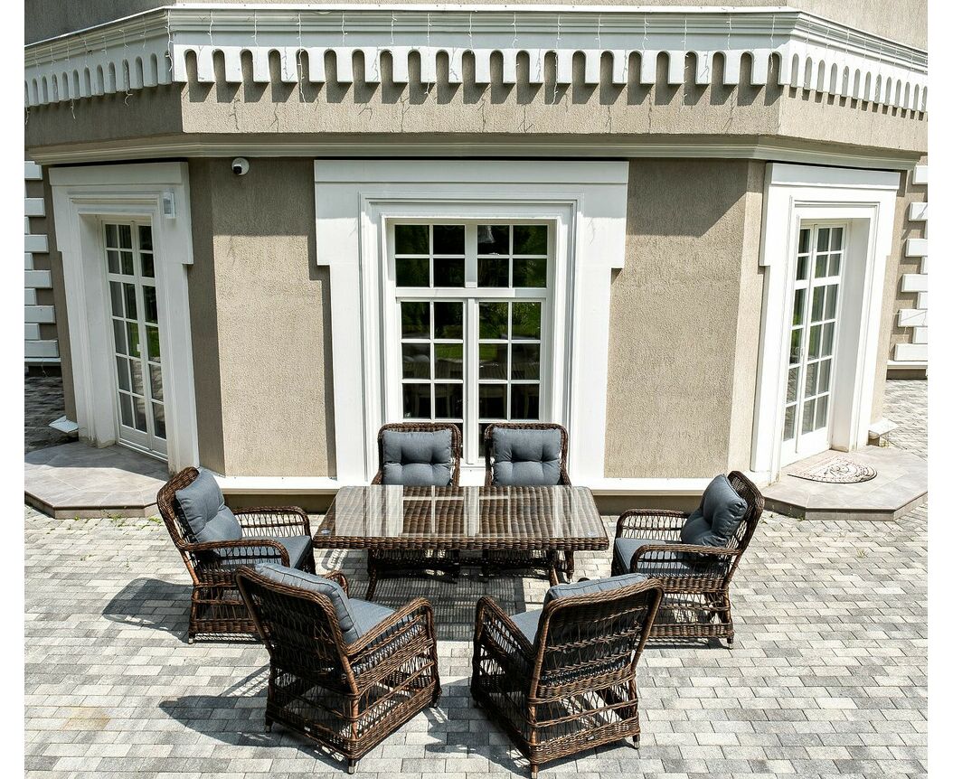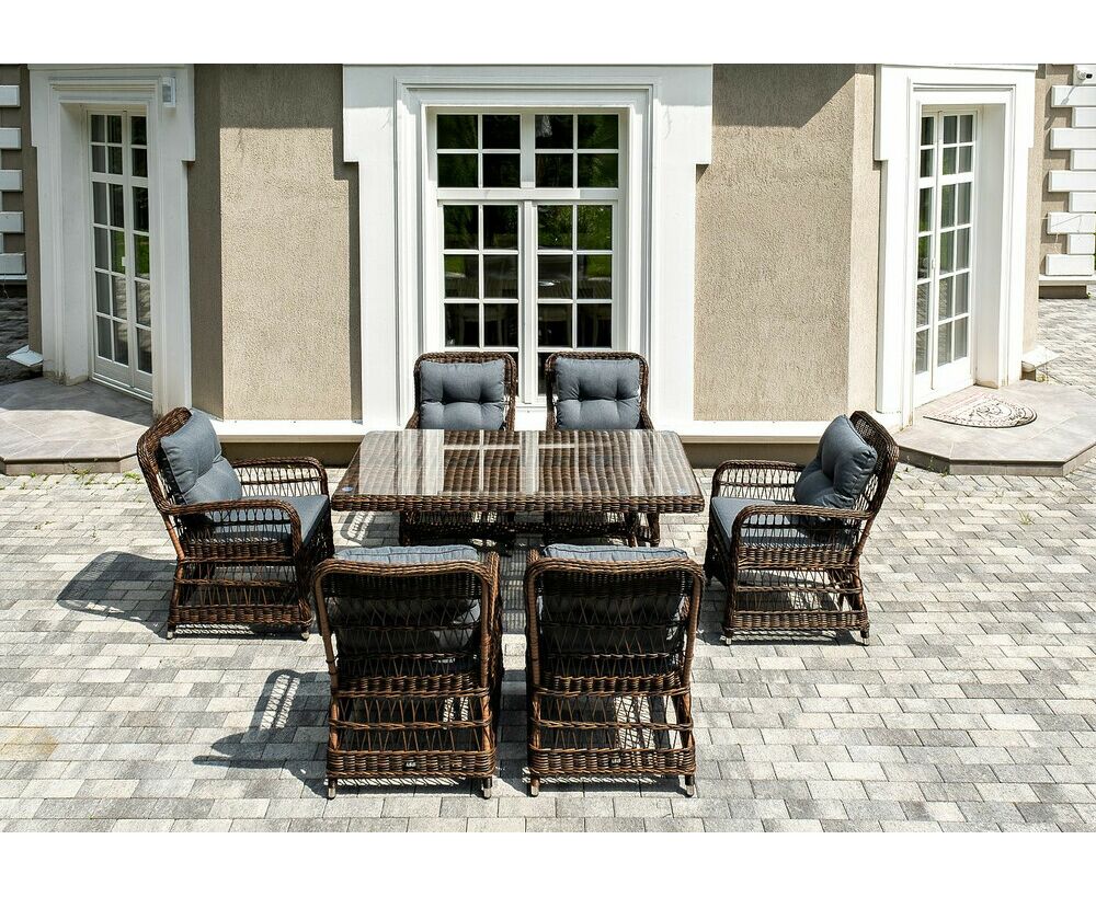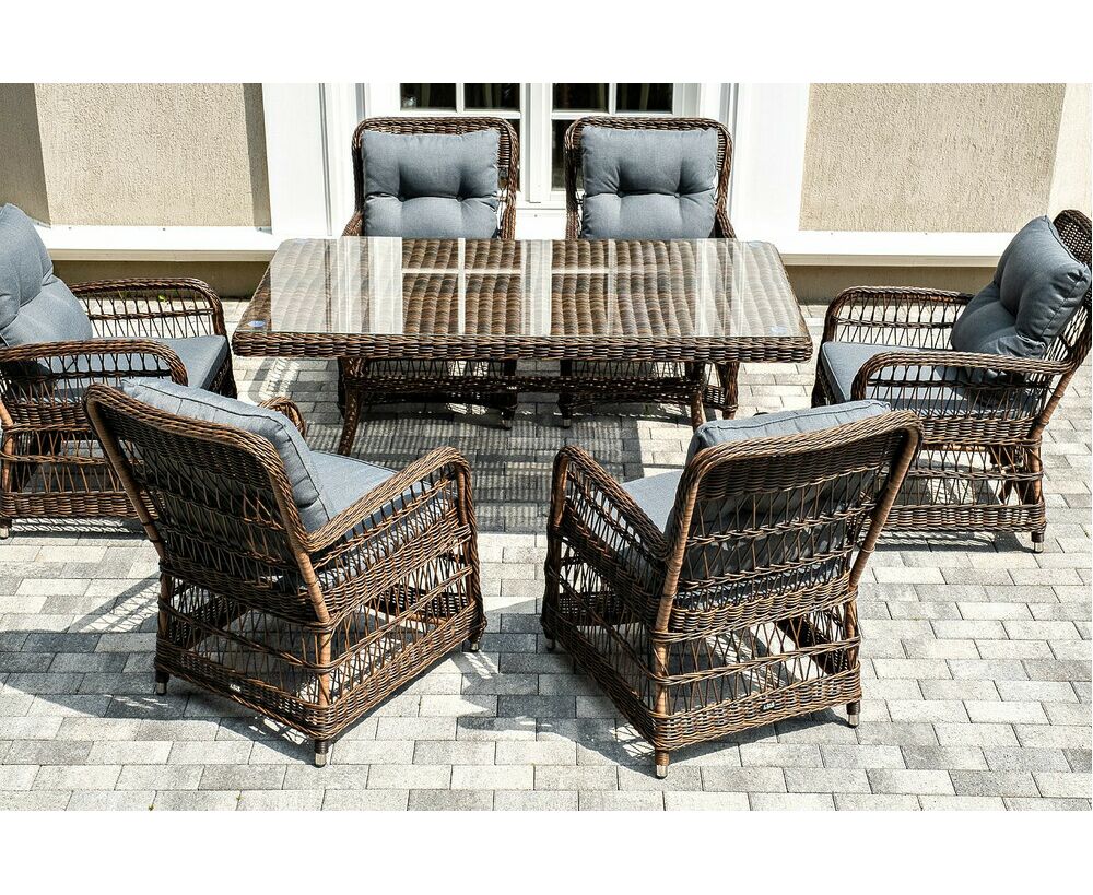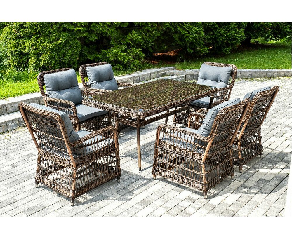 Садовая обеденная группа на 6 персон «Цесена» из ротанга. В комплекте: большой прямоугольный обеденный стол (1600×900×750 мм) и 6 кресел (600×800×910 мм).