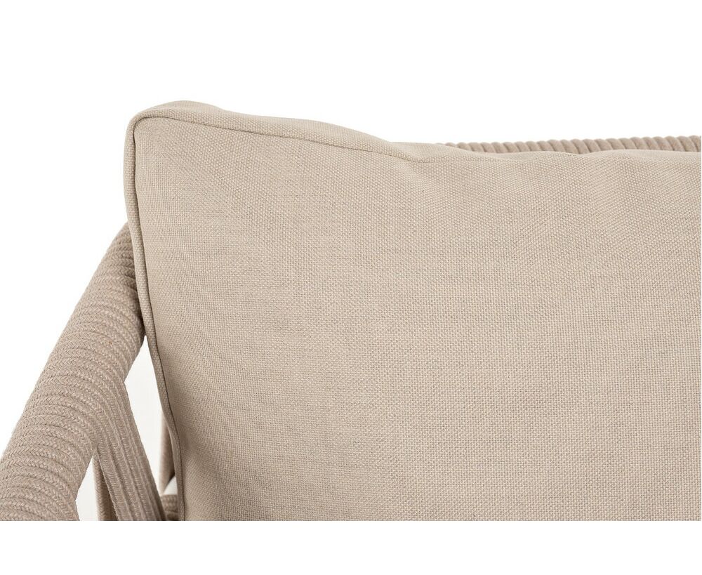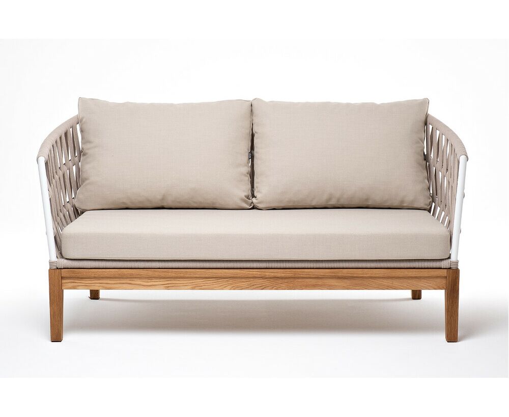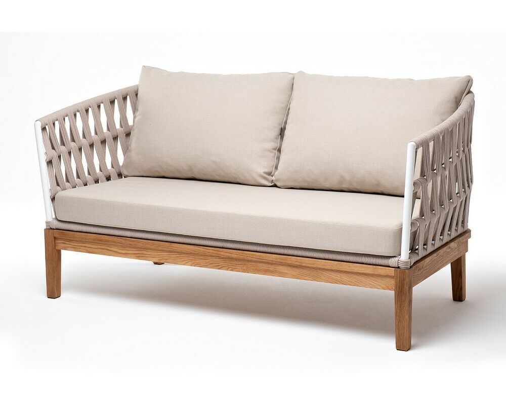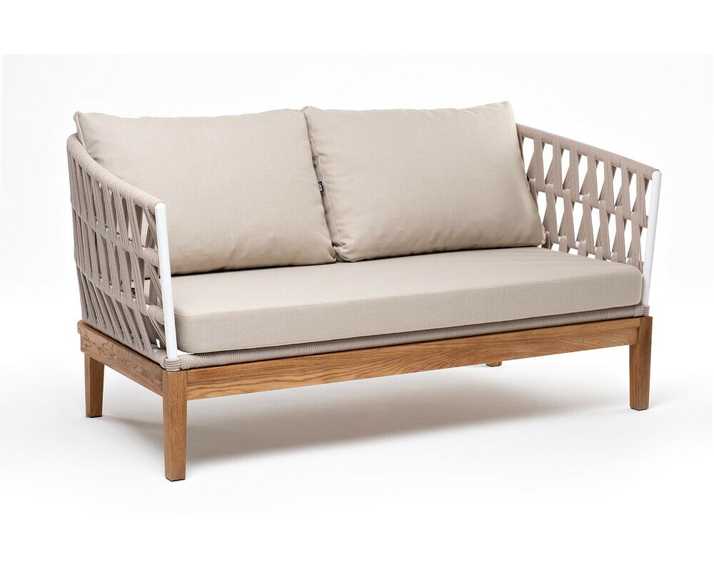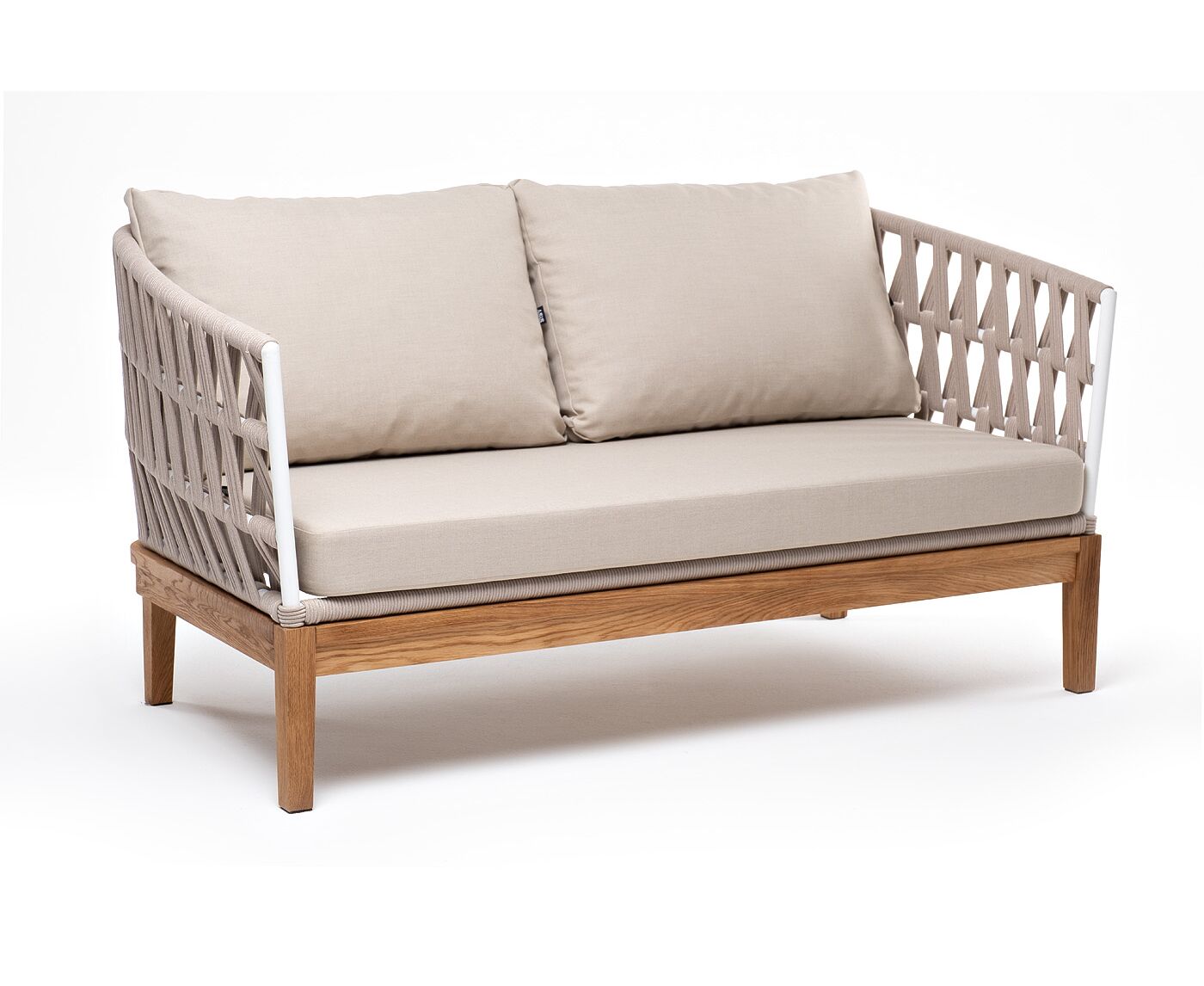"Диего" диван 2-местный плетеный из роупа, основание дуб, каркас алюминий светло-серый (RAL7035) шагрень, роуп бежевый круглый, ткань бежевая 15052