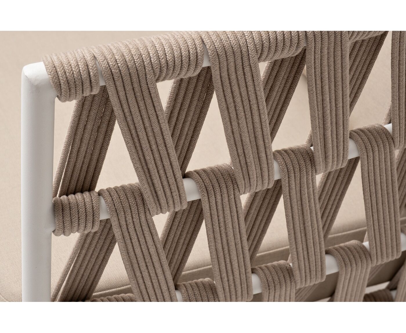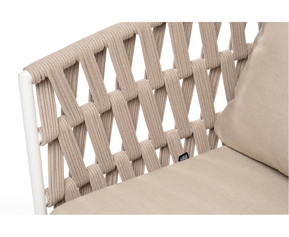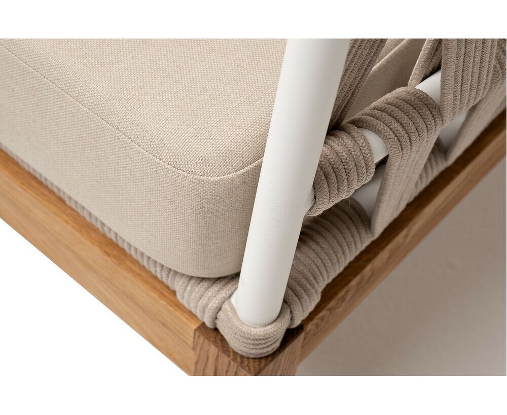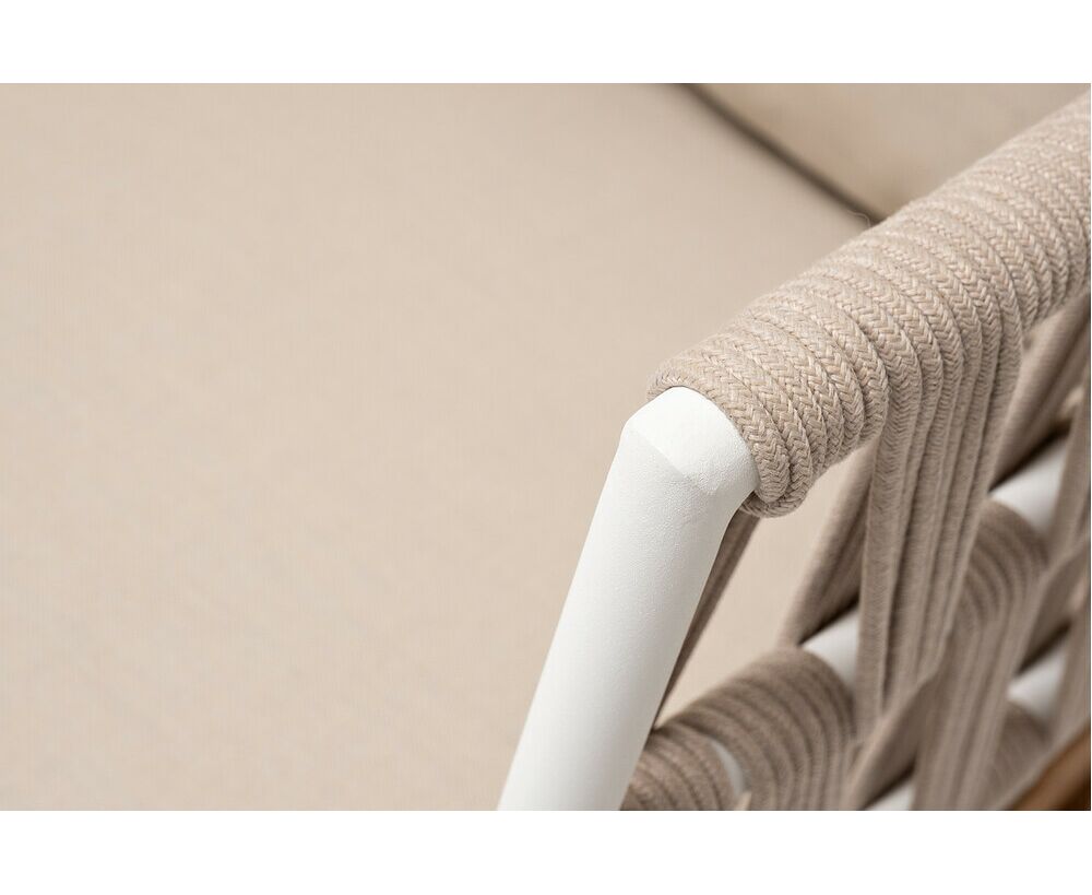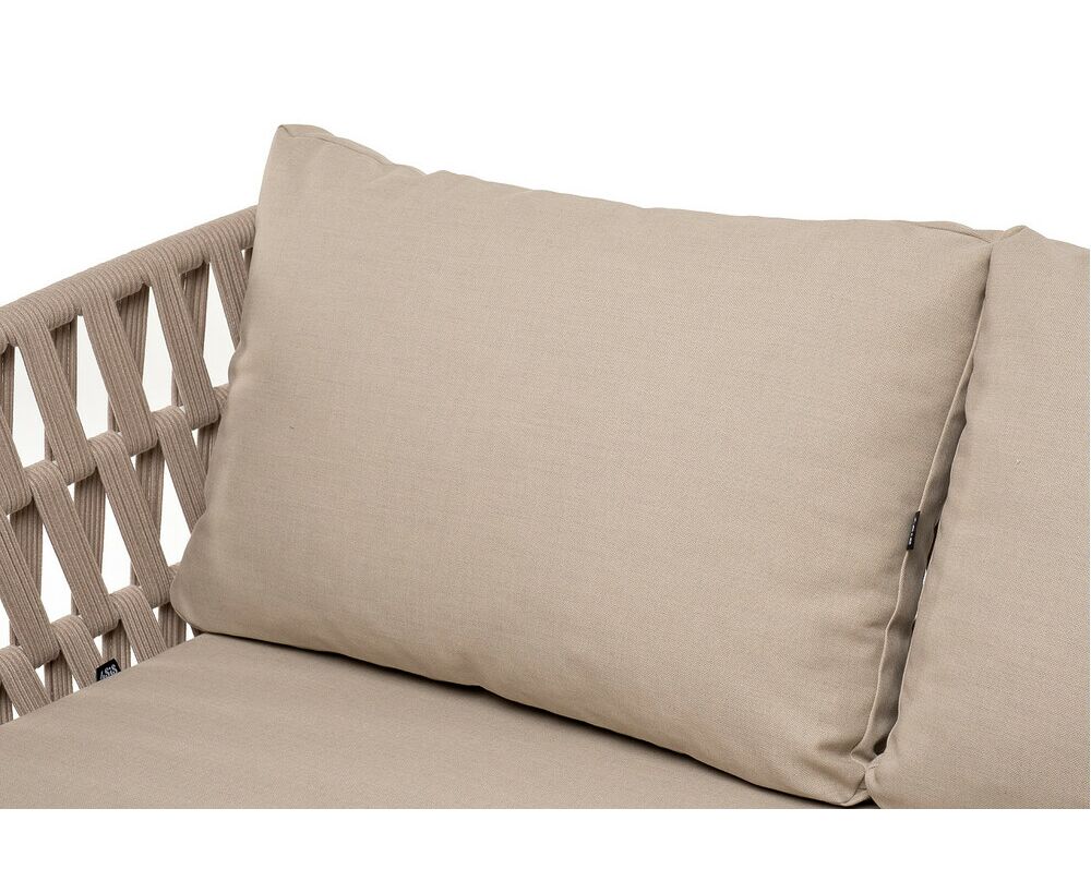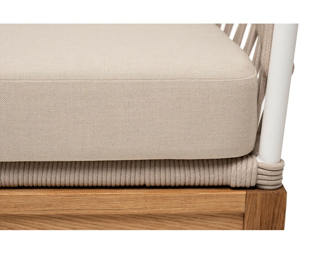 "Диего" диван 2-местный плетеный из роупа, основание дуб, каркас алюминий светло-серый (RAL7035) шагрень, роуп бежевый круглый, ткань бежевая 15052