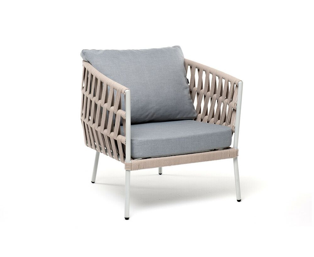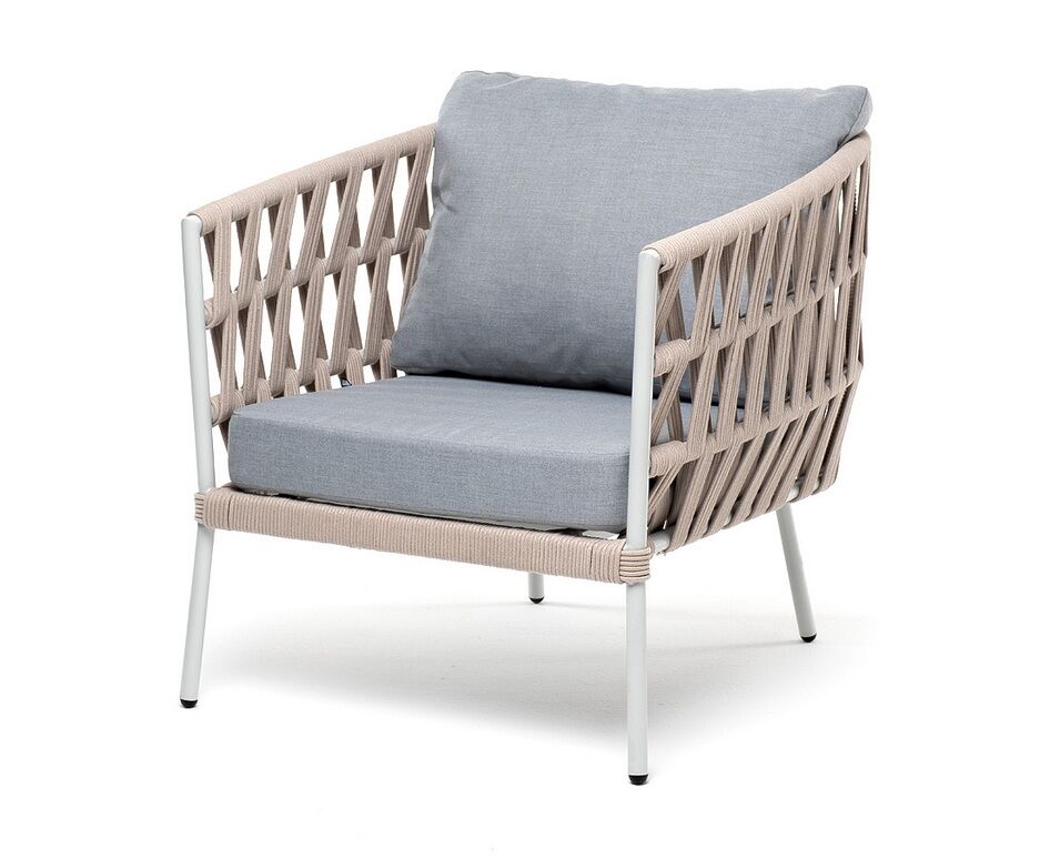 "Диего" кресло плетеное из роупа, каркас алюминий светло-серый (RAL7035) муар, роуп бежевый круглый, ткань светло-серая