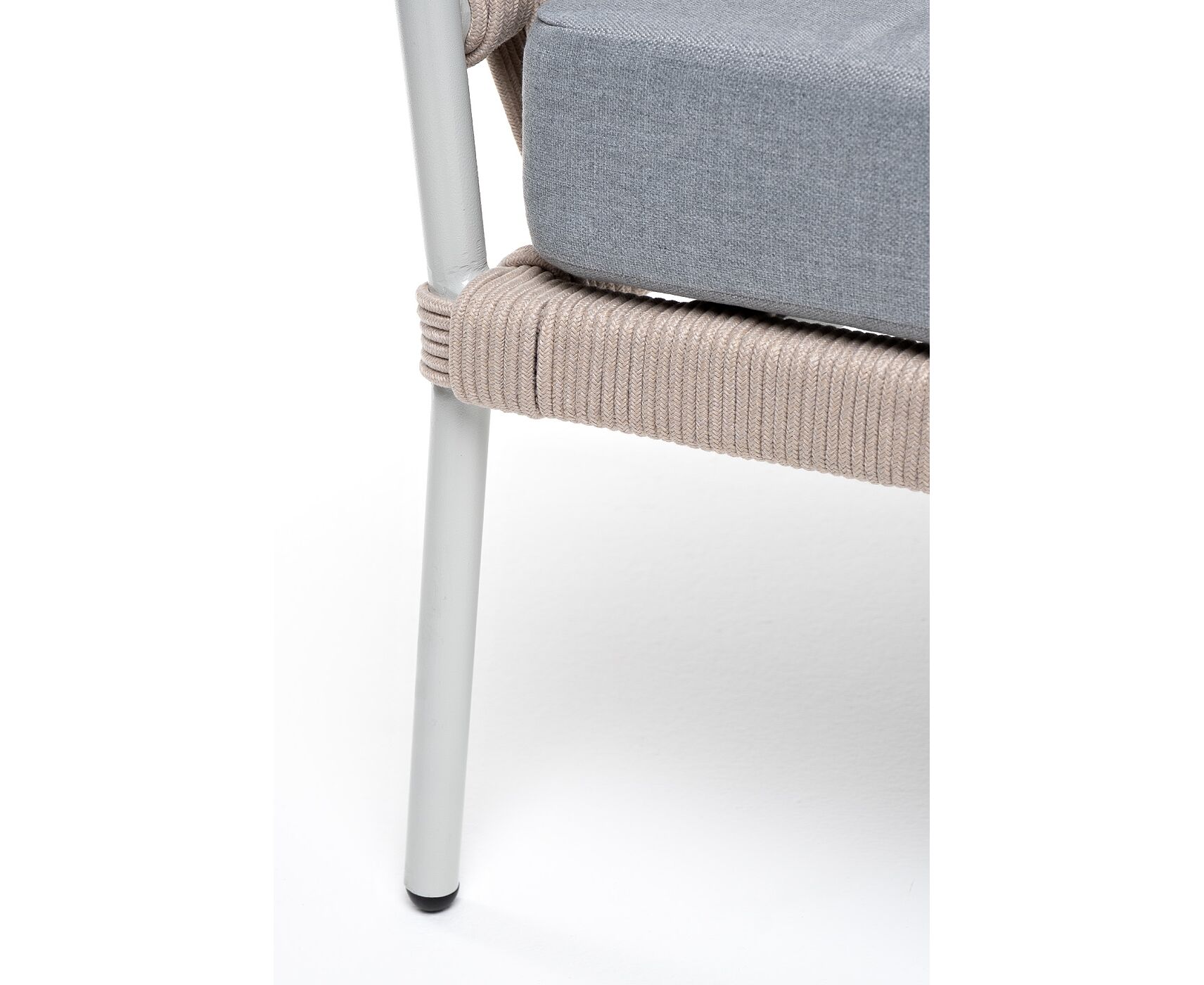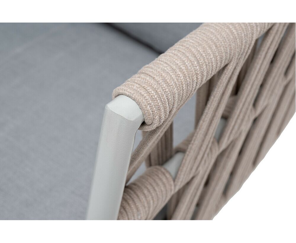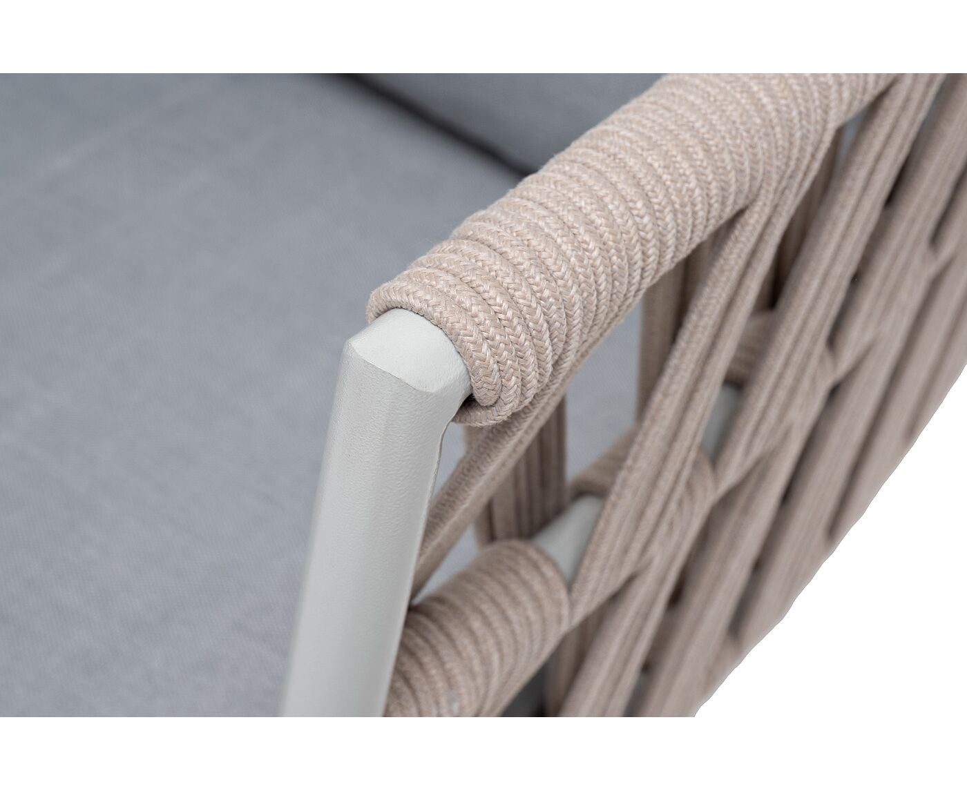 Кресло имеет алюминиевый каркас, окрашенный порошковой краской в светло-серый (RAL7035) цвет. Боковины каркаса вручную оплетены роупом - эластичными синтетическими лентами, изготовленными из высокопрочных полиэфирных волокон. Цвет оплетки - бежевый.