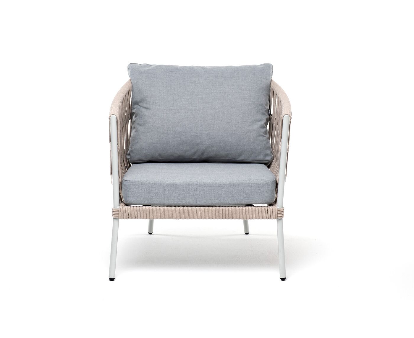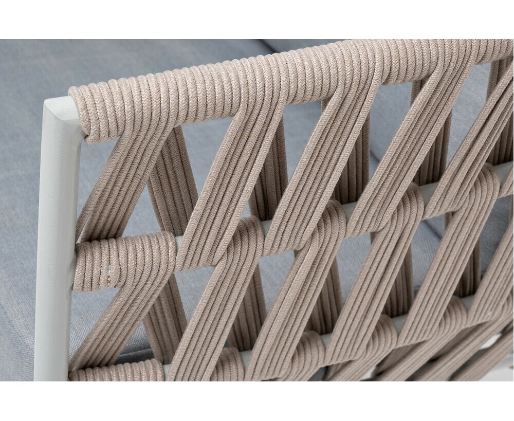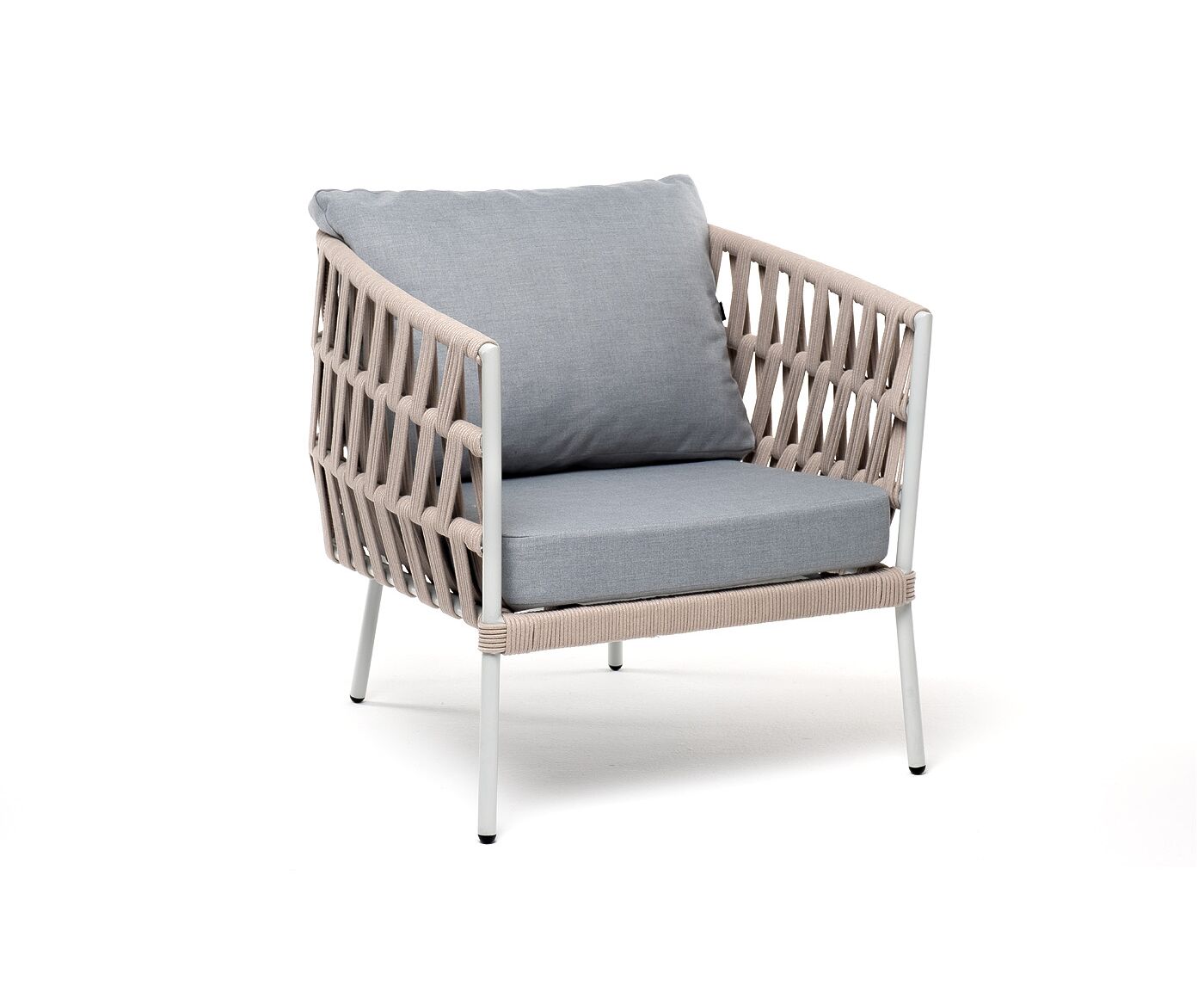 Кресло имеет алюминиевый каркас, окрашенный порошковой краской в светло-серый (RAL7035) цвет. Боковины каркаса вручную оплетены роупом - эластичными синтетическими лентами, изготовленными из высокопрочных полиэфирных волокон. Цвет оплетки - бежевый.