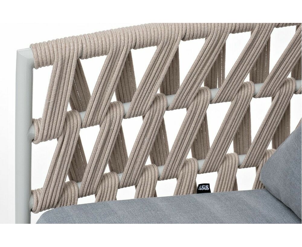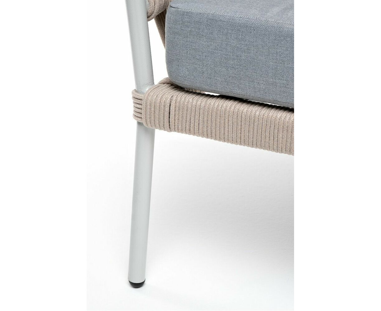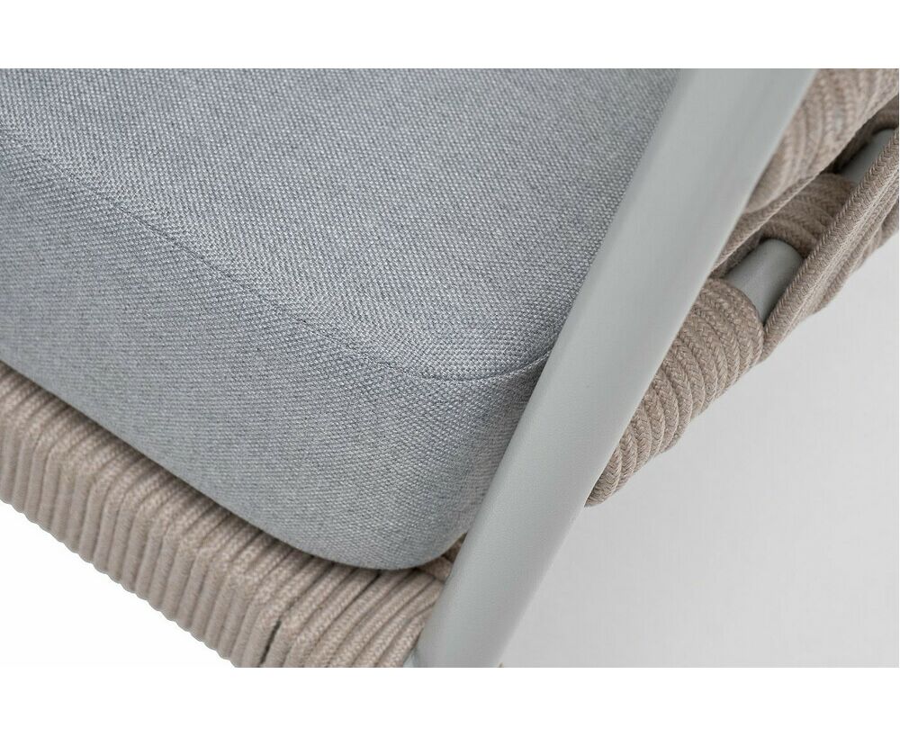 Кресло имеет алюминиевый каркас, окрашенный порошковой краской в светло-серый (RAL7035) цвет. Боковины каркаса вручную оплетены роупом - эластичными синтетическими лентами, изготовленными из высокопрочных полиэфирных волокон. Цвет оплетки - бежевый.