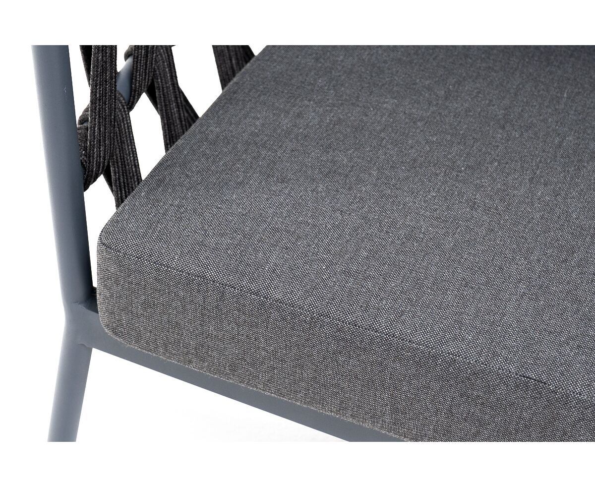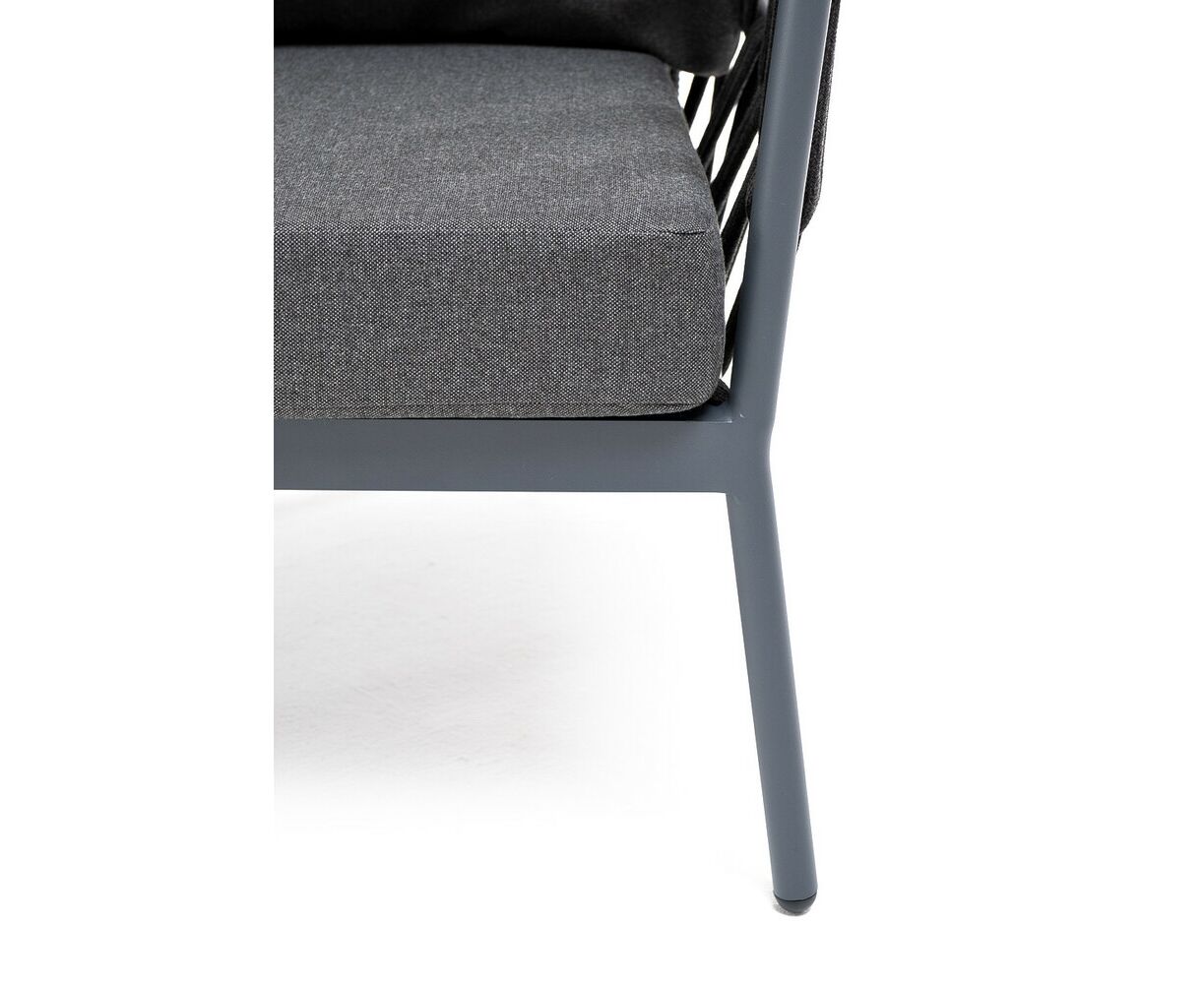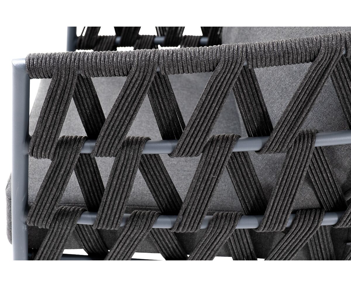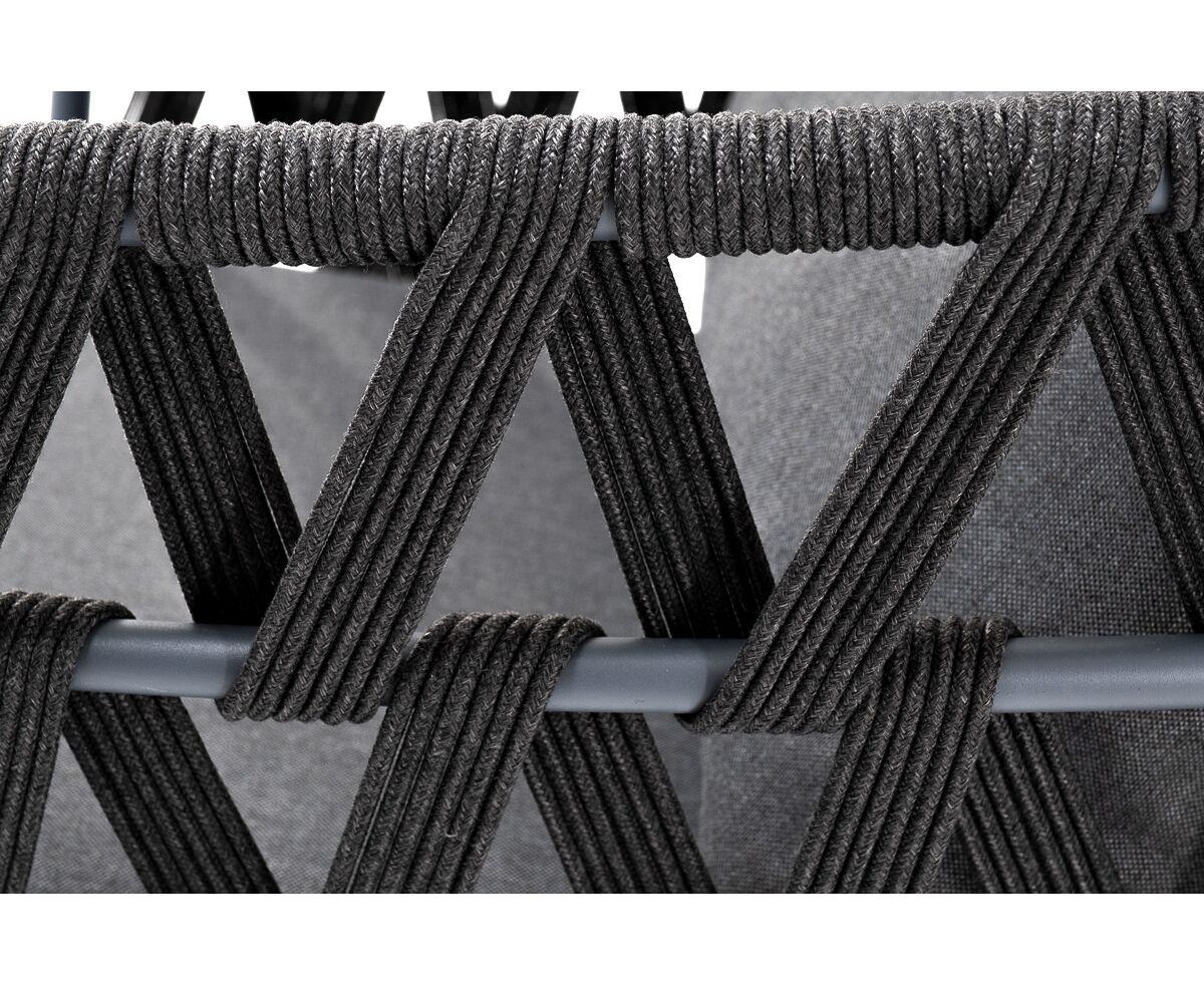 Кресло имеет алюминиевый каркас, окрашенный порошковой краской в темно-серый (RAL7024) цвет. Боковины каркаса вручную оплетены роупом - эластичными синтетическими лентами, изготовленными из высокопрочных полиэфирных волокон. Цвет оплетки - темно-серый.