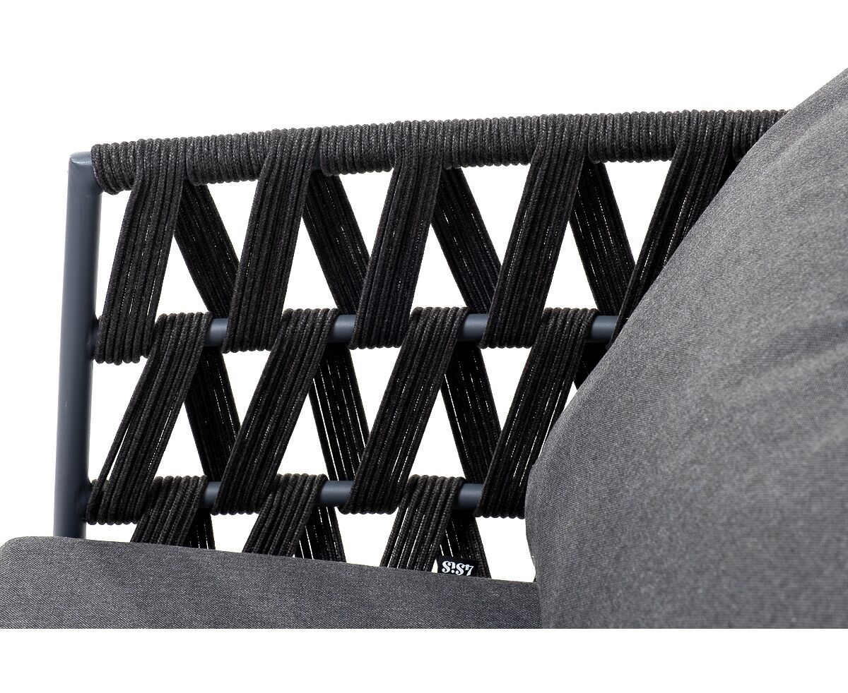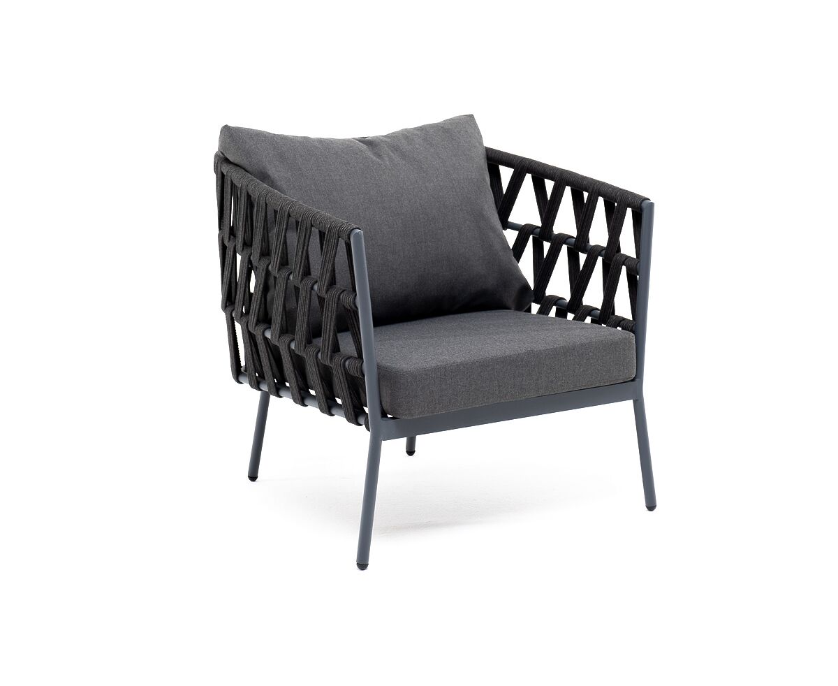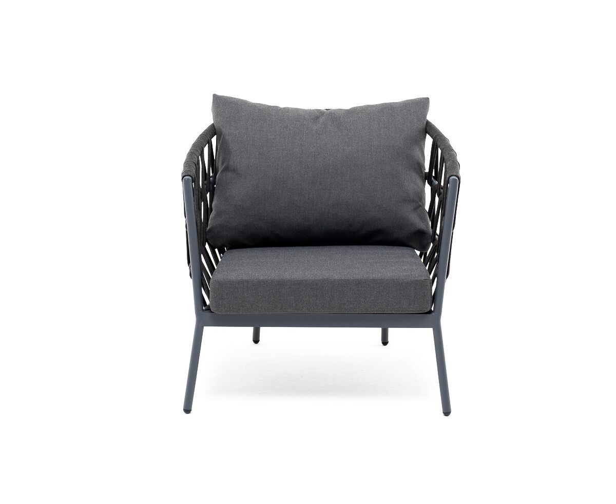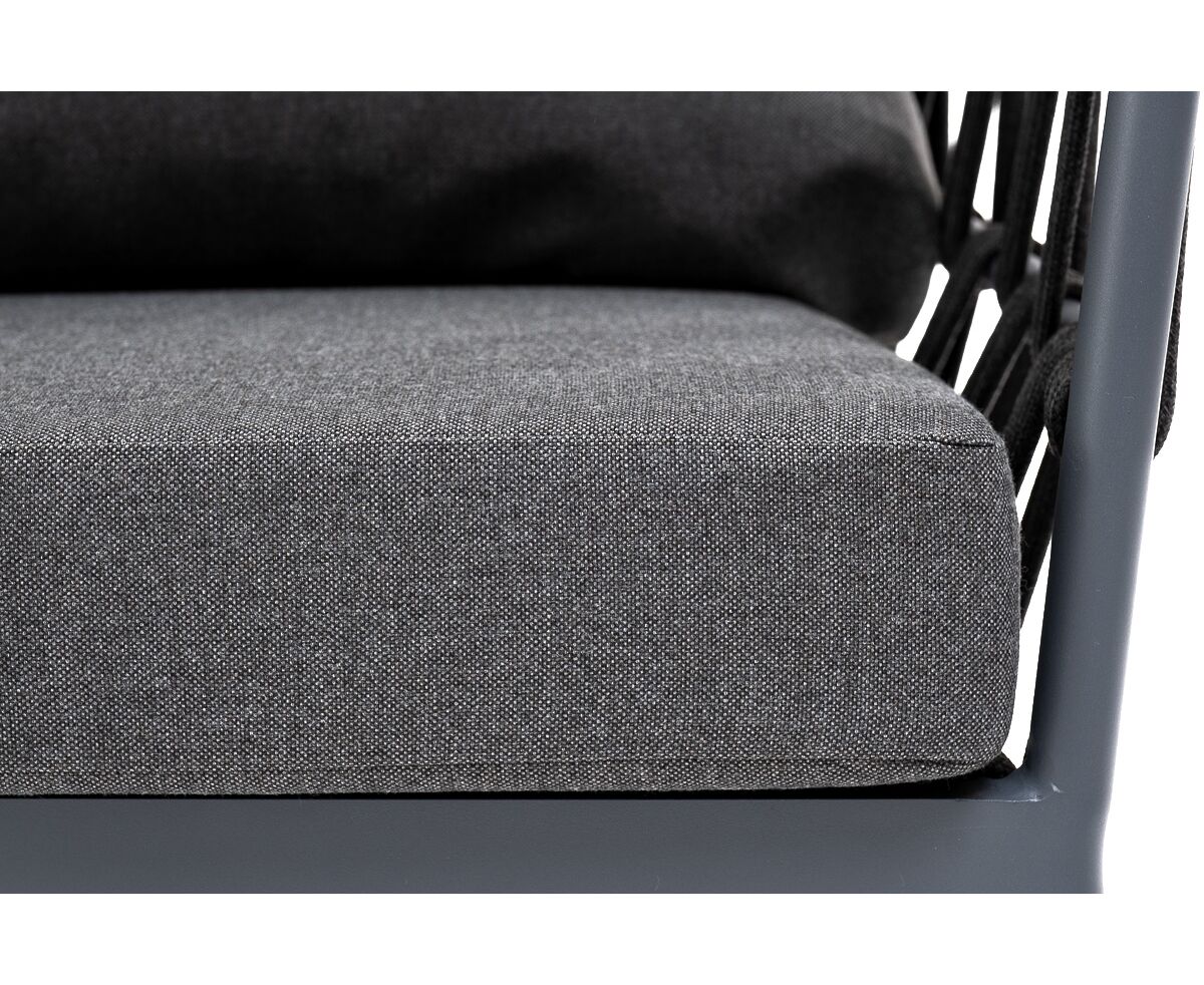 Кресло имеет алюминиевый каркас, окрашенный порошковой краской в темно-серый (RAL7024) цвет. Боковины каркаса вручную оплетены роупом - эластичными синтетическими лентами, изготовленными из высокопрочных полиэфирных волокон. Цвет оплетки - темно-серый.