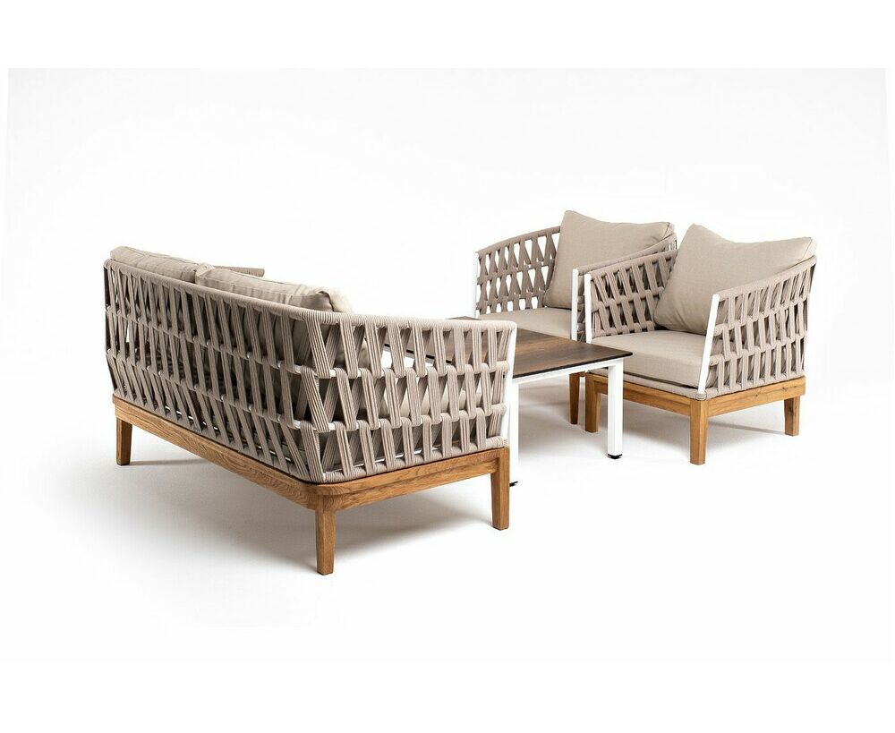 Каркас уличной мебели выполнен из дуба. Его дополняет бежевая оплетка, изготовленная на основе эластичных синтетических лент из полиэфирных волокон высокой прочности.