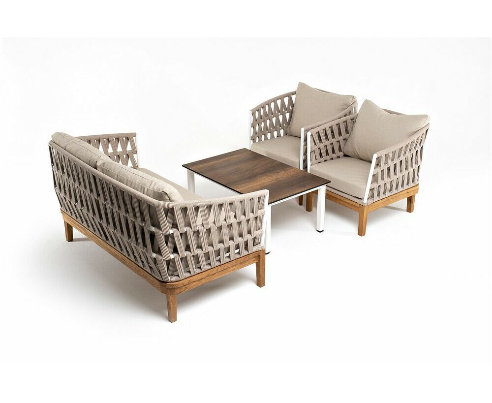 Кресла и диван идут в комплекте с мягкими подушками в чехлах. бежевого цвета. "Диего" диван 2-местный плетеный из роупа, основание дуб, каркас алюминий светло-серый (RAL7035) шагрень, роуп бежевый круглый, ткань бежевая 052 1шт. 1 580Х720Х800, "Диего" кресло плетеное из роупа, основание дуб, каркас алюминий светло-серый (RAL7035) шагрень, роуп бежевый круглый, ткань бежевая 052 2шт. 770Х720Х800, "Канны" журнальный столик из HPL 90х60, H40, каркас белый, цвет столешницы "дуб" 1шт. 900Х600Х400,