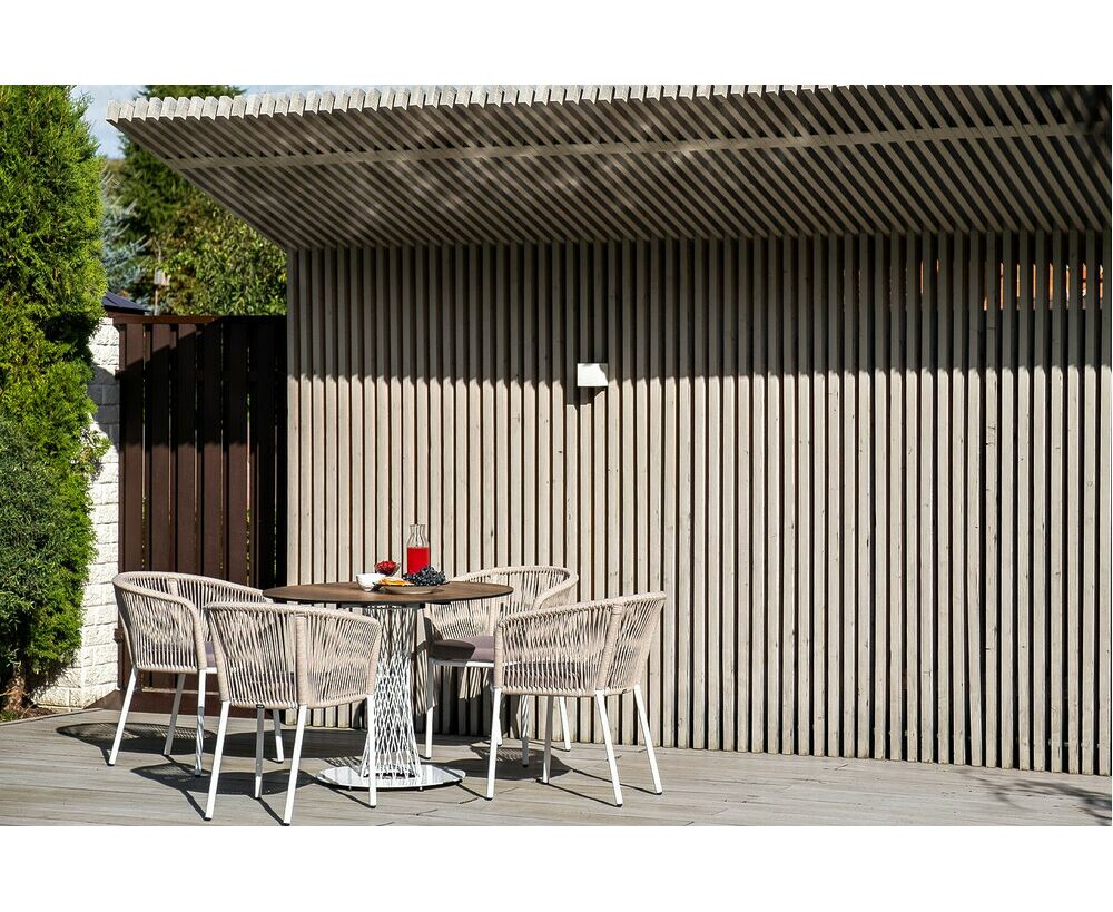 Возможно изготовление стола любого размера и формы по индивидуальному заказу. "Диего" обеденный стол из HPL круглый Ø100см, цвет "дуб", каркас черный 1шт. 1 000Х1 000Х750, "Марсель" стул плетеный из роупа, каркас алюминий белый шагрень, роуп бежевый круглый, ткань бежевая 035 4шт. 570Х620Х775,