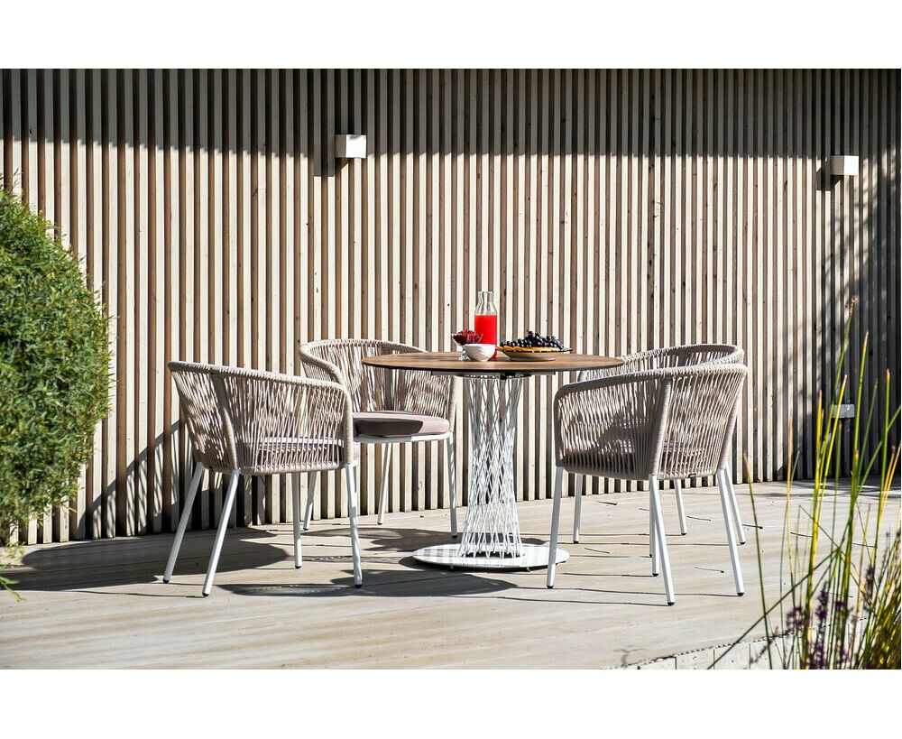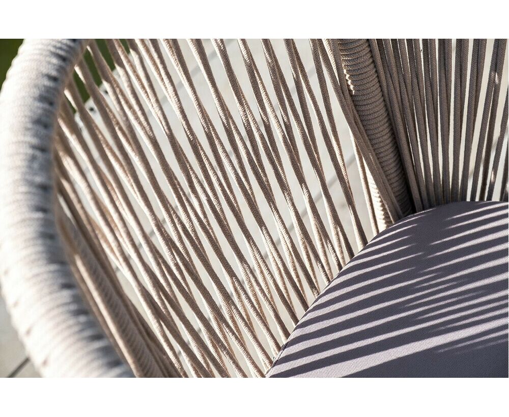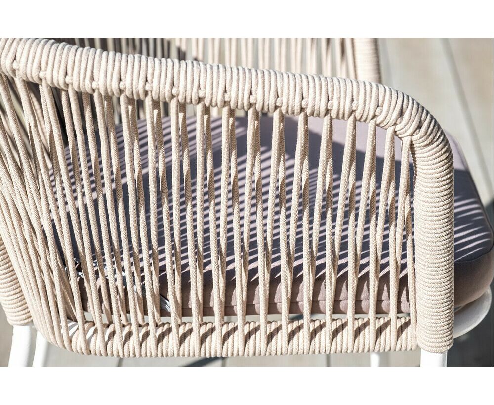 4 кресла из коллекции «Марсель», выполненных из алюминиевого каркаса и ручной оплетки роупом. Это эластичные синтетические ленты из высокопрочных полиэфирных волокон, представлены в бежевом цвете.