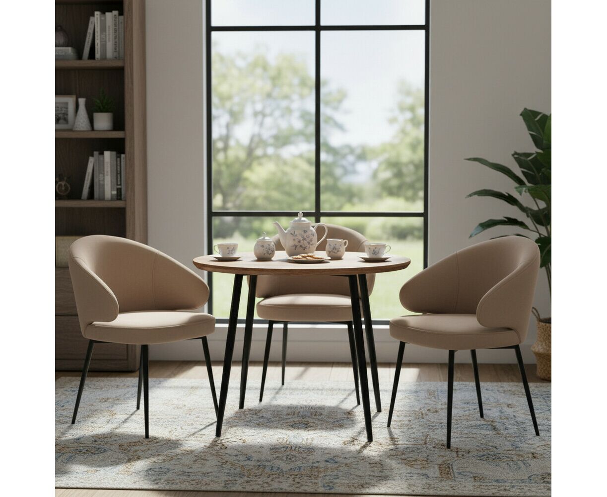 Восходящий изгиб подлокотников позволяет почти полностью скрыть их под стандартной высотой столешницы, что придает обеденной группе изысканный вид и мобильность.