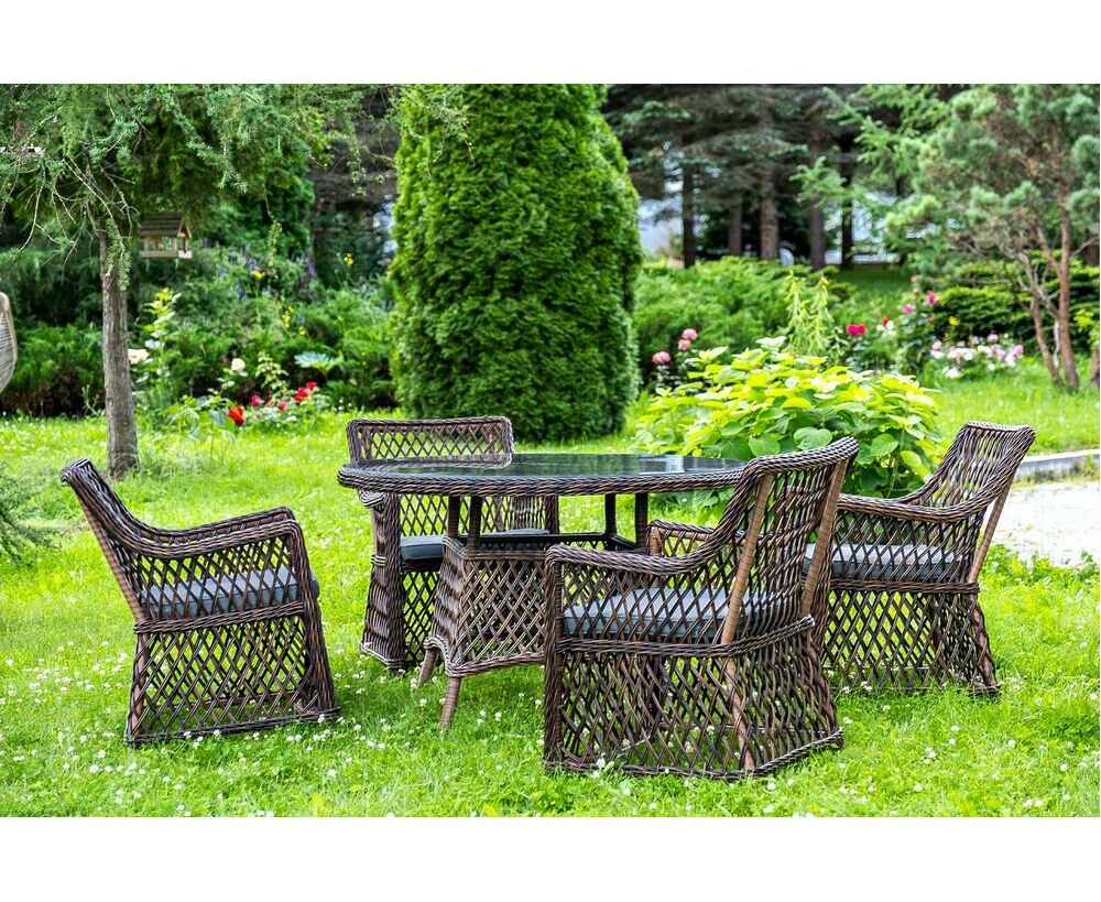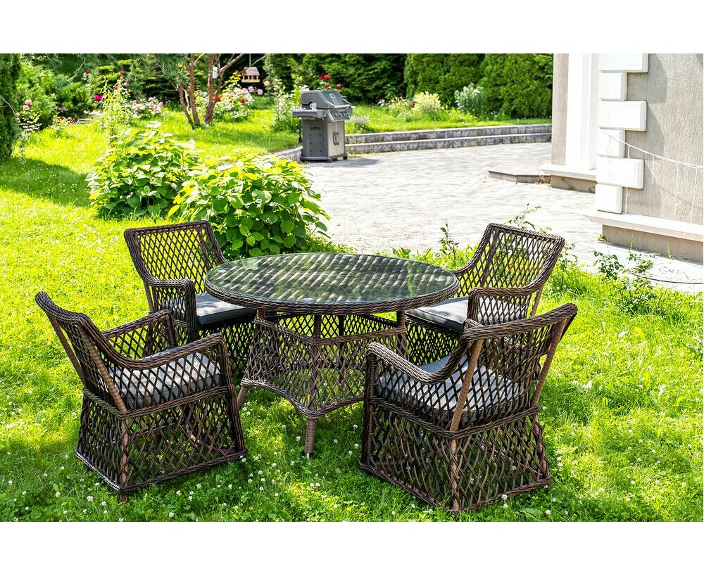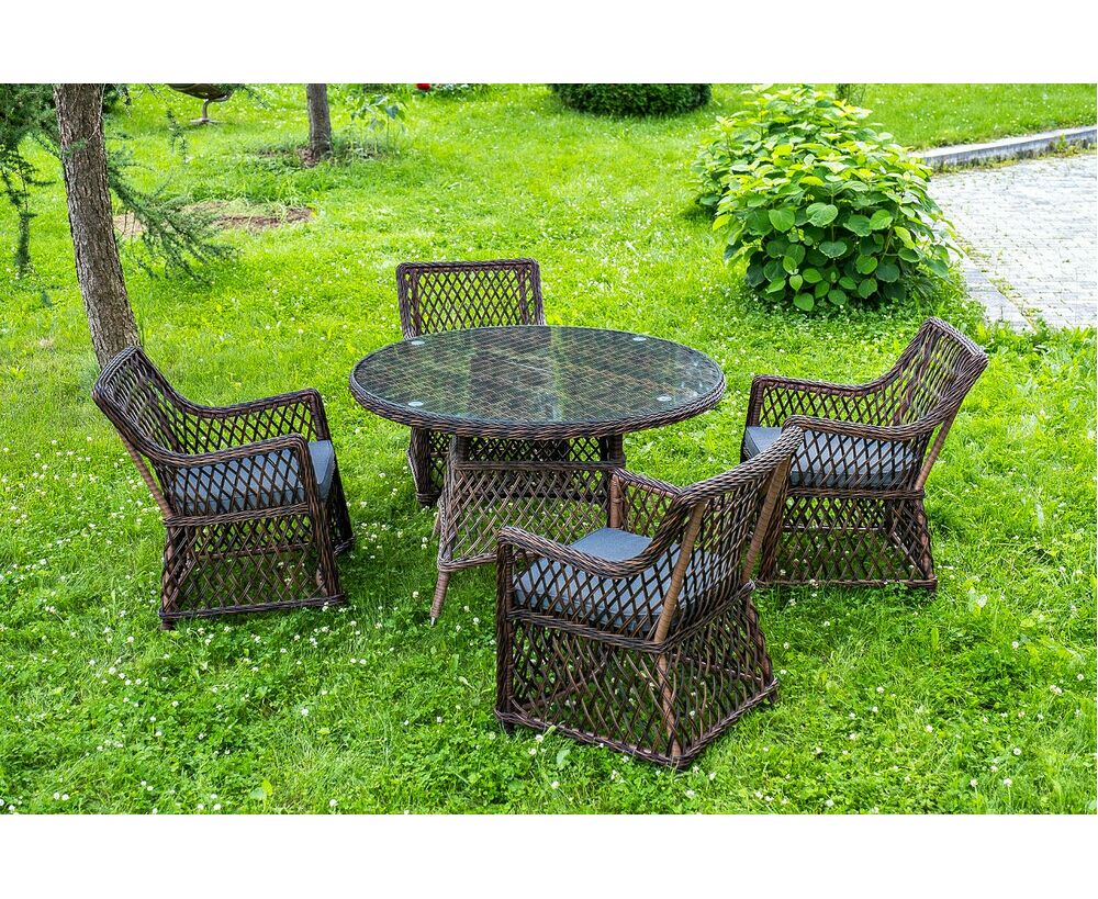 "Эспрессо" плетеный круглый стол, диаметр 118 см, цвет коричневый 1шт. 1 180Х1 180Х750, "Латте" плетеное кресло из искусственного ротанга, цвет коричневый 4шт. 550Х660Х850,