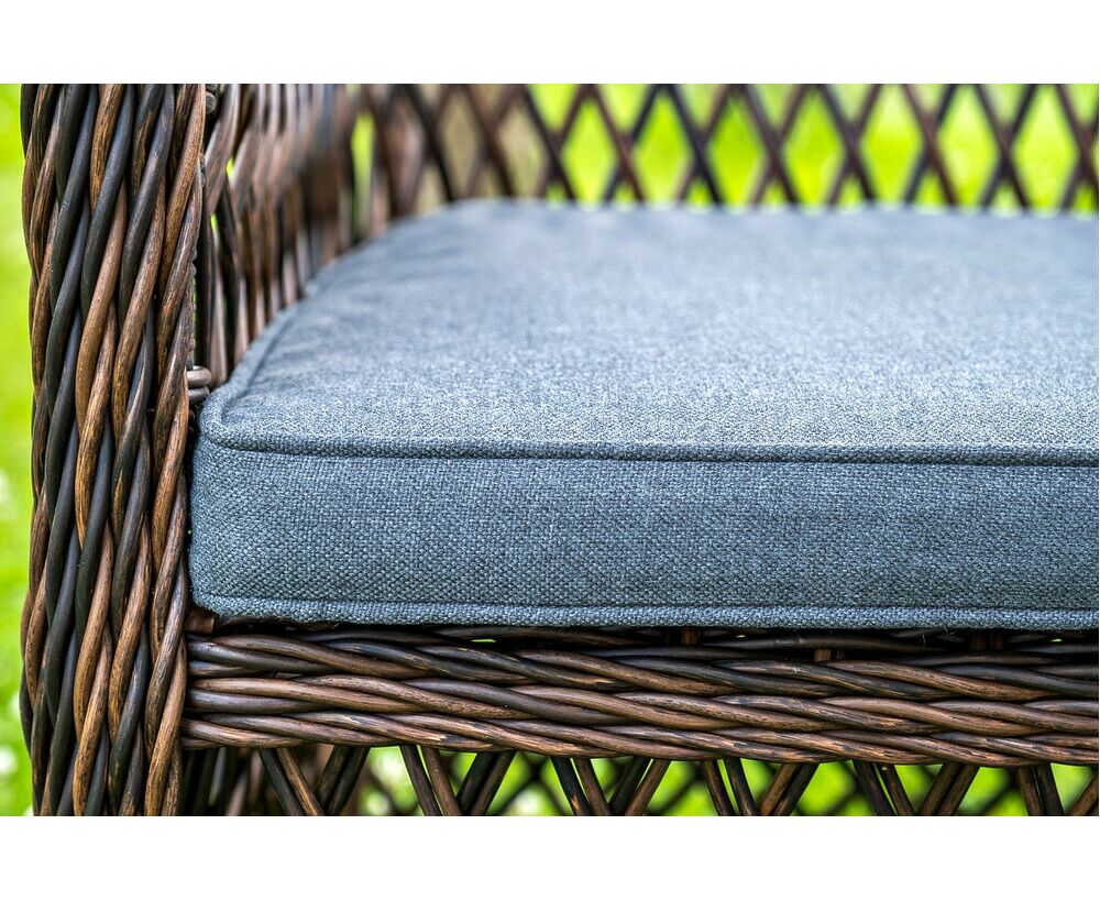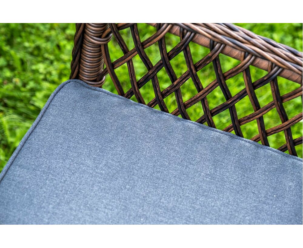 Каркас мебели выполнен из прочного и легкого алюминия, вручную оплетенного круглым синтетическим ротангом натурального соломенного оттенка. На креслах предусмотрены мягкие подушки со съемными чехлами серо-коричневого цвета.