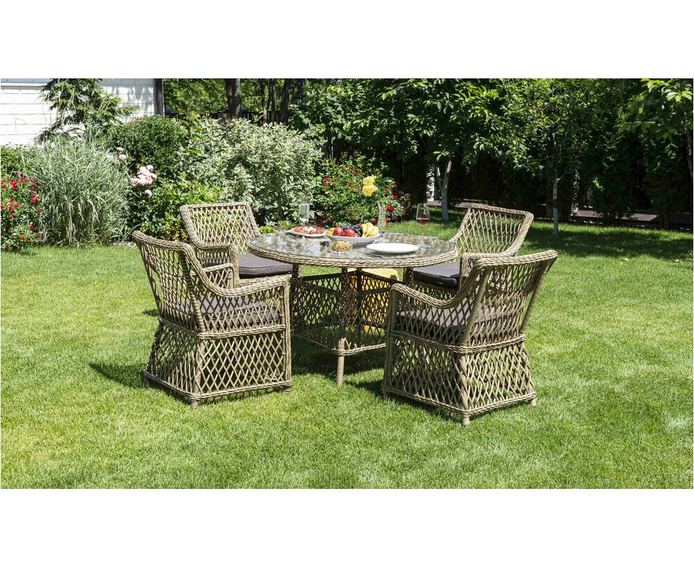 Классическая уличная обеденная группа "Доппио" для сада, летней веранды ресторана. В комплекте круглый обеденный стол «Эспрессо» (1180×1180×750 мм) с ударопрочной стеклянной столешницей и 4 кресла коллекции «Латте» 680х550х840 мм.