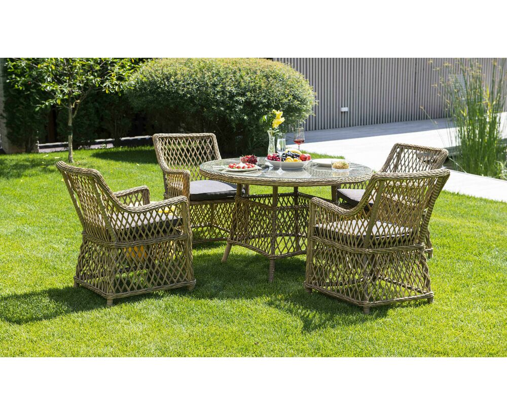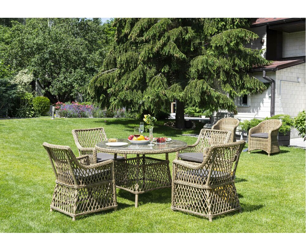 "Эспрессо" плетеный круглый стол, диаметр 118 см, цвет соломенный 1шт. 1 180Х1 180Х750, "Латте" плетеное кресло из искусственного ротанга, цвет соломенный 4шт. 550Х660Х850,