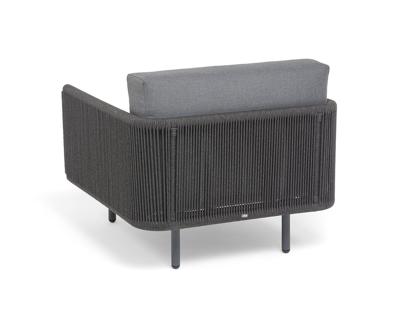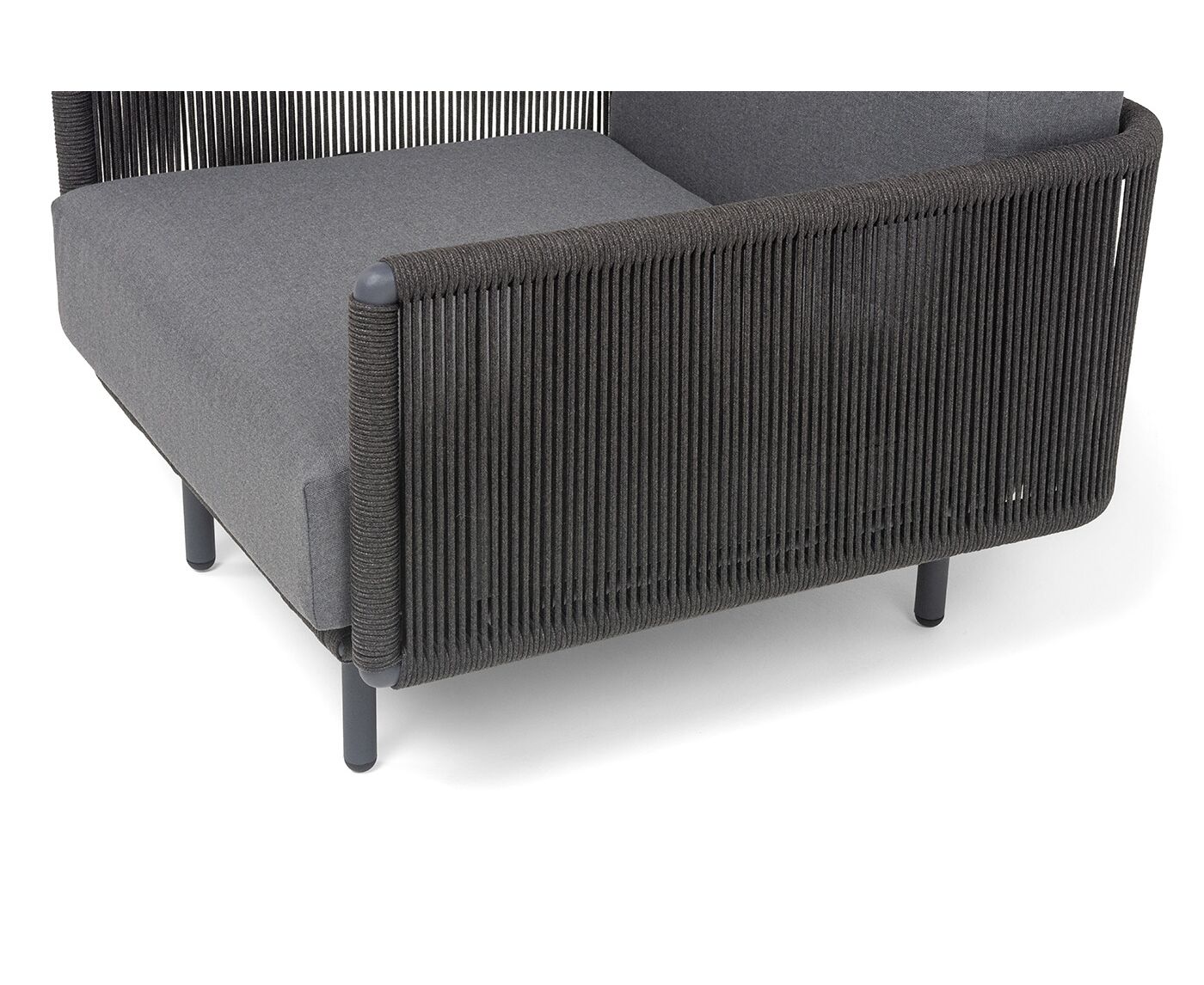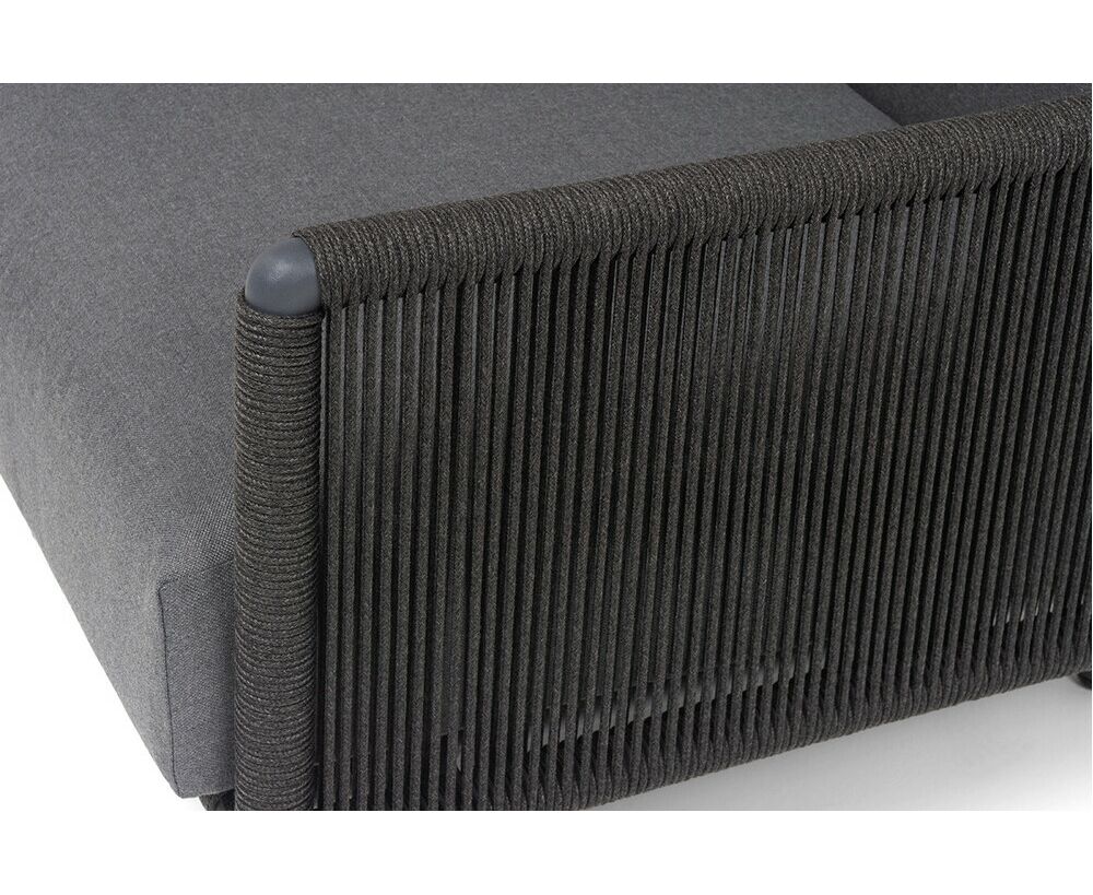 Каркас изготовлен из алюминия и покрыт порошковой краской темно-серого цвета (RAL7024), что повышает устойчивость к атмосферным воздействиям. Боковины каркаса вручную оплетены роупом — эластичными синтетическими лентами, выполненными из прочных полиэфирных волокон.