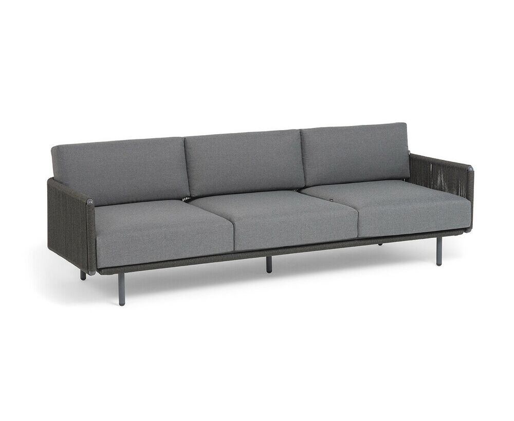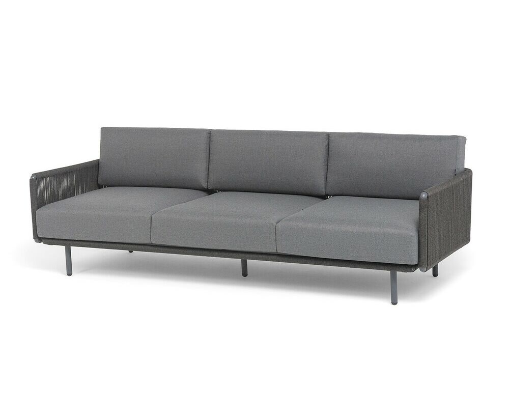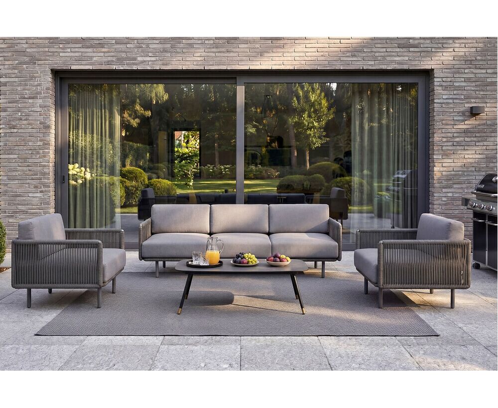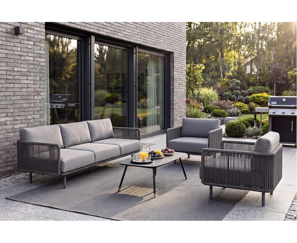 Кресла и диван идут в комплекте с мягкими подушками в чехлах те "Джелло" диван 3-местный плетеный из роупа, каркас алюминий темно-серый (RAL7024) муар, роуп темно-серый круглый, ткань темно-серая 027 1шт. 2 350Х870Х730, "Джелло" кресло плетеное из роупа, каркас алюминий темно-серый (RAL7024) муар, роуп темно-серый круглый, ткань темно-серая 027 2шт. 830Х870Х730, "Верона" журнальный стол из HPL 120х65, H40, каркас светло-серый (RA L7035) муар, цвет столешницы "серый гранит" 1шт. 1 200Х650Х400,