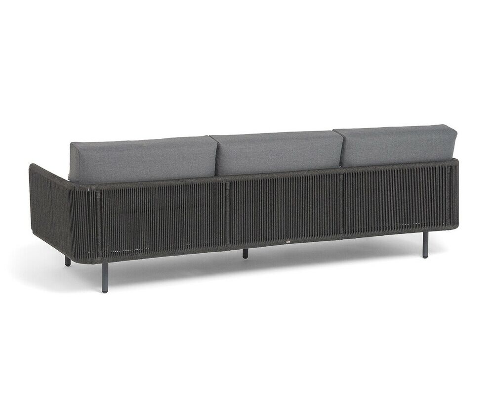 Каркас уличной мебели выполнен из износостойкого алюминия. Его дополняет темно-серая ручная оплетка, изготовленная на основе эластичных синтетических лент из полиэфирных волокон высокой прочности (роупа).