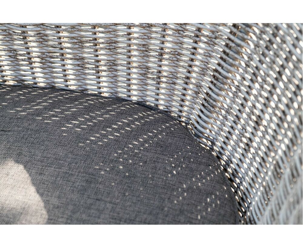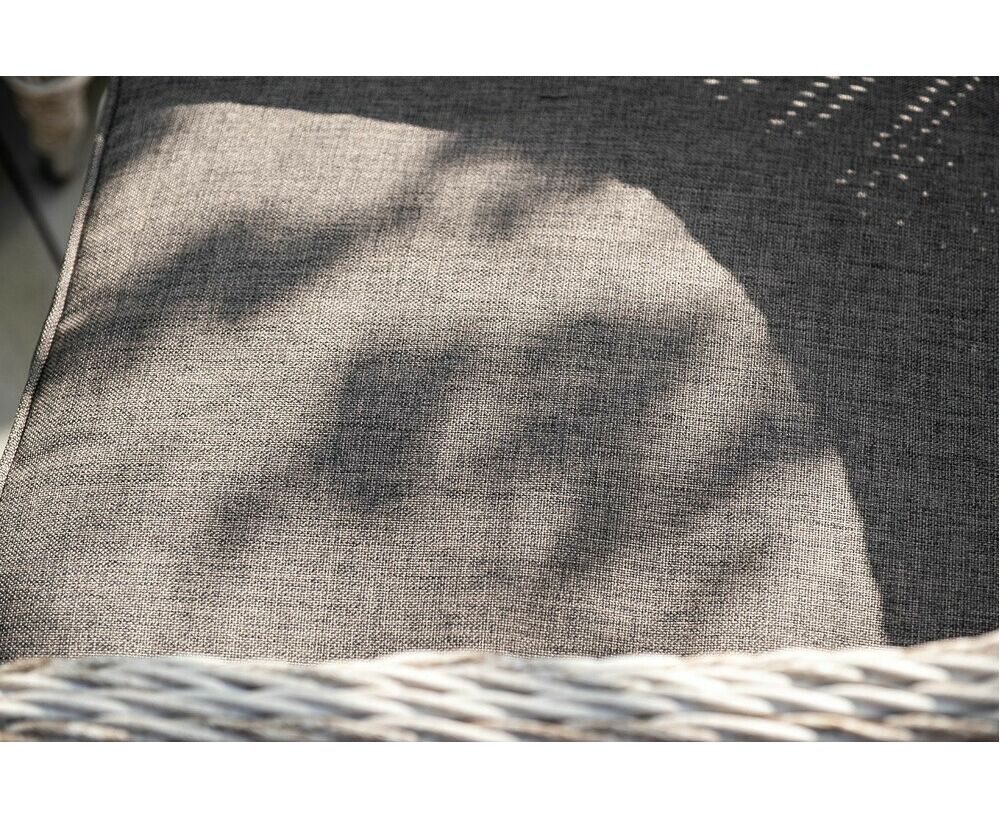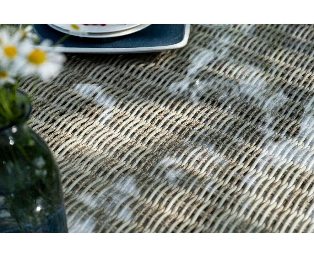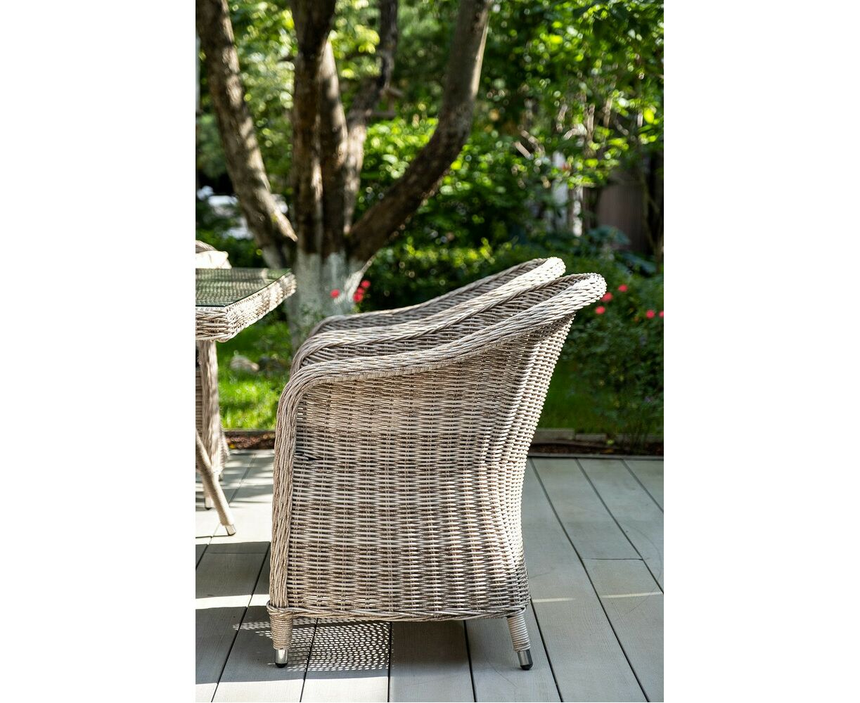 Каркас всех предметов мебели изготовлен из легкого и прочного алюминия, оплетенного вручную искусственным ротангом. Стол для удобства использования накрыт прочным стеклом, кресла укомплектованы подушками со съемными чехлами серо-коричневого цвета.