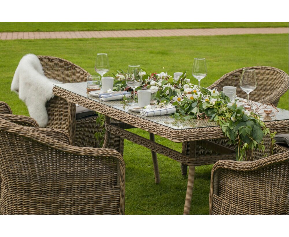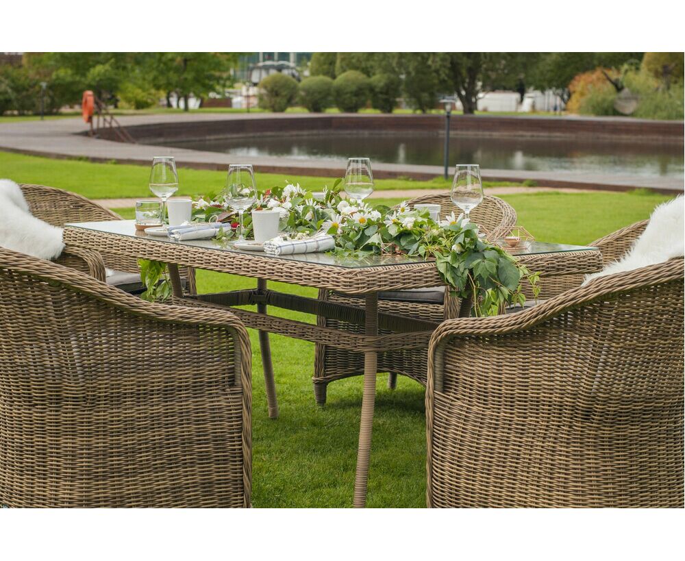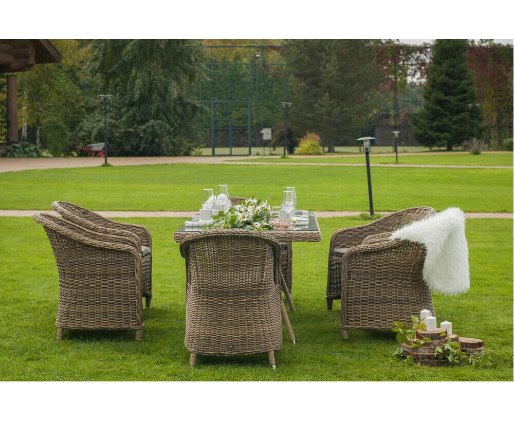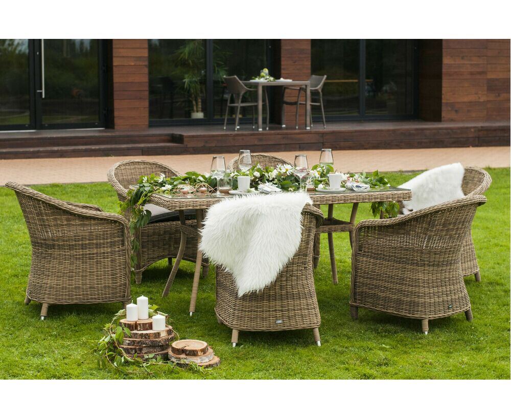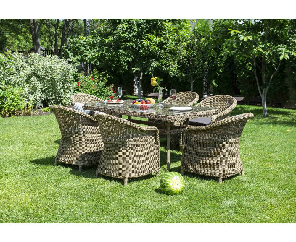 "Латте" плетеный стол из искусственного ротанга 160х90см, цвет соломенный 1шт. 1 600Х900Х750, "Равенна" плетеное кресло из искусственного ротанга, цвет соломенный с серой подушкой 6шт. 570Х680Х810,