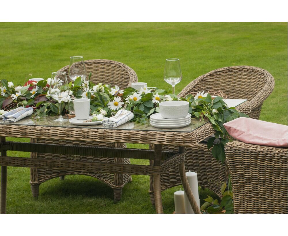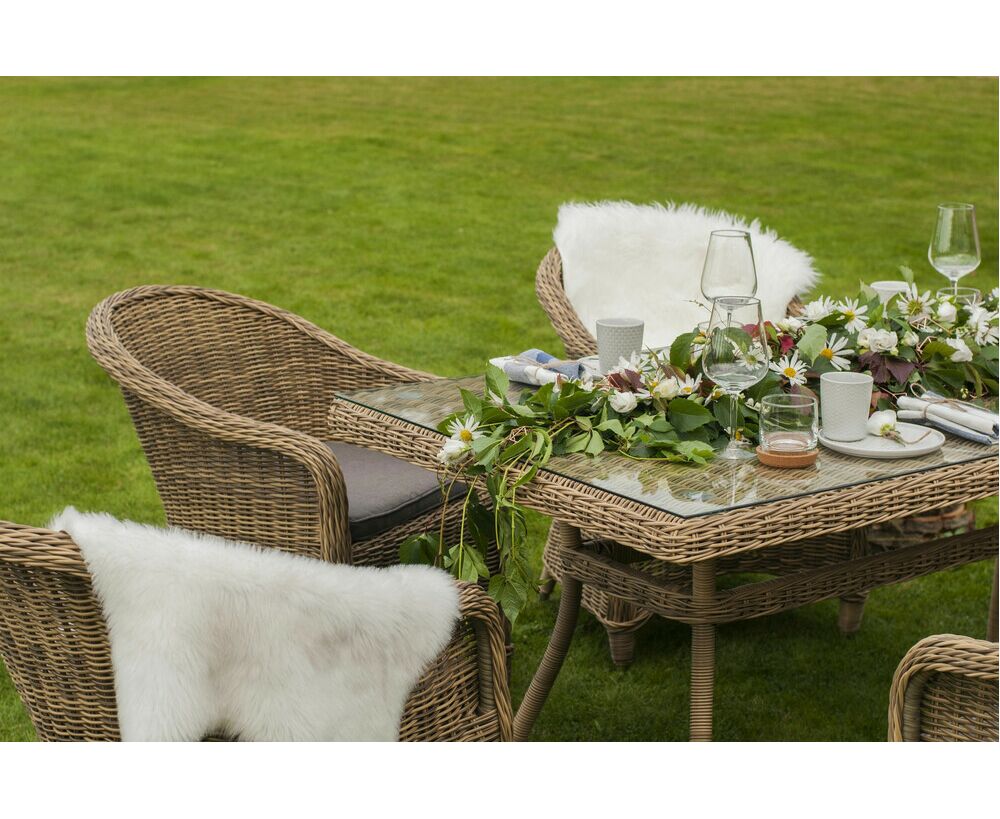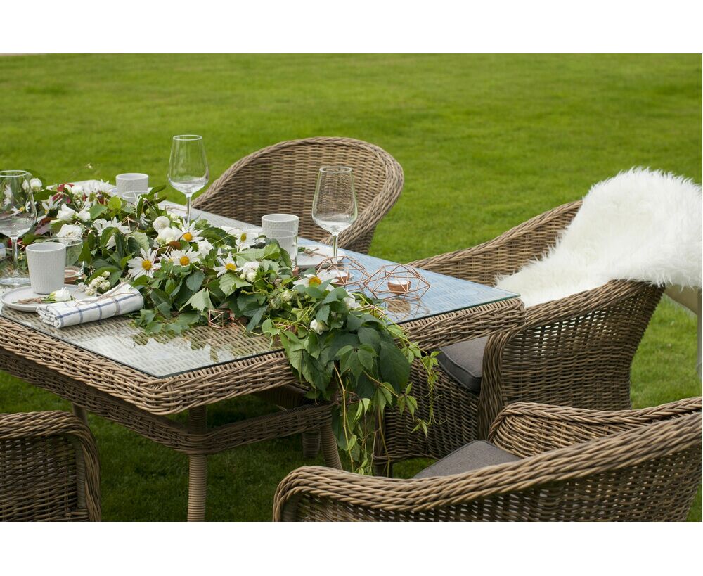 Стеклянная столешница, толщиной 5 мм, идет в комплекте со столом. Подушки на плетеных стулья со съемными чехлами и водоотталкивающей пропиткой.