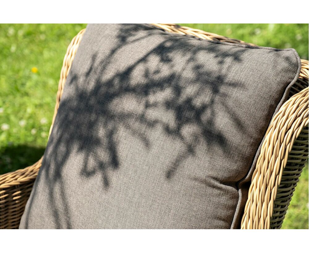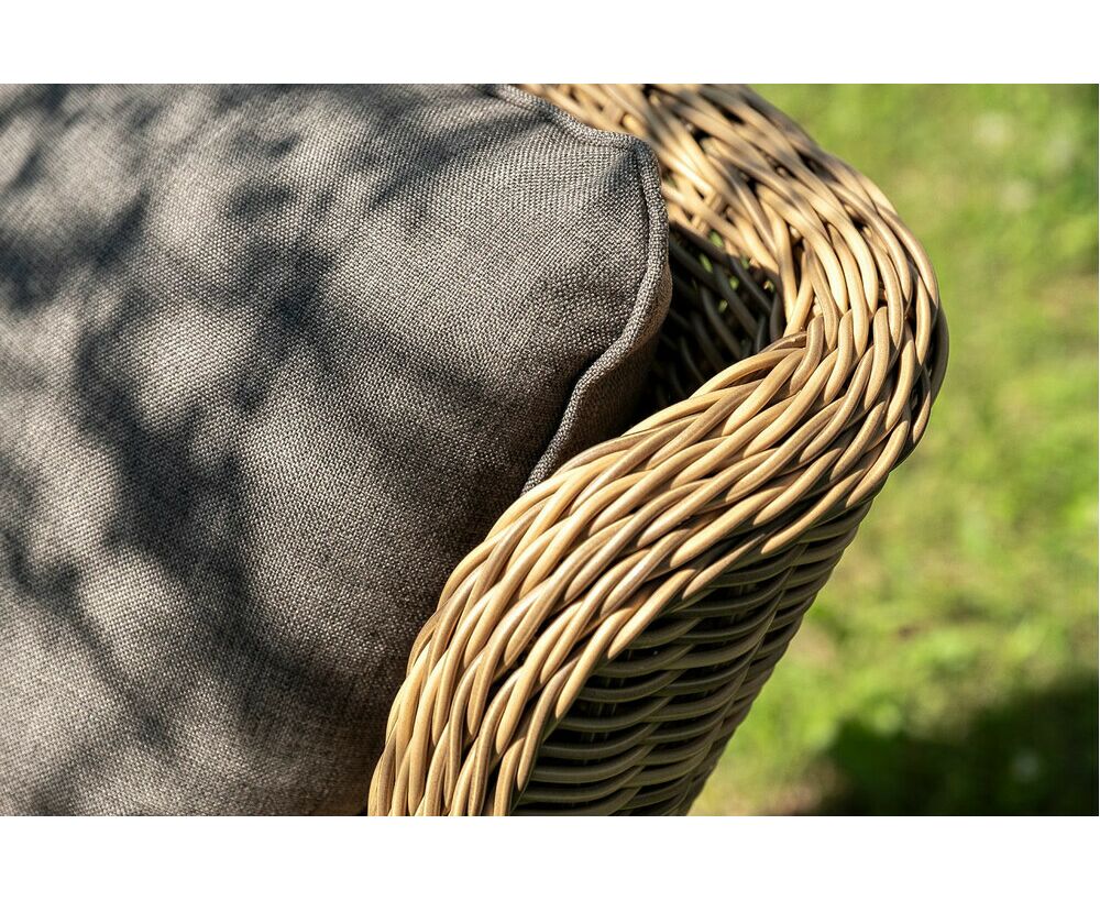 Вся мебель изготовлена из долговечного и легкого алюминия, обтянутого синтетическим ротангом. На столе для удобства эксплуатации предусмотрена столешница из ударопрочного закаленного стекла 5 мм. Стулья укомплектованы подушками на сидениях и на спинках.