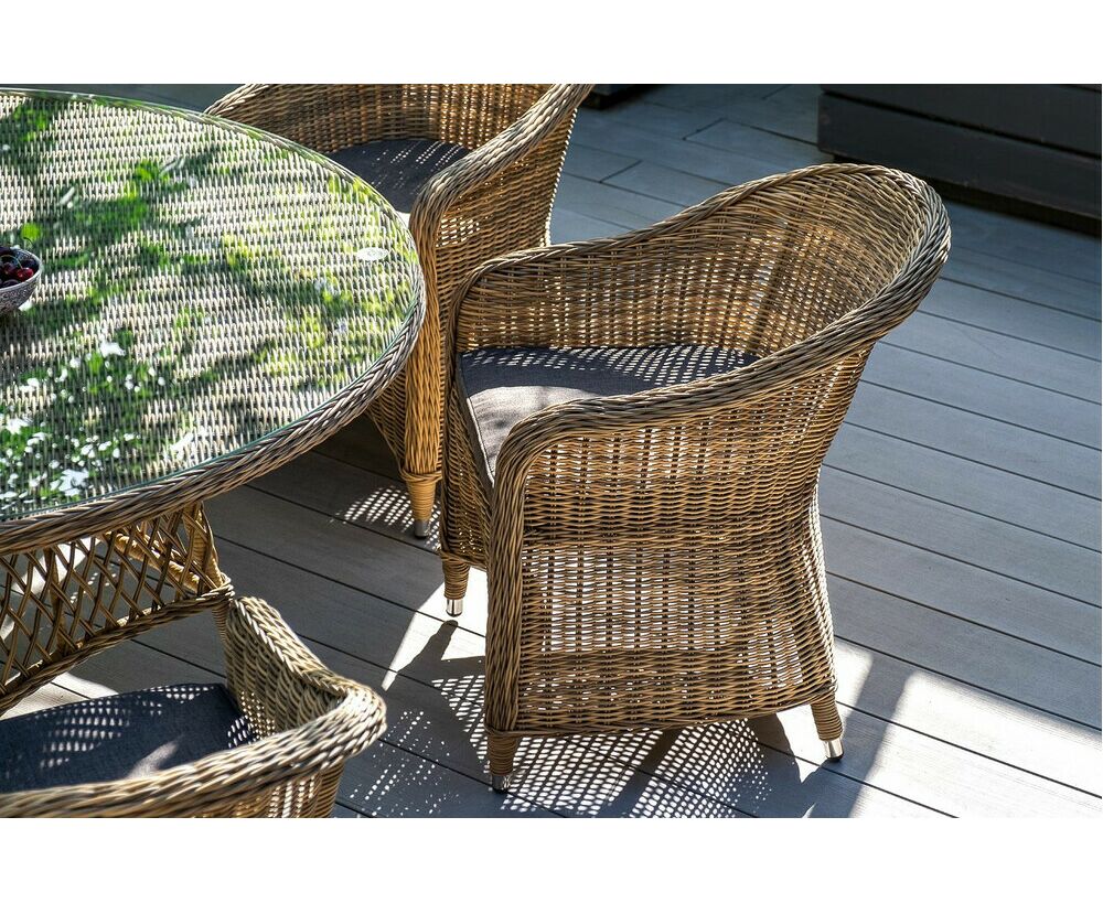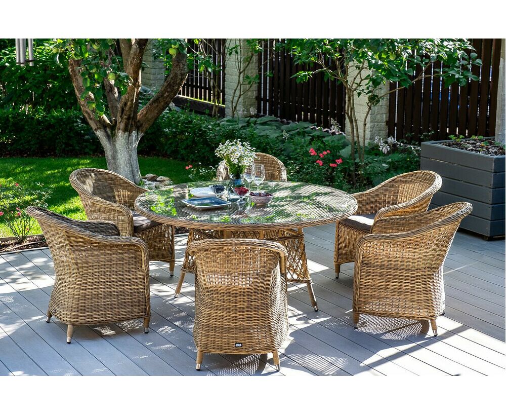 В комплект входит круглый обеденный стол «Эспрессо» (1500×1500×750 мм) с ударопрочной стеклянной столешницей и 6 кресел коллекции «Равенна» 680×570×810 мм. "Эспрессо" плетеный круглый стол, диаметр 150 см, цвет соломенный 1шт. 1 500Х1 500Х750, "Равенна" плетеное кресло из искусственного ротанга, цвет соломенный с серой подушкой 6шт. 570Х680Х810,