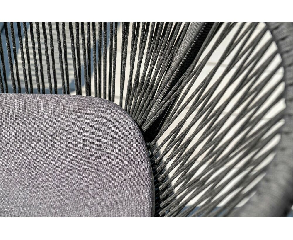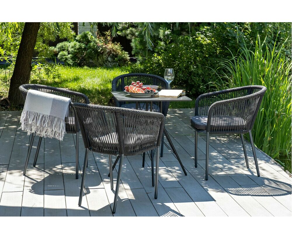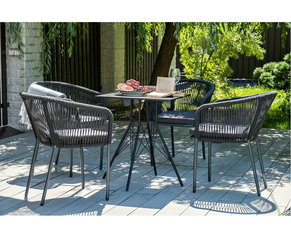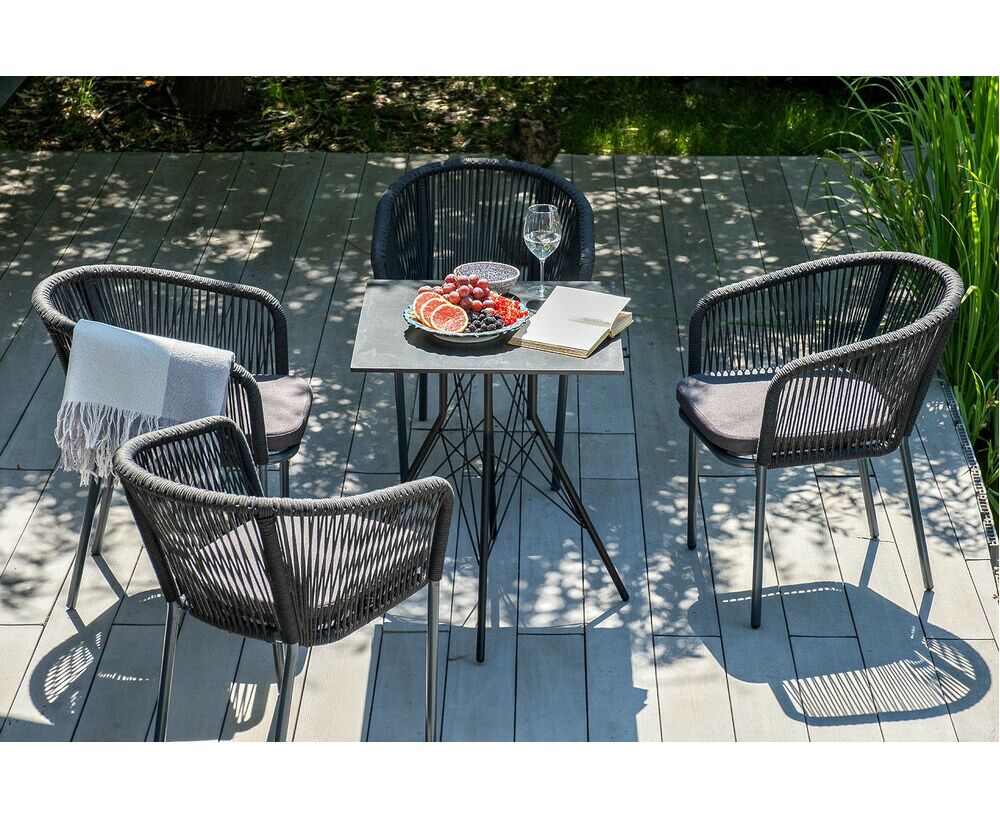 4 кресла из коллекции "Марсель", выполненных из алюминиевого каркаса и ручной оплетки роупом. Это эластичные синтетические ленты из высокопрочных полиэфирных волокон, представлены в темно-сером цвете.