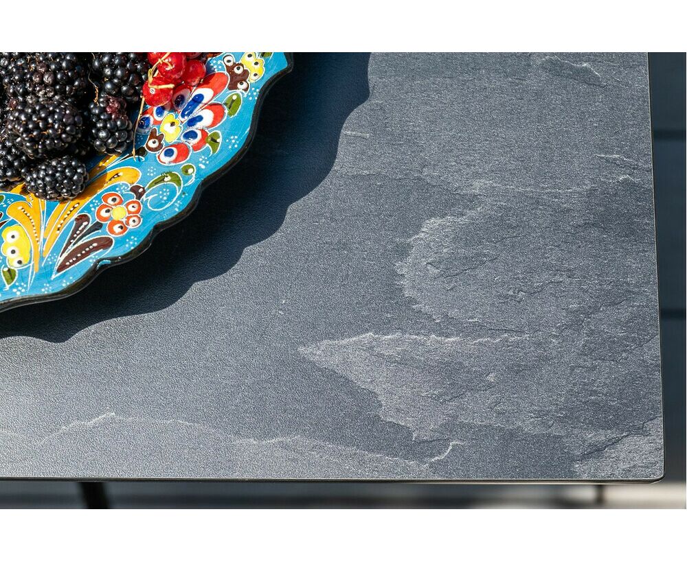 Состоит из квадратного обеденного стола "Конте" со столешницей, размером 70×70 см. Материал столешницы выполнен из высококачественного монолитного компакт-пластика HPL в цвете "серый гранит". Подстолье - нержавеющая сталь черного цвета.