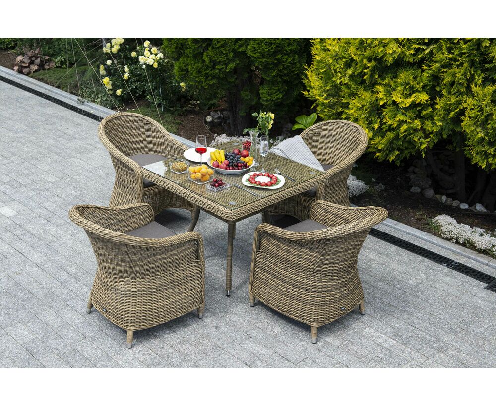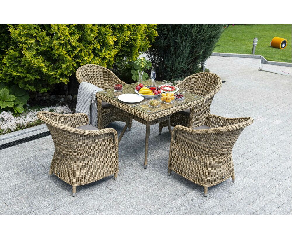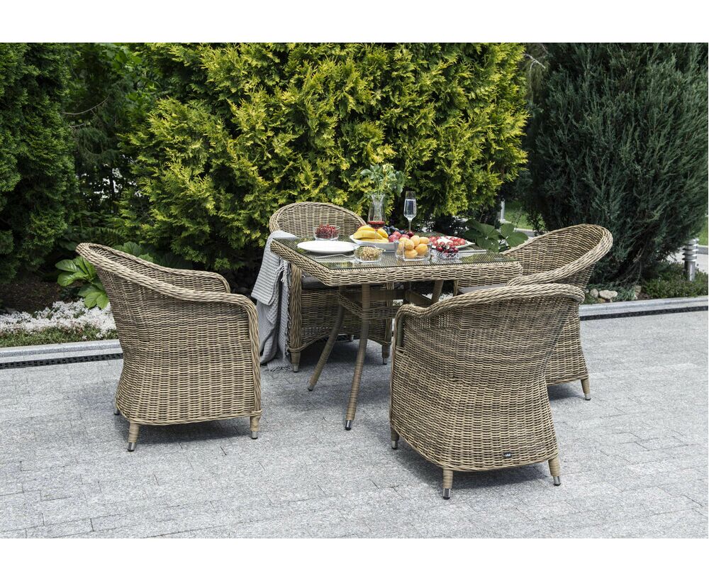 Уличная обеденная группа «Фредо» для обустройства зоны отдыха. Комплект состоит из: квадратного обеденного стола «Айриш» - 900х900х750 мм и 4 кресел «Равенна» - 680×570×810 мм в натуральном соломенном цвете.